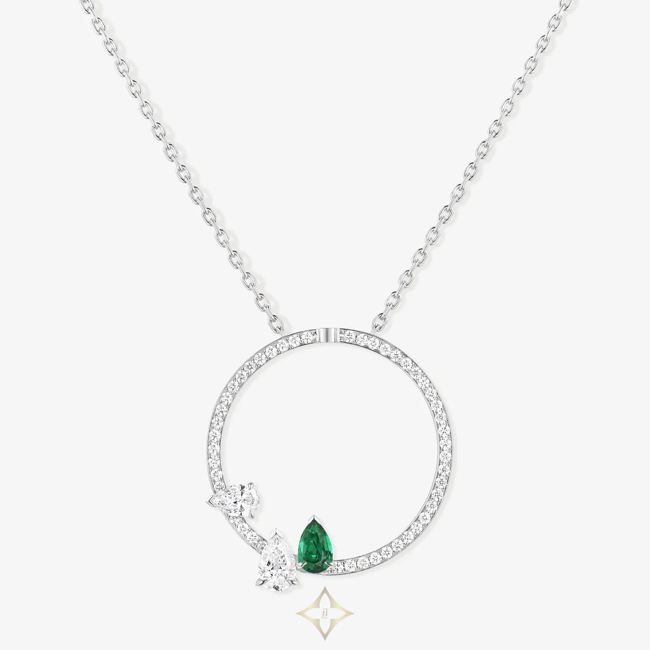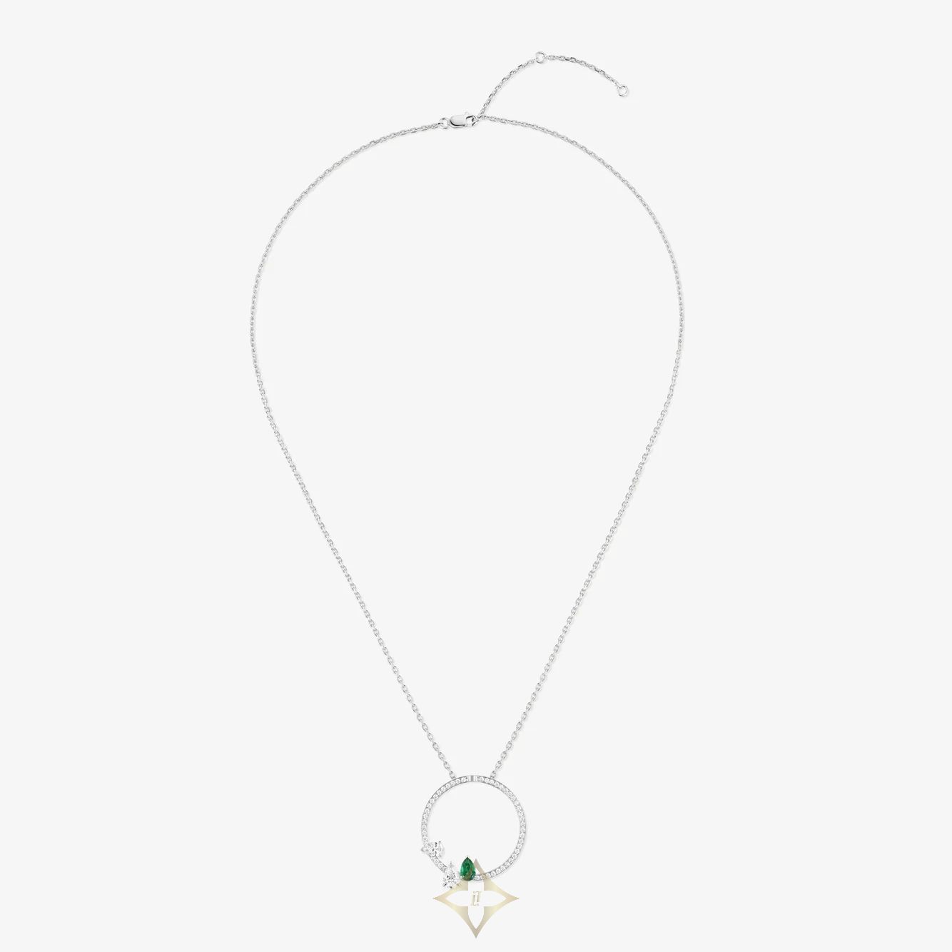 A precious diamond-paved pendant in white gold that adds color to the Serti Sur Vide collection with diamond, emerald and ruby variations, in perfect harmony with the Repossi heritage.