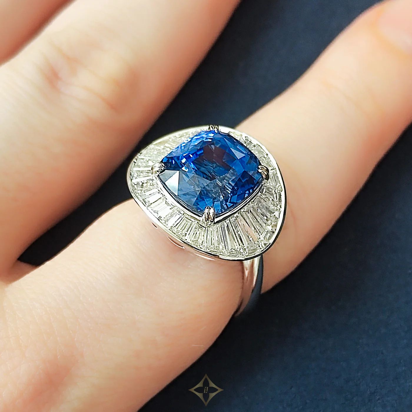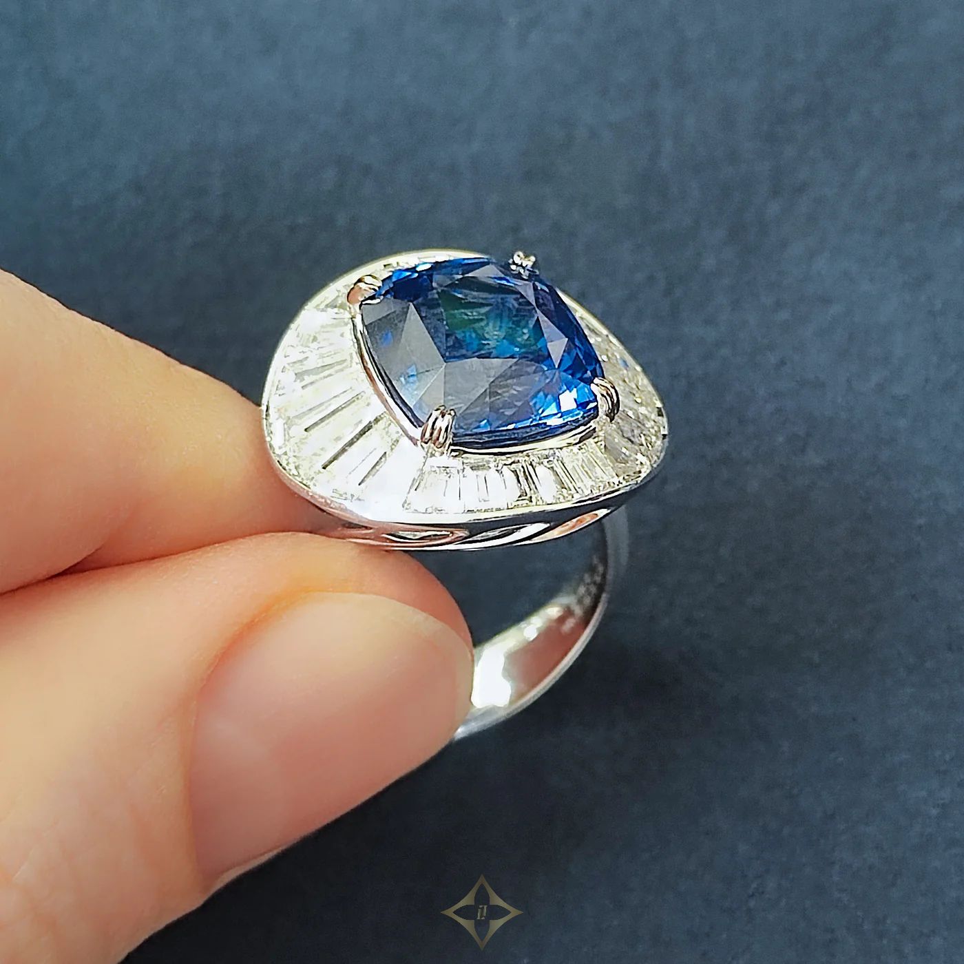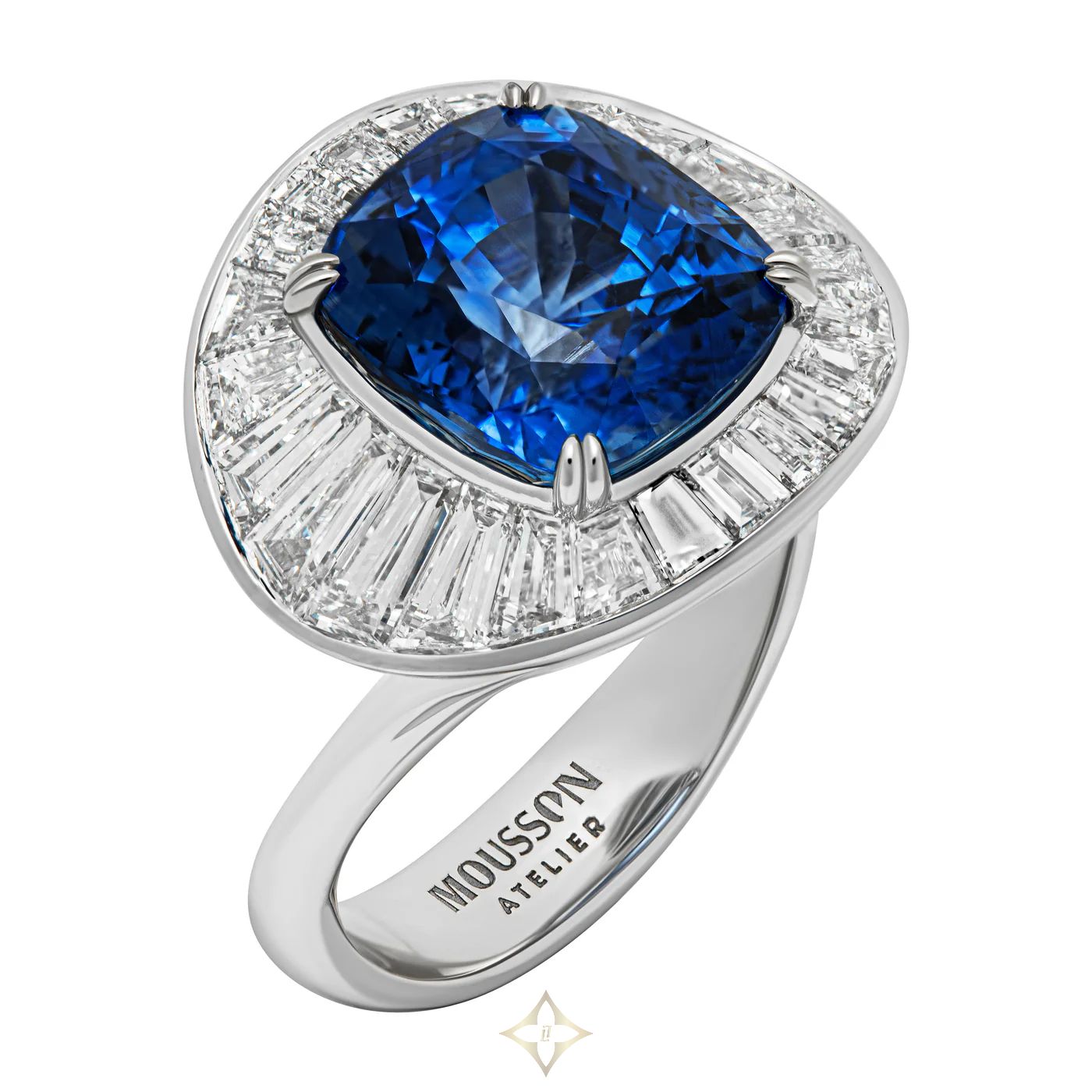 We proudly present our newest addition to the "High Jewelry" Collection. The centerpiece of this exquisite ring is a magnificent SSEF-certified, No Heat cushion-shaped Blue Sapphire. This remarkable gemstone rests elegantly atop a cushion of 24 baguette-shaped Diamonds arranged in a row. The entire composition is delicately secured in 18 Karat White Gold, creating a wonderfully ethereal appearance that seems to float on your finger.