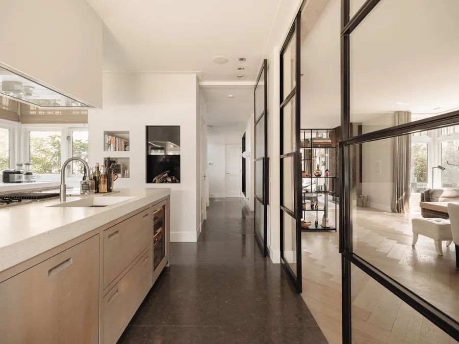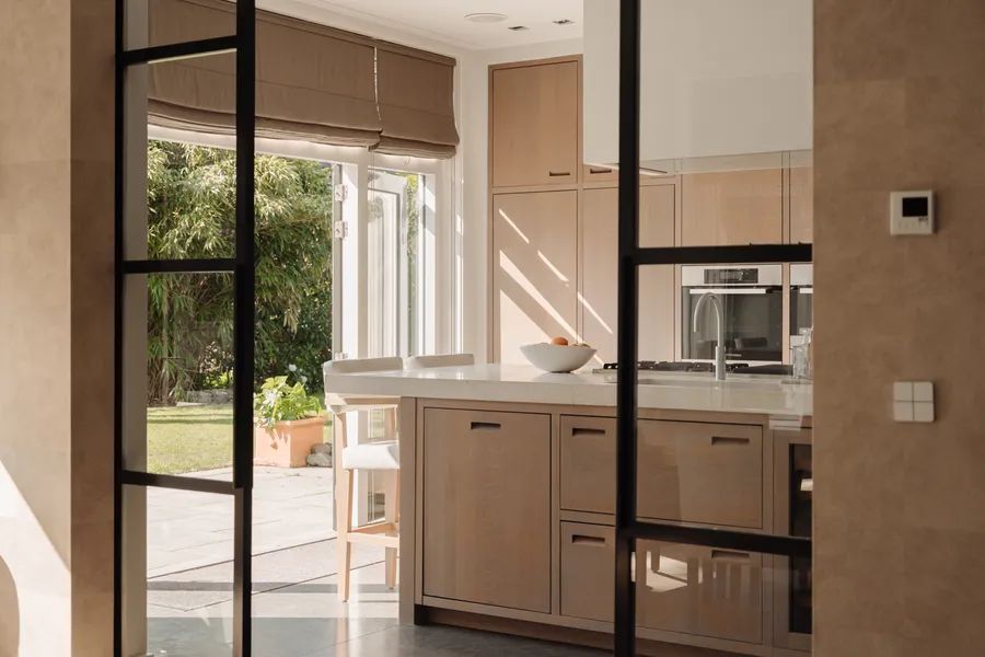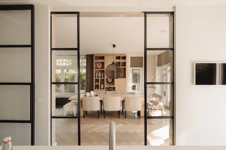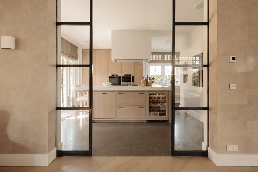 Tall sliding doors of black metal and glass provide a stylish contrast to the light interior. Their clever design allows them to disappear into the wall, giving the option to close off the kitchen from the dining and living areas — or open everything up for a seamless transition.