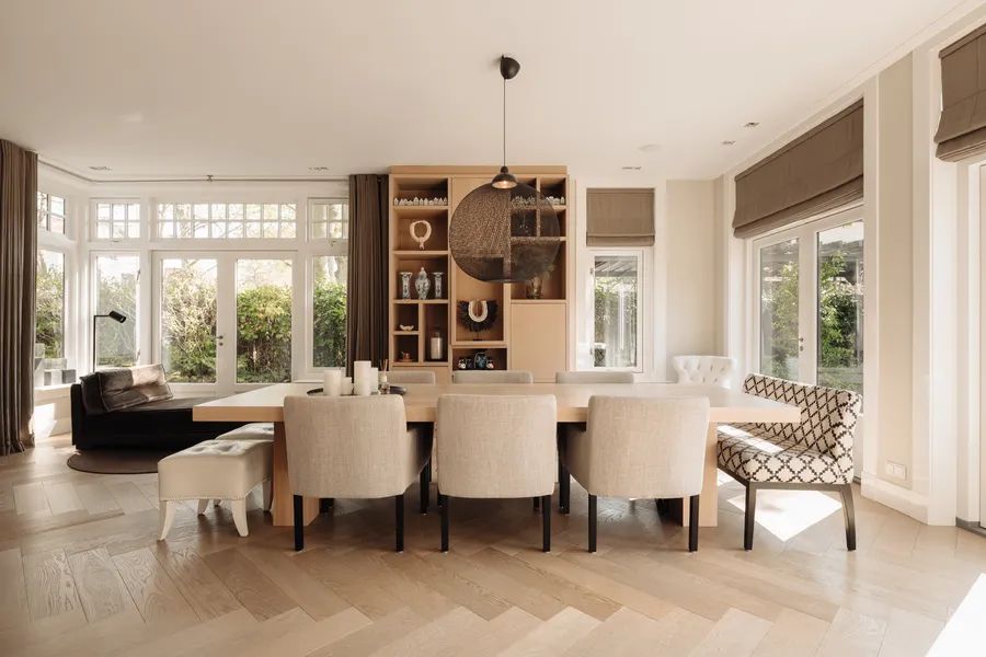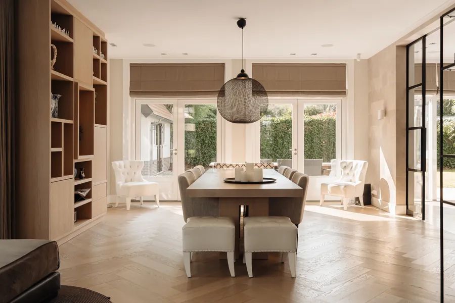 Upon entering, the spacious kitchen-living area immediately stands out — the heart of the home. The light-toned natural stone kitchen island, paired with oak accents, is a real centerpiece and offers plenty of space for cooking and gathering. A climate-controlled wine cabinet, gas fireplace, and bar area add to the warm and inviting ambiance. The light finishes and garden views create an open, welcoming feel. French doors open out onto the terrace and garden, creating a natural flow between indoors and out.
