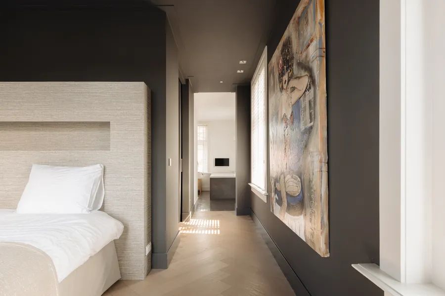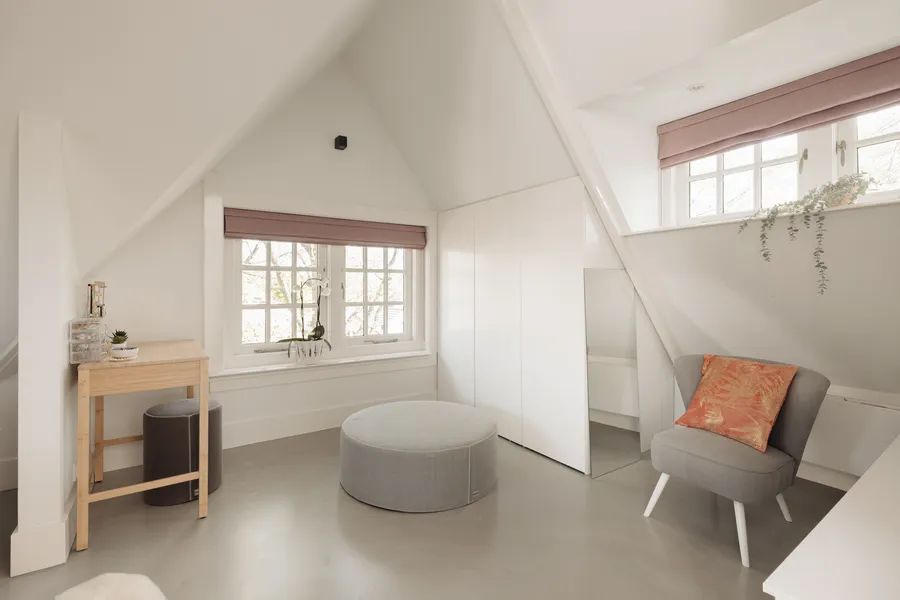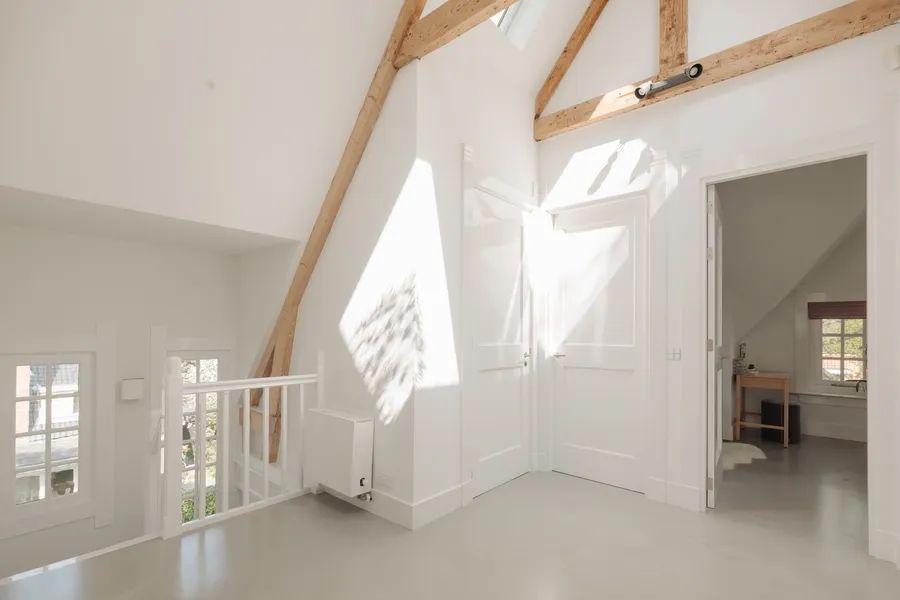 The staircase is a true eye-catcher: tall windows flood the space with light, and the original exposed wooden beams overhead immediately draw the eye. Raw and authentic, they offer a powerful contrast to the rest of the refined interior.