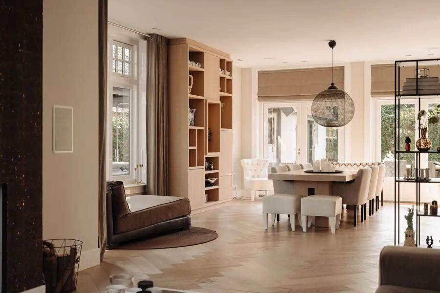 A luxurious herringbone floor made of high-quality wood in a light oak finish lends an elegant touch to the living room. French doors invite you to enjoy long, atmospheric dinners — both indoors and out.