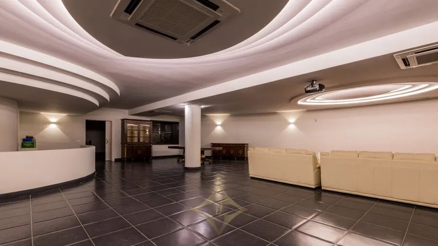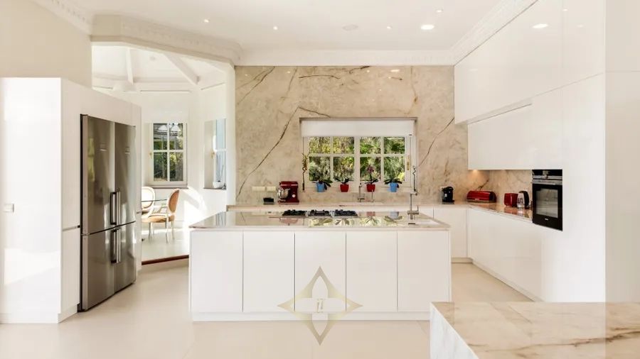 The ground floor of this magnificent villa is a haven of leisure and entertainment. Here, you’ll find a dance floor, a private cinema, a relaxation area with panoramic windows overlooking a stunning koi pond, a private bar, a well-equipped gymnasium, and a sauna. The ground floor also includes a living room, a fully equipped air-conditioned wine cellar, a spacious studio with direct access to the garden, a four-car garage, and a separate flat with its own entrance. The open plan kitchen with an island and breakfast area is bathed in natural light, thanks to the large windows throughout the space.