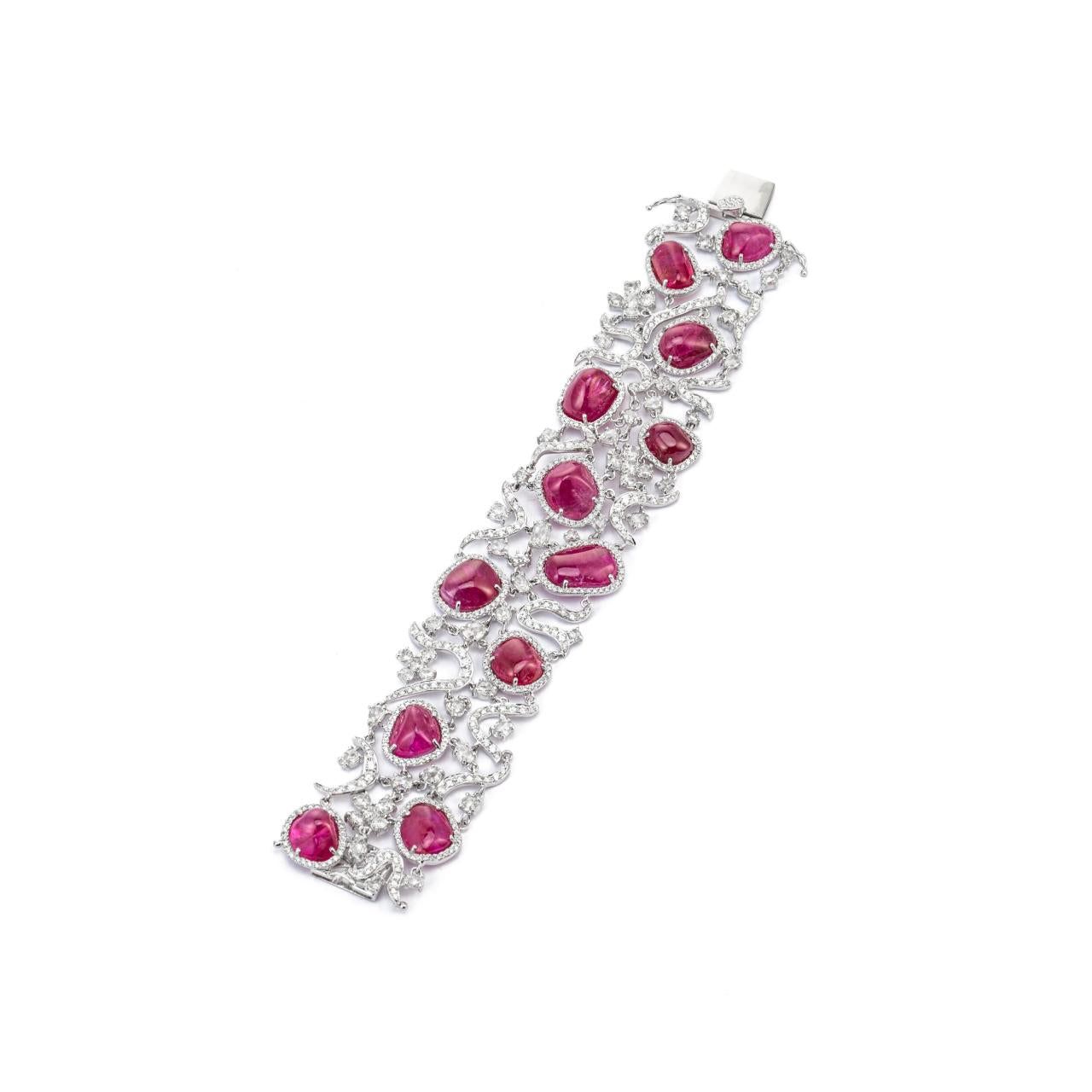 This exceptional bracelet features rare no-heat Burmese rubies, elegantly set among rose-cut and round-cut diamonds in a refined white gold design. The intricate, lace-like craftsmanship enhances the rubies' deep hue, creating a mesmerizing balance of brilliance, rarity, and timeless sophistication. GRS certified.