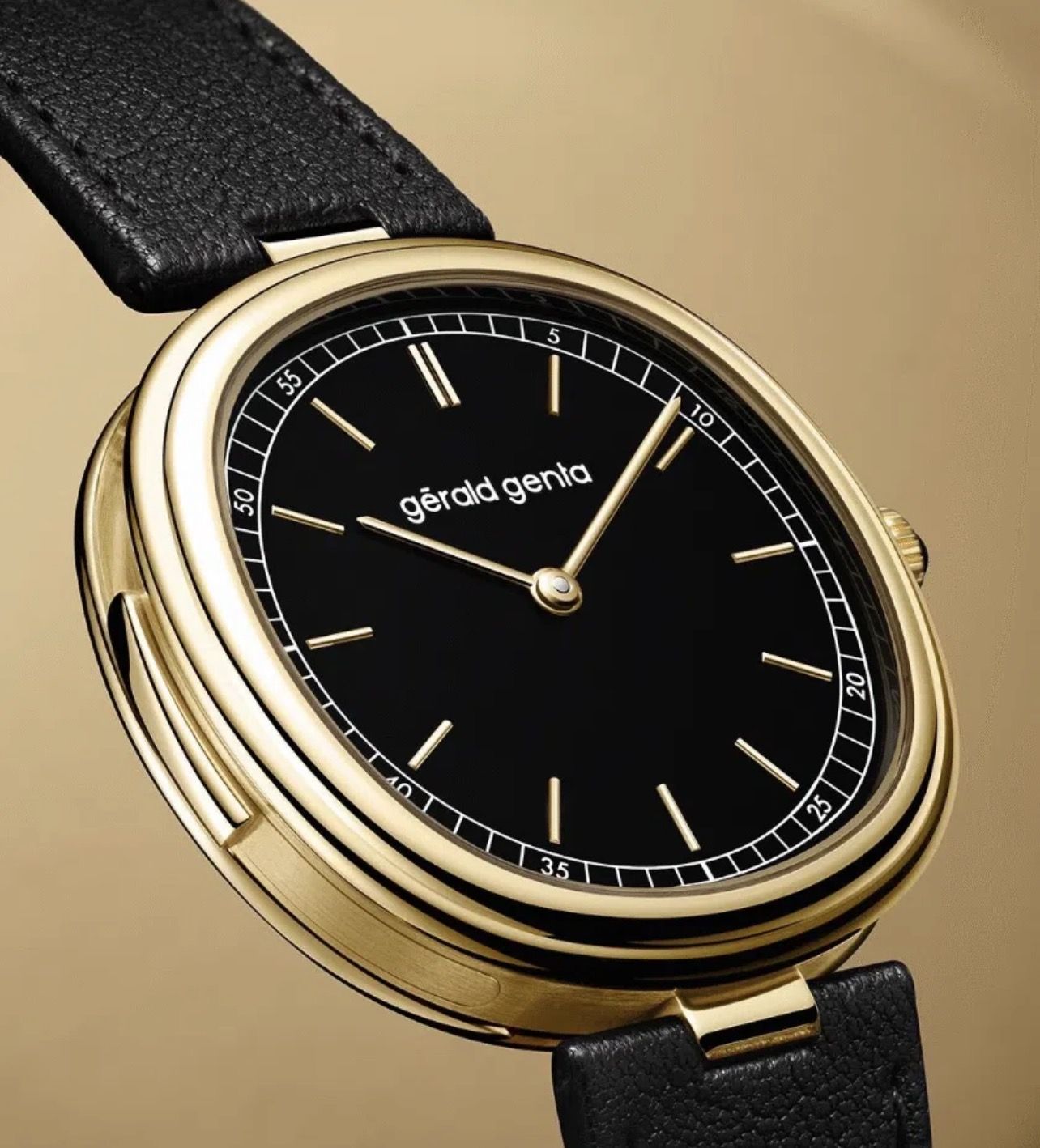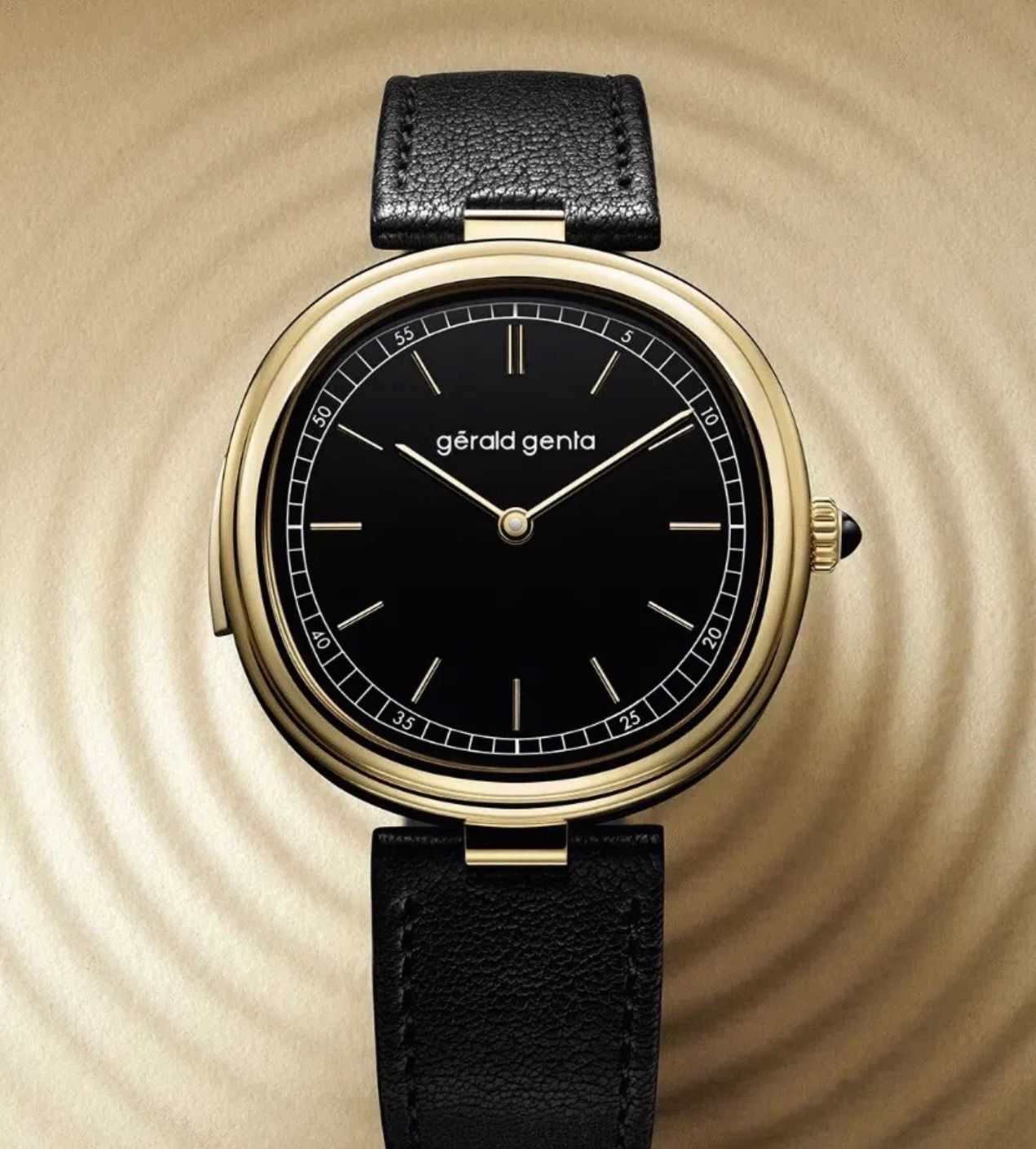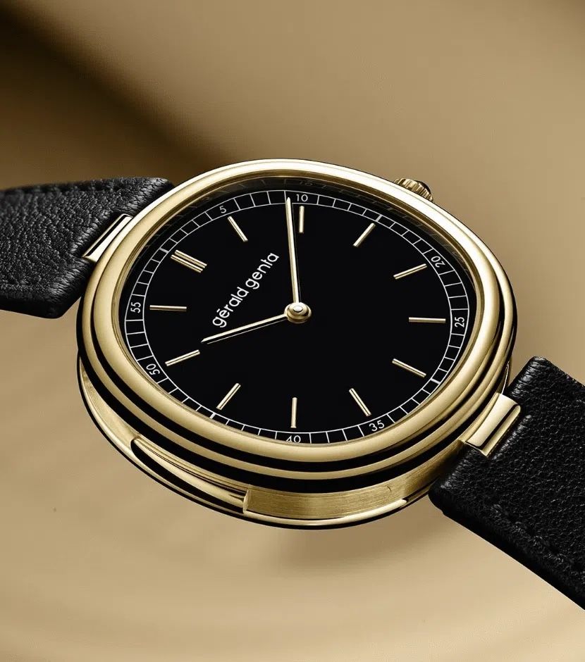 The hypnotic, pure deep black onyx dial expresses the aesthetic DNA of Gérald Genta. The yellow gold hour markers and hands stand out elegantly, while the subtly off-center minute track plays with perception: round or cushion-shaped? A visual illusion that recalls the creative audacity of the founder.