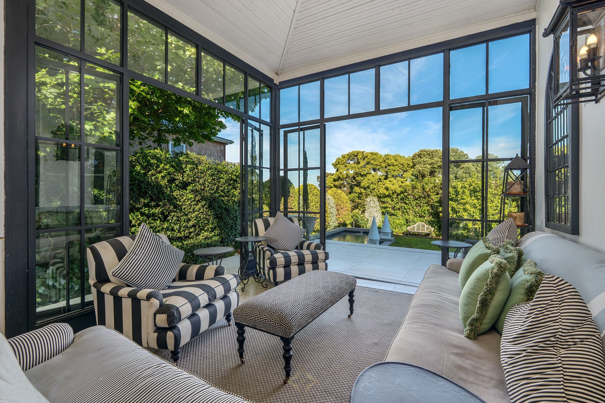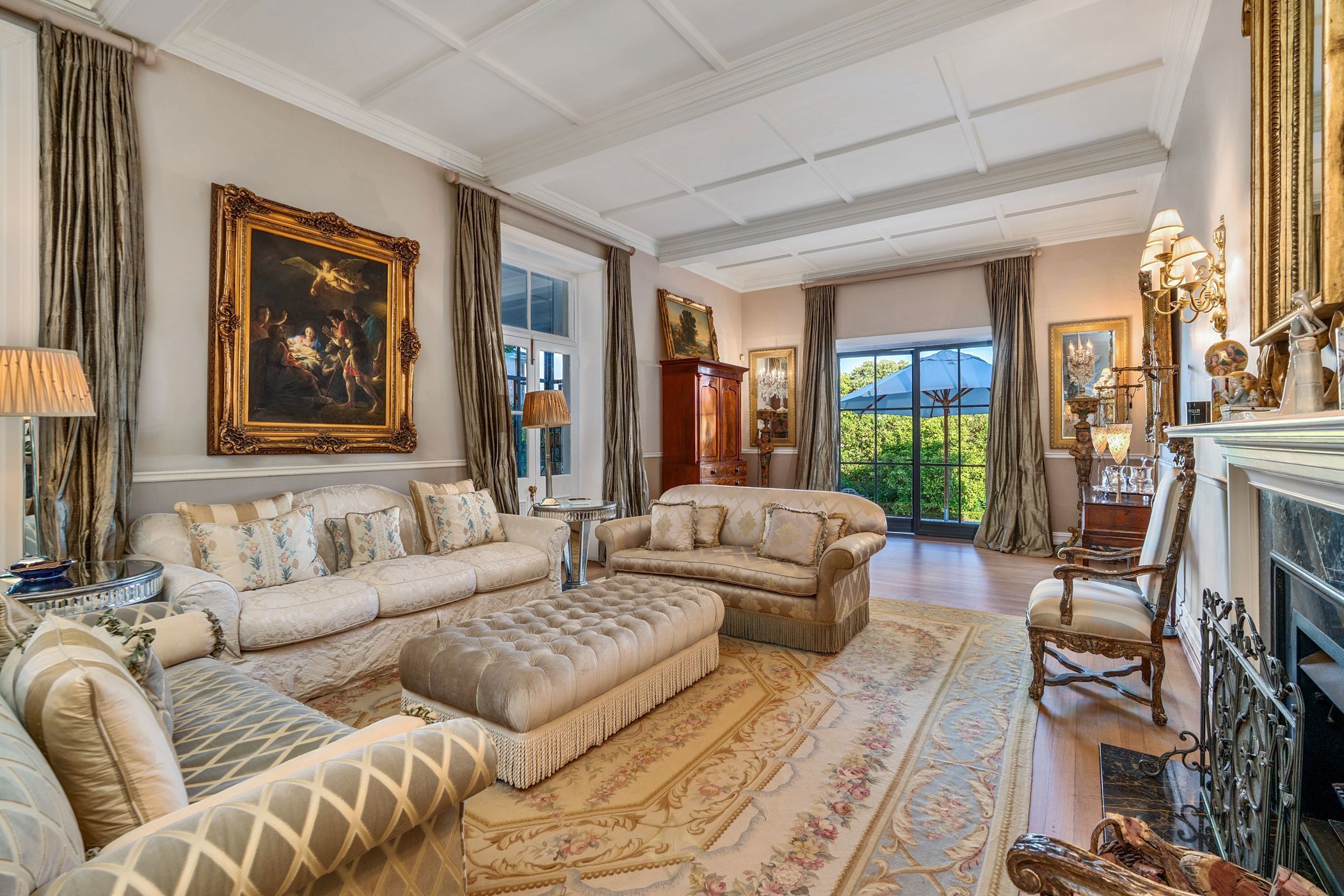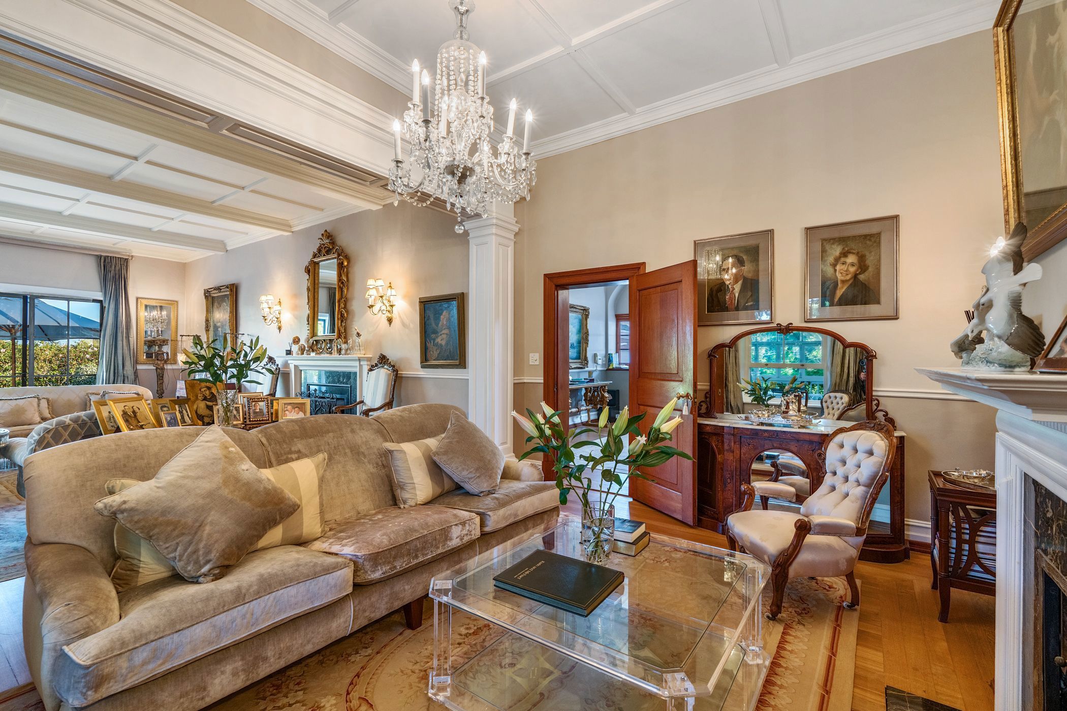The formal lounge features two Victorian fireplaces and opens onto a partially glass-enclosed patio overlooking the landscaped garden and saltwater pool. The dining room, complete with French doors, connects seamlessly to the patio—perfect for both relaxed and formal gatherings. The home also includes a carpeted family room, a well-equipped kitchen with quality appliances, and a paved courtyard shaded by mature trees.