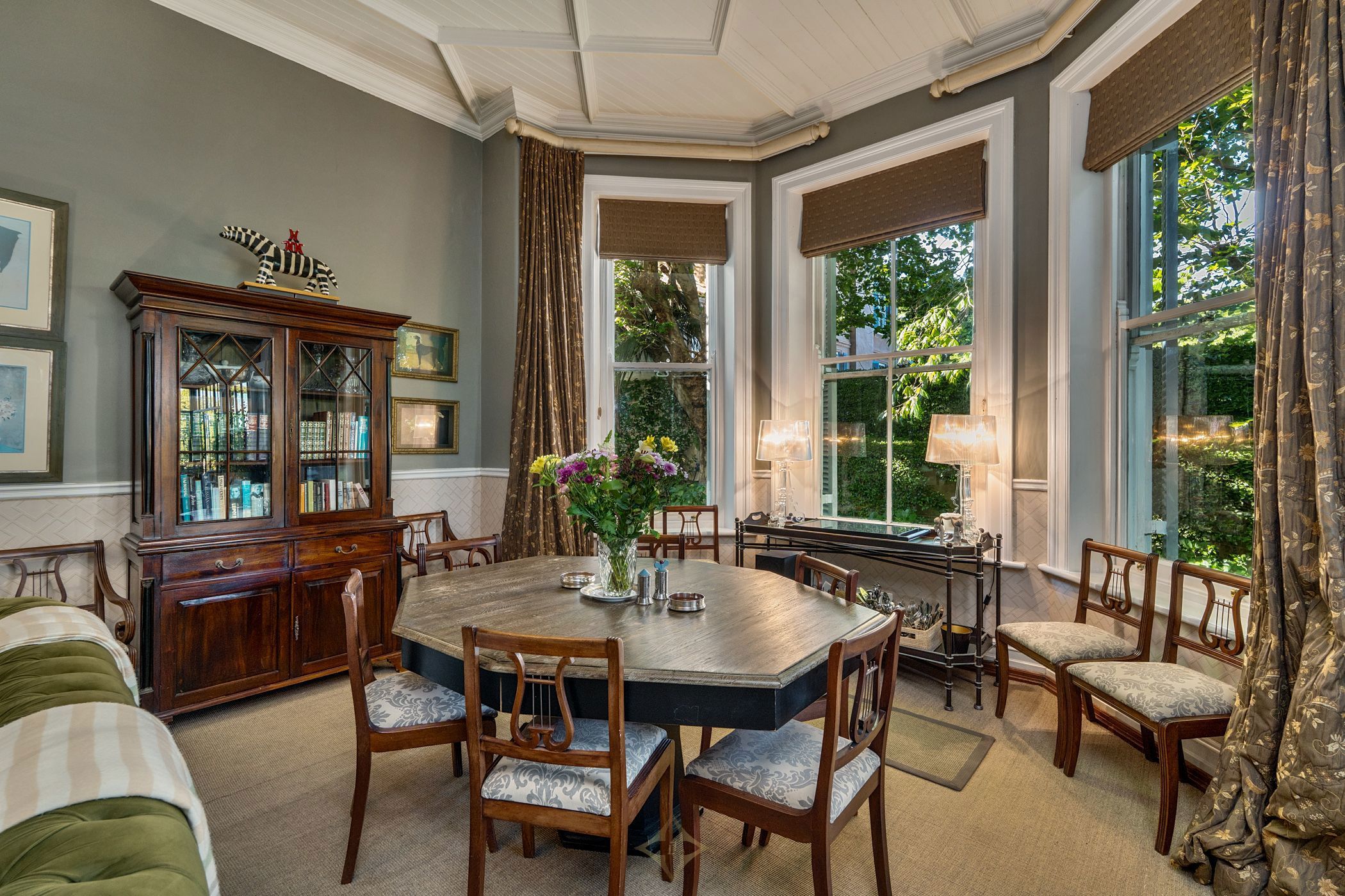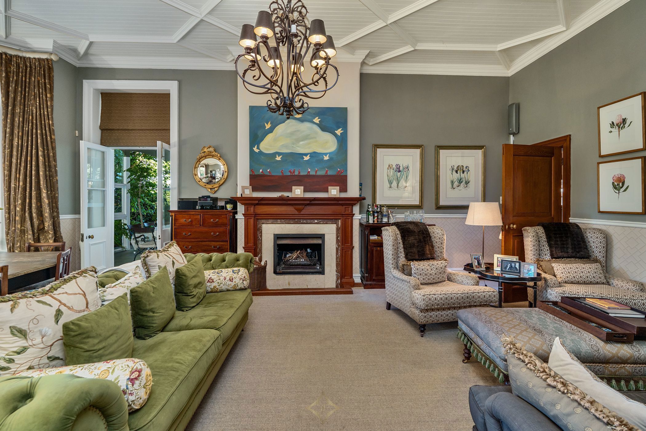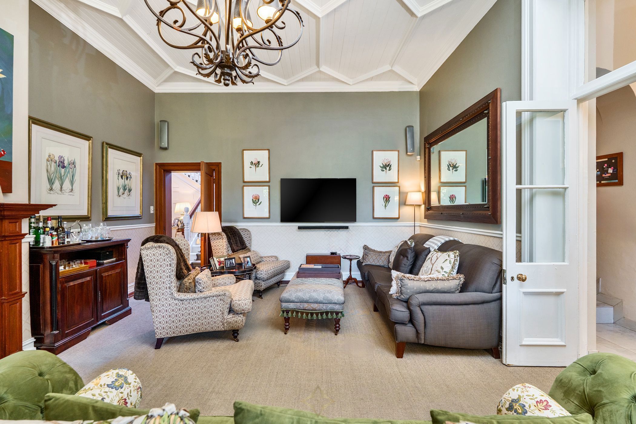 Owned and carefully maintained by the same family for more than twenty years, this home combines period character with comfortable living. Inside, original teak floors, sash windows with shutters, and solid wooden doors with brass fittings speak to the home's heritage. High, painted ceilings, chandeliers, and a double-volume entrance with a brass chandelier create an atmosphere of quiet elegance.