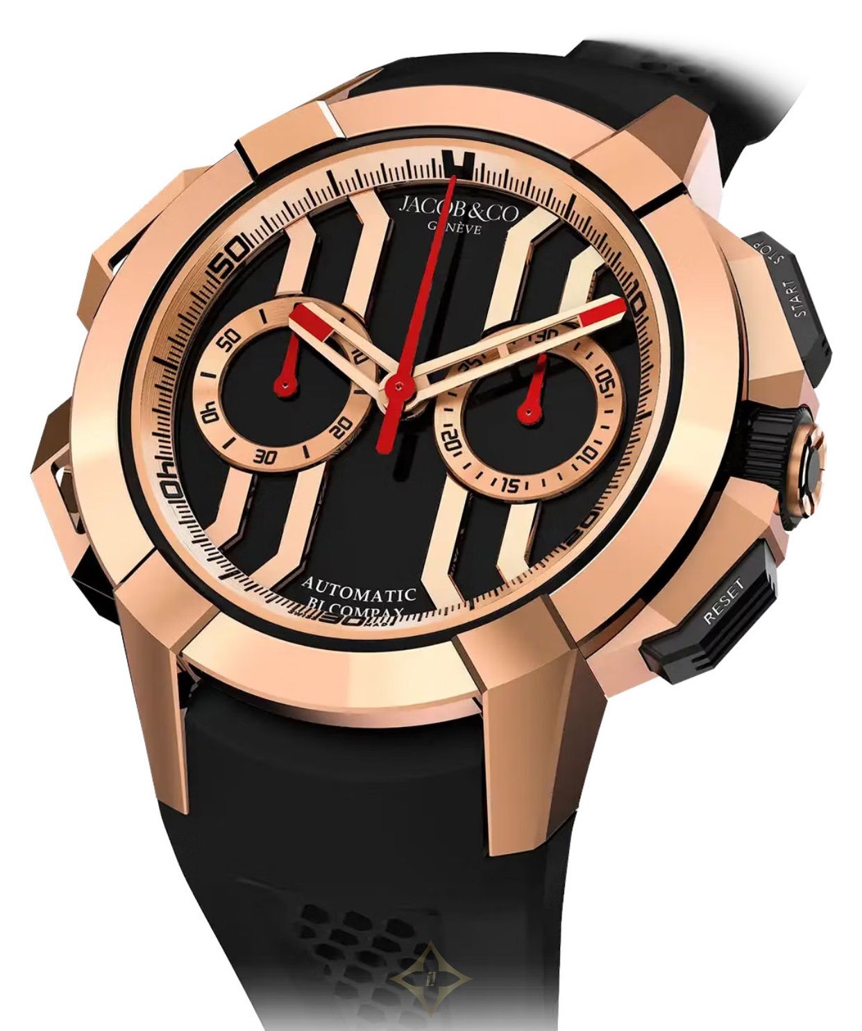 Following up on the enduring appeal of the 47-mm versions, Jacob & Co. went on to create a 44-mm Epic X Chrono. This alternative case size opens up the Epic X Chrono to a new crowd, seduced by Jacob & Co.'s unique design features in a universally wearable, definitely unisex format. The inspiration of the design came from the letter X which symbolizes something unknown, mysterious and appealing which was the energy of the brand at the time. Epic X Chrono 44MM is the high function of Epic X with an extra dose of elegance. A natural step in the complication and design direction, Epic X Chrono 44MM retains all the core elements of its namesake collection, and takes them all one level higher. A level that the chronograph perfectly represents. The crown guards, the pusher protectors, the X shape that runs from the lugs through the dial, the skeleton parts, they all embody the transformation of Epic X into a sports chronograph with a sense of material exclusivity and a refined state of mind.