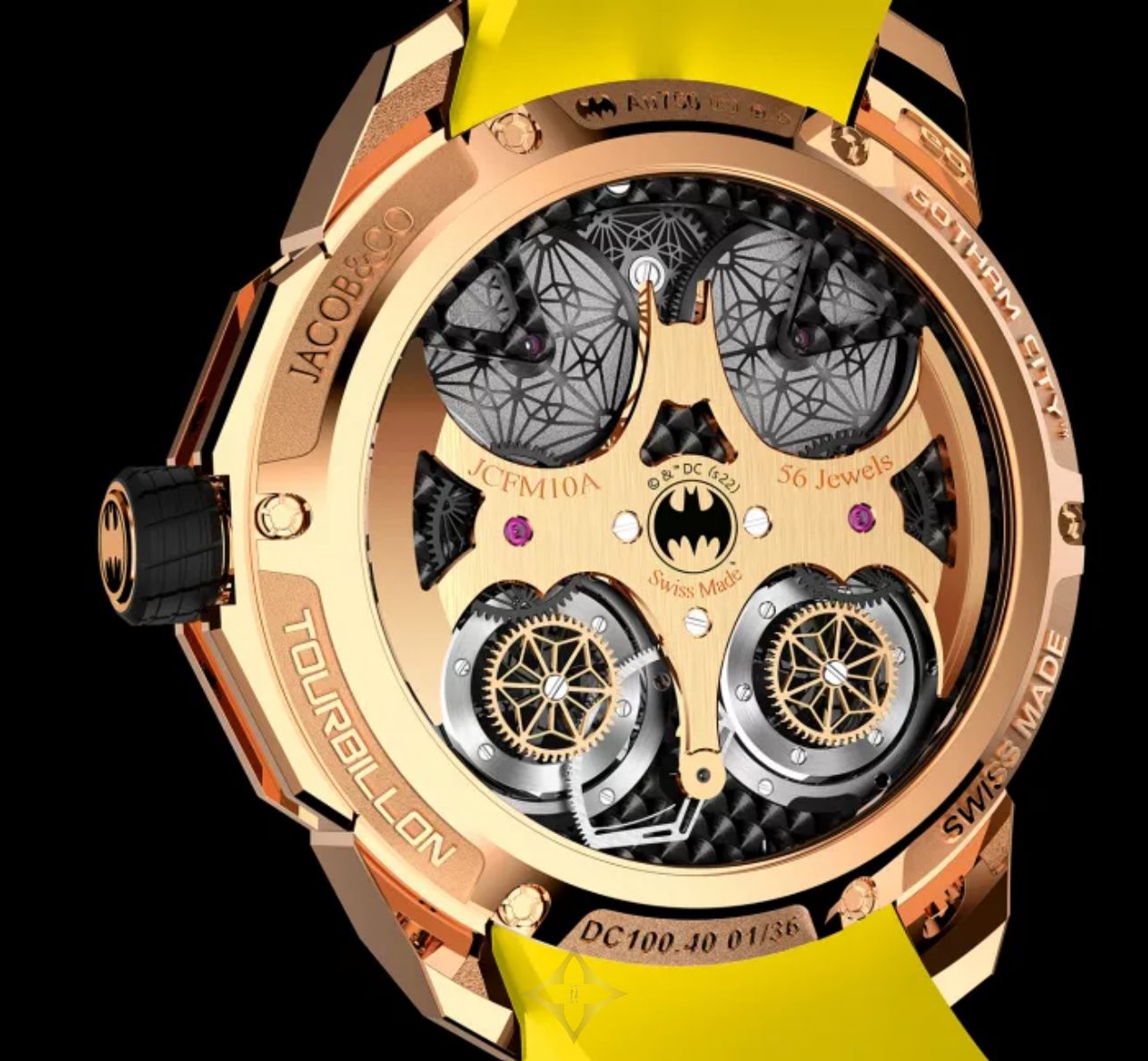 Calibre JCFM10 features off-centered hours and minutes, a power reserve topping out at 48 hours and is regulated by twin, flying, sequential, triple-axis tourbillons located at 5 and 7 o’clock. Its highly advanced technical nature is on par with the technological array of tools, devices, machines and equipment Batman has at his disposal.