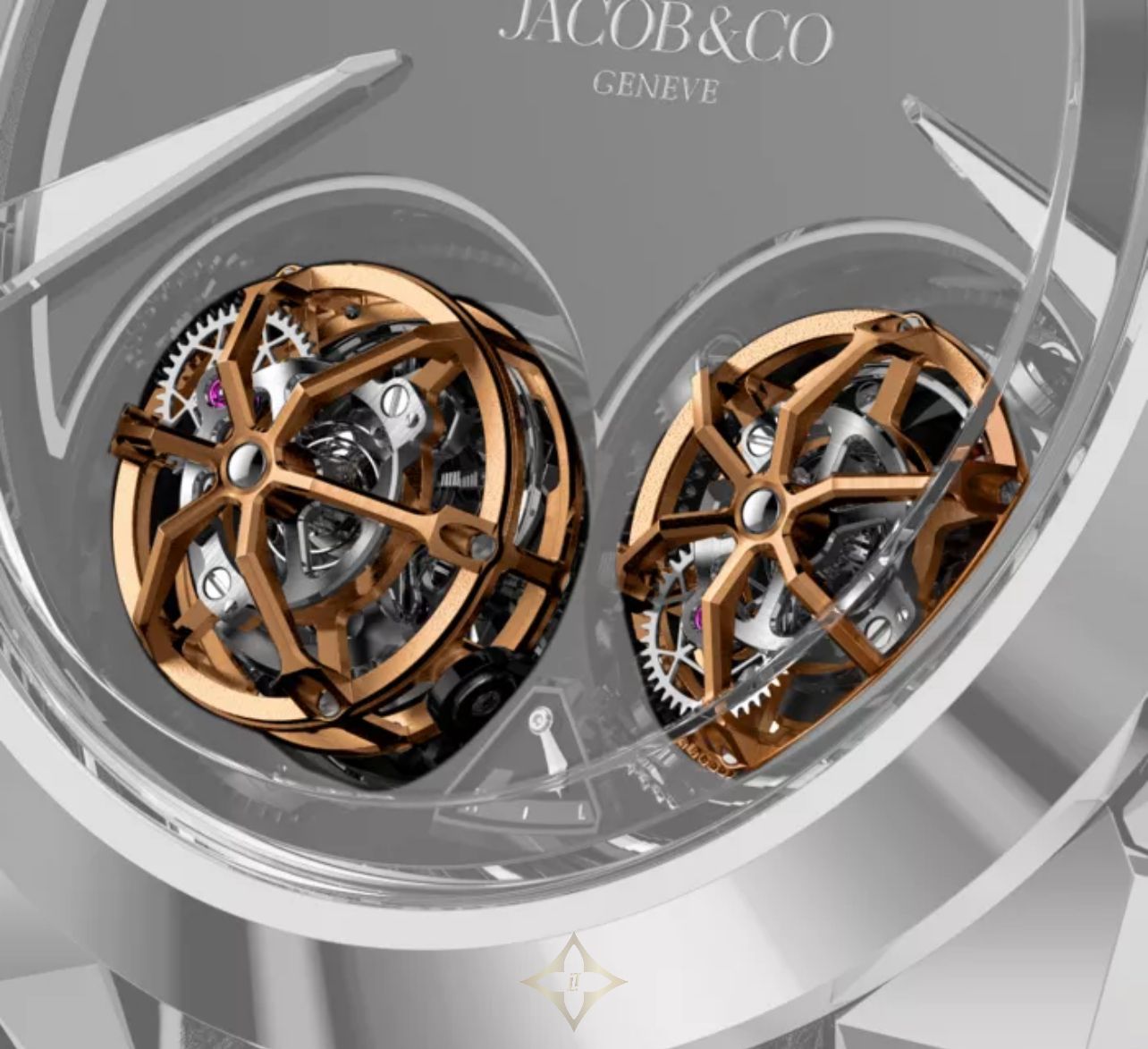 Caliber: Hand-Winding, Jacob&Co JCFM10, Twin Flying Triple-Axis Tourbillons at 5 and 7 o'clock.