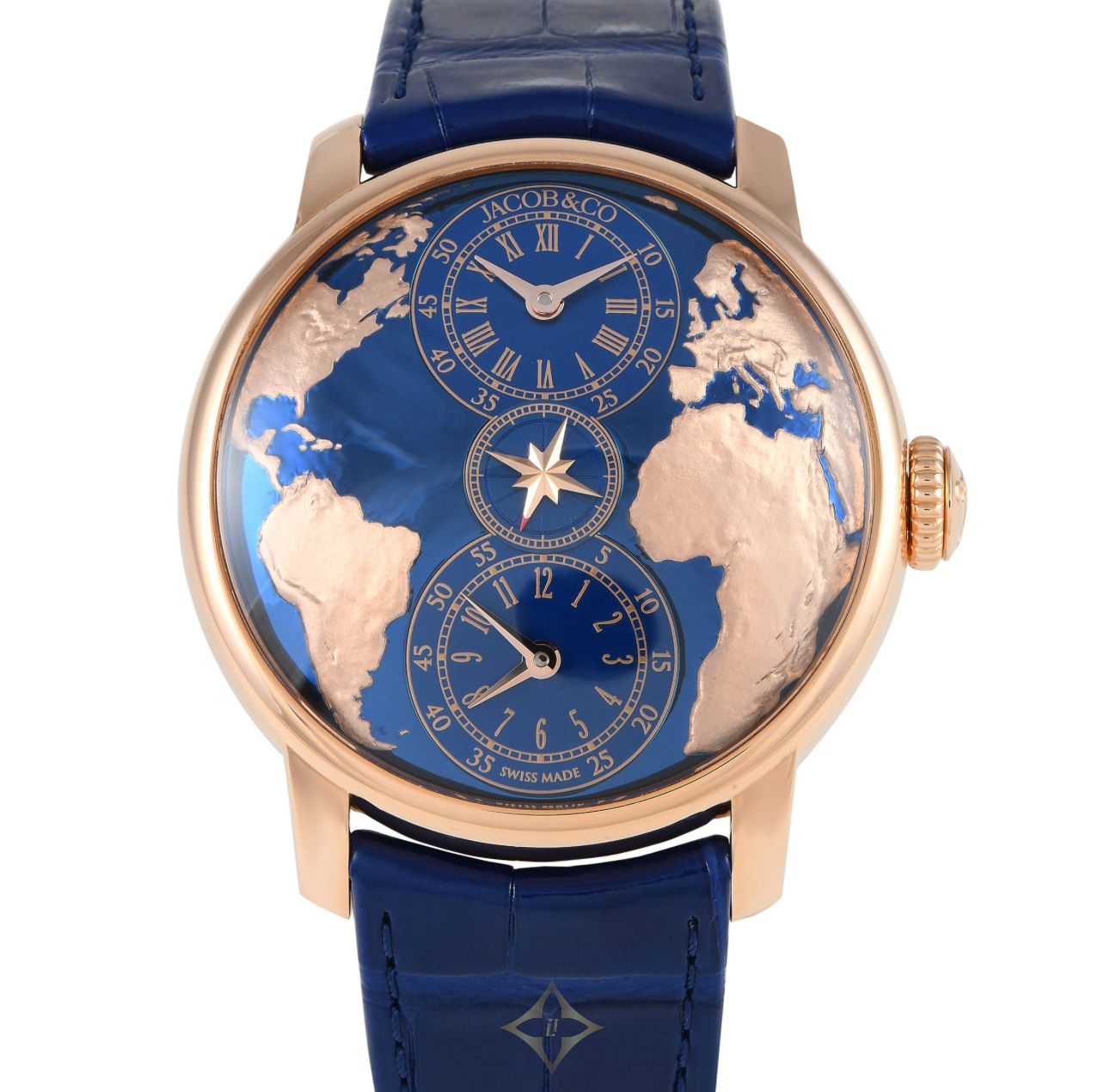 A traveler’s watch that brings the world to your wrist. This timepiece from Jacob & Co. features a rounded case with a domed dial and sapphire crystal, emulating the planet’s shape. It has an incredibly alluring 3D dial in lacquered blue and decorated with highly detailed continents in rose gold, offering a sky view of the western hemisphere. Present on the dial are two sub-dials for two time zones; both sub-dials can be set separately. Right at the center of the dial is a small seconds hand in the shape of a wind rose. Powering the watch is caliber JCAA11 self-winding movement with 206 components and a 42-hour power reserve. This individually numbered model was released in limited edition of only 999 pieces.