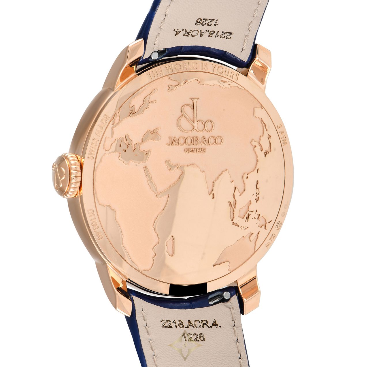 This unworn Jacob & Co The World is Yours Dual Time Zone Watch DT100.40.AA.AE.A is accompanied by papers, a watch case, and the manufacturer’s box.