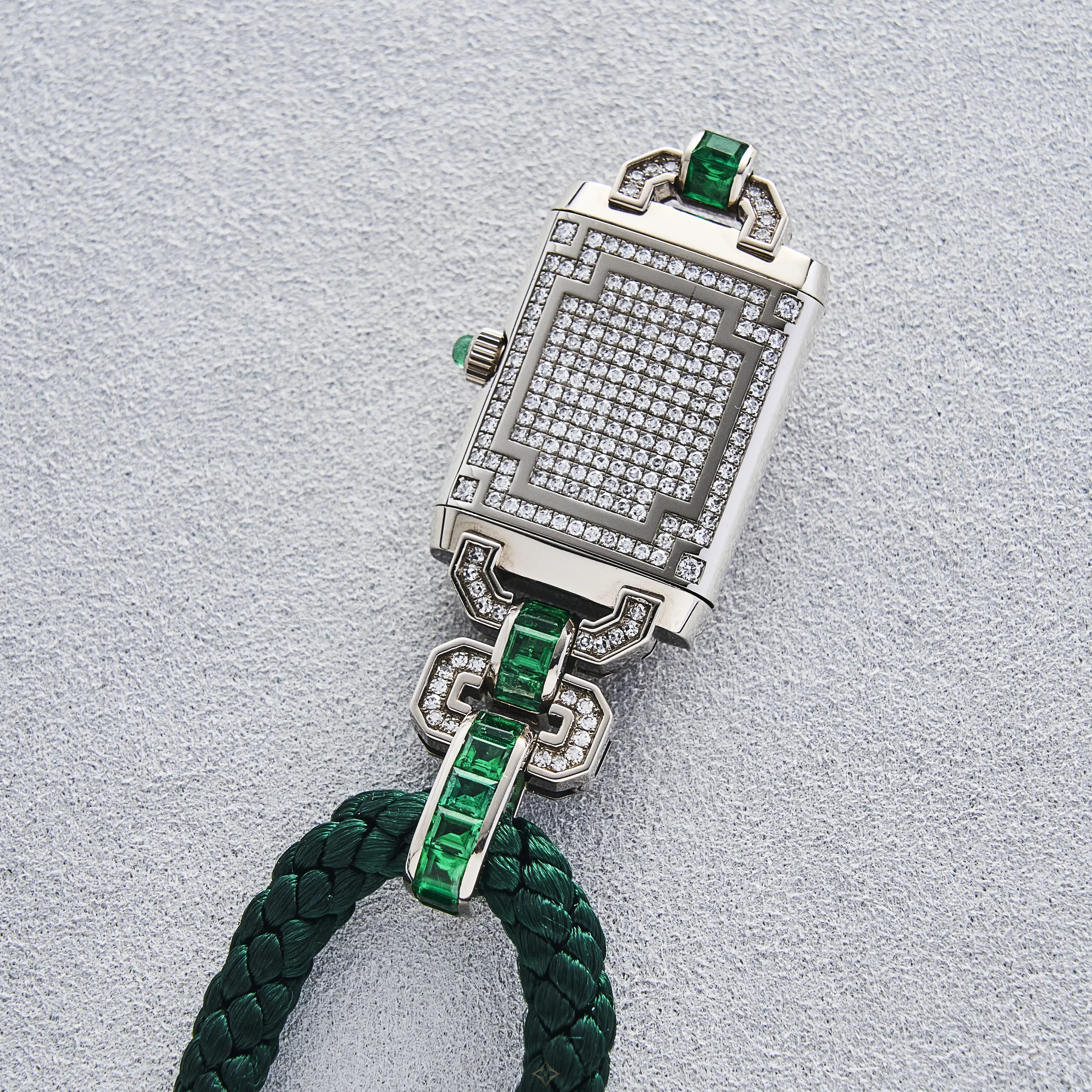 White gold (18-carat), diamond-set and emerald-set, quartz, vertical rectangular-shaped, reversible “Art Deco”-style double-faced lady’s necklace-watch.