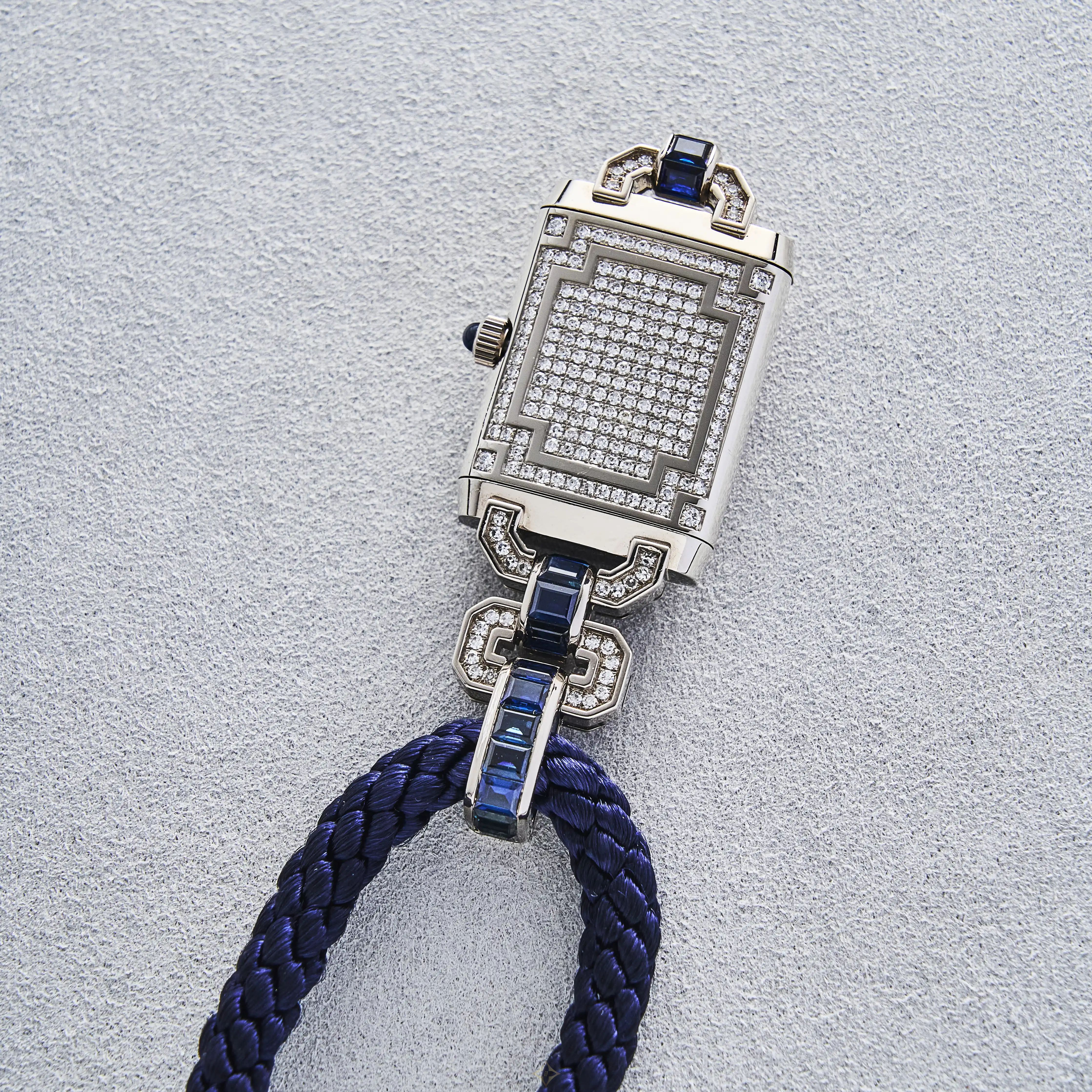 White gold (18-carat), diamond-set and sapphire-set, quartz, vertical rectangular-shaped, reversible “Art Deco”-style double-faced lady’s necklace-watch.