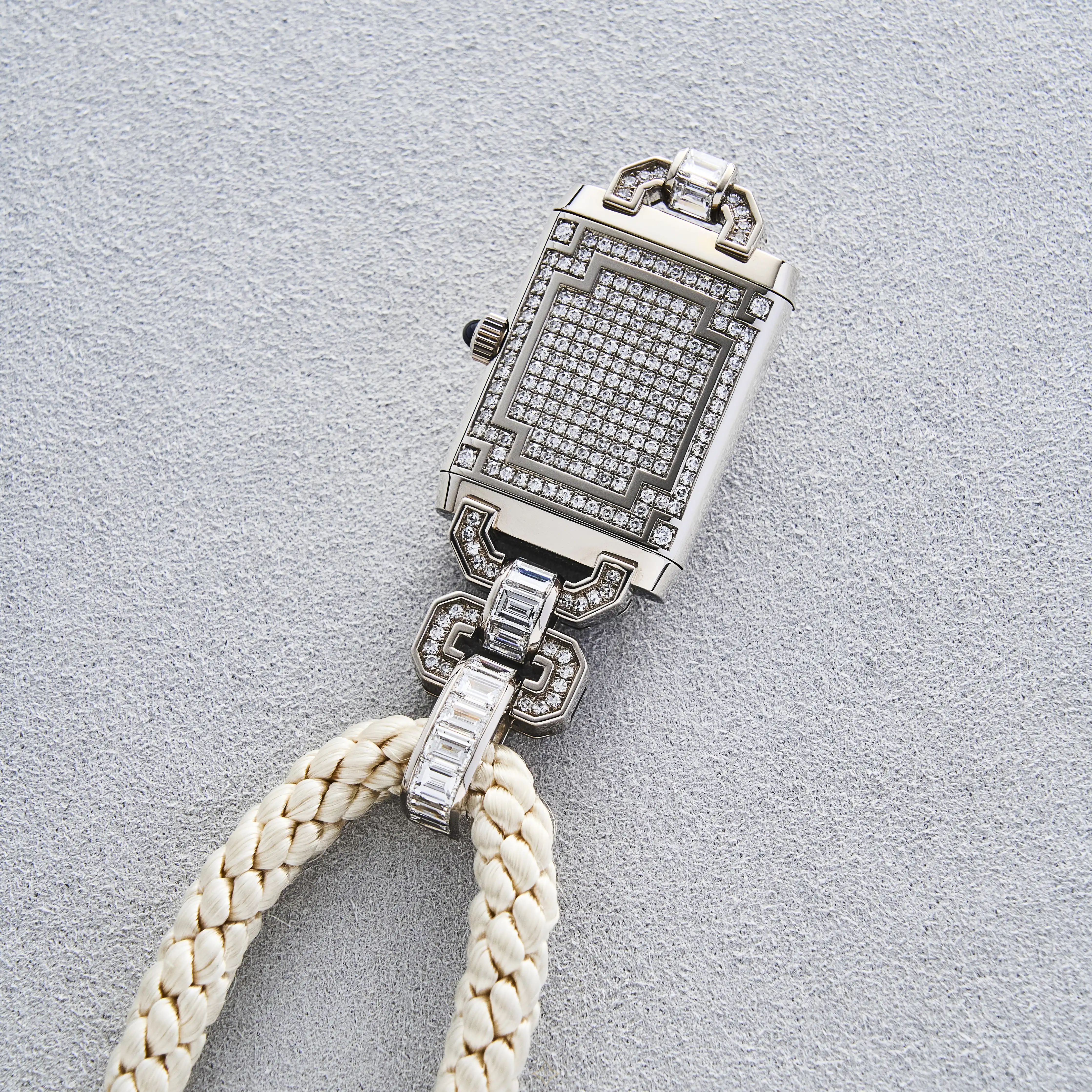 White gold (18-carat) and diamond-set, quartz, vertical rectangular-shaped, reversible “Art Deco”-style double-faced lady’s necklace-watch.