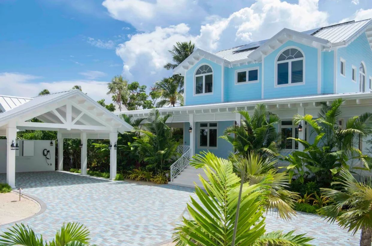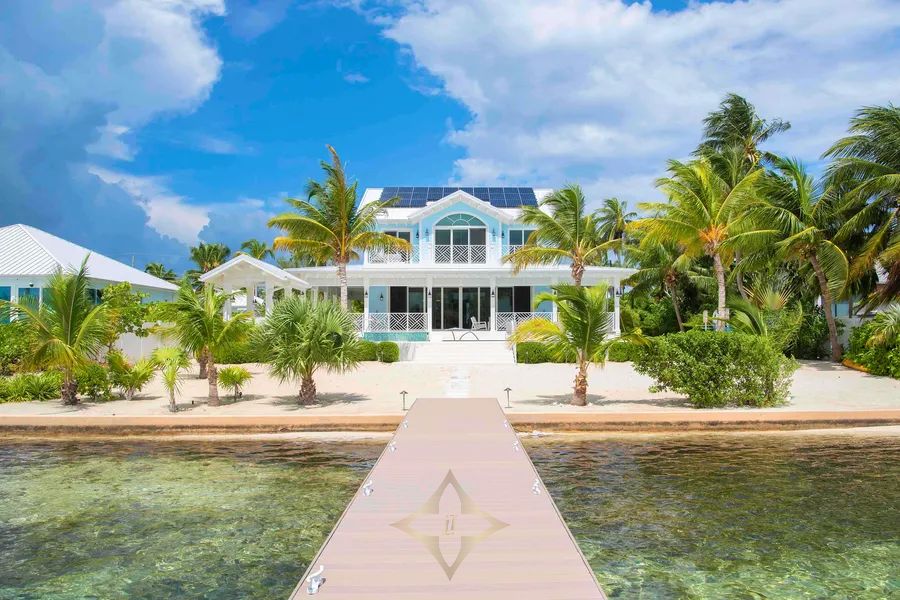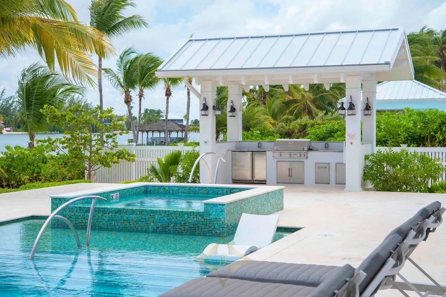 An outdoor kitchen cabana with a propane grill, icemaker, and beverage fridge is perfect for island cookouts under the stars. A sandy beachfront backyard leads down to the villa’s dock and gazebo.