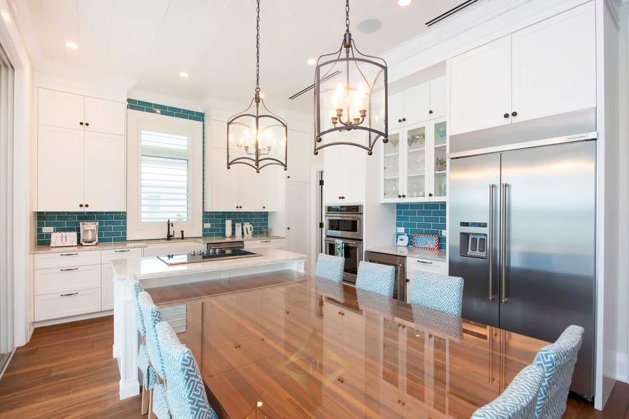 The great room has a wall of sliding glass that affords a full view of the pool, beach, and quiet cove waters. The gourmet kitchen is a vacationing chef’s dream. Kitchen-Aid appliances include a built-in main fridge and freezer, a wine fridge, a dishwasher, a wall oven, a microwave, and a warming drawer that doubles as a slow cooker.