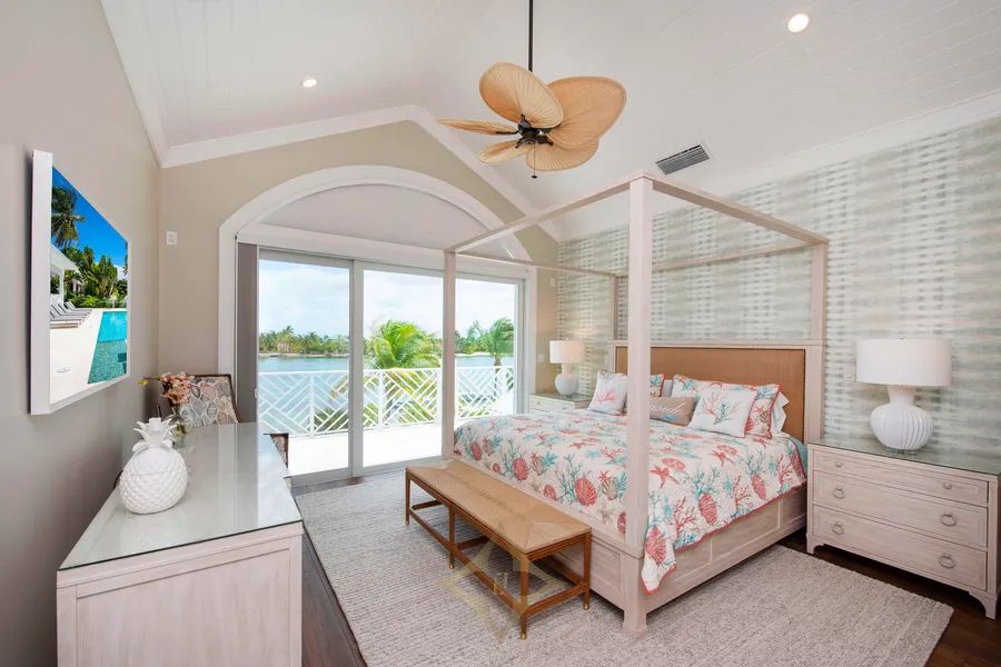 The Primary suite has the ultimate beachfront views, vaulted ceilings, and its own furnished balcony, walk-in closet, and ensuite bathroom with free-standing soaking tub and dual vanities. The secondary bedrooms have plush window seats, beautiful water views, and vaulted ceilings, and share a sizeable bathroom between rooms, ideal for guests and kids.
