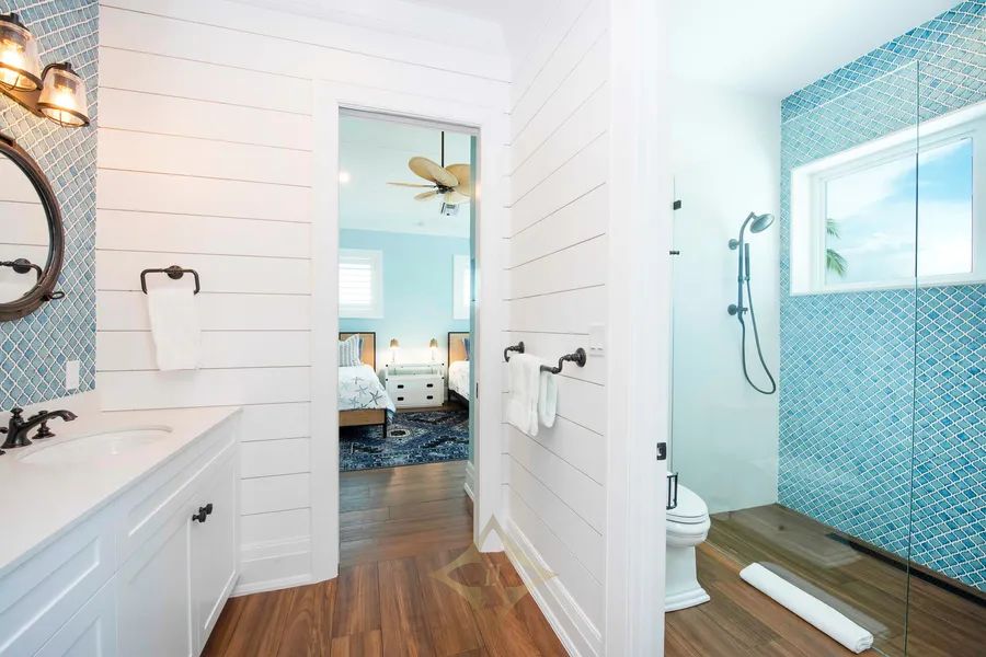 Recently featured on the front cover of a local home and garden magazine for its superb design, the sky-blue exterior and crisp, white trim hint at the level of decor within. Wall coverings, furniture, and plantation shutters all evoke a resort-casual, beach cottage feel with plenty of quiet areas for reading, relaxing, or streaming your favorite content.