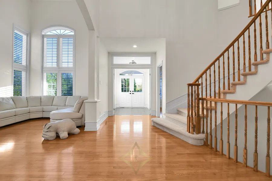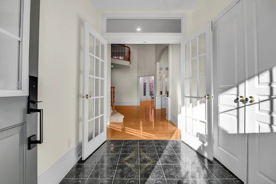 The property features a new roof (2025) and amazing upgraded landscaping, including a saltwater swimming pool, covered terrace and a rear deck with powder-coated steel and Trex boards. Surrounded by trees, the home enjoys a serene sense of seclusion unusual for its location. The covered front porch leads into the home, where you’ll find a gracious foyer that closes off from the rest of the house with French doors.
