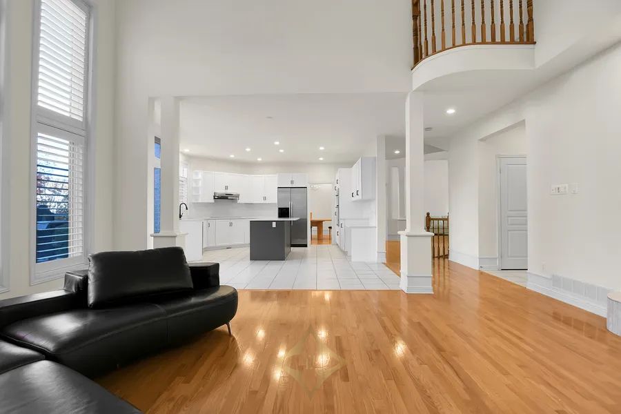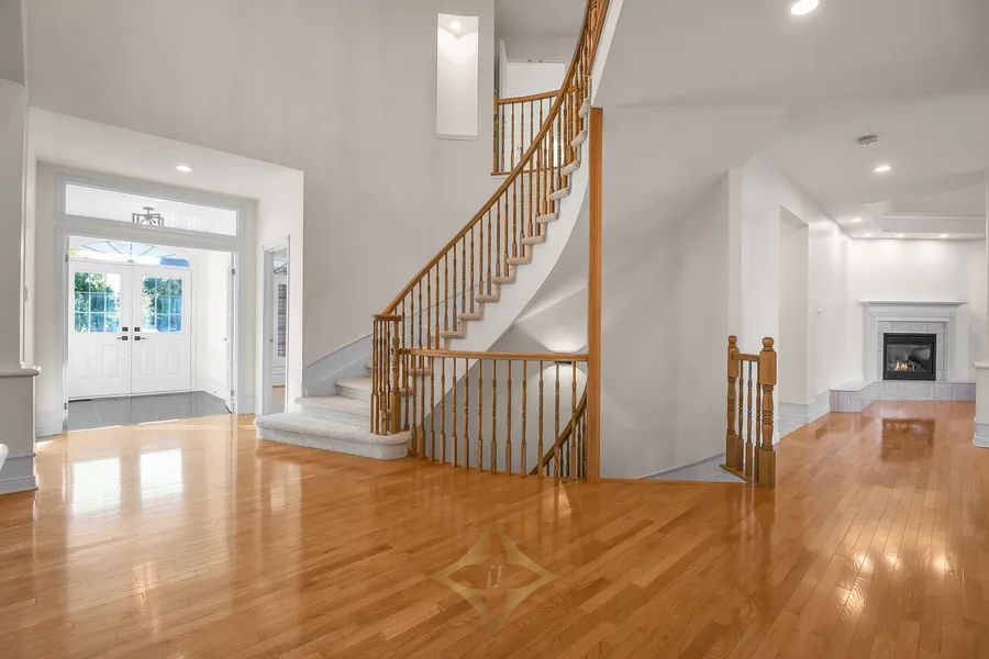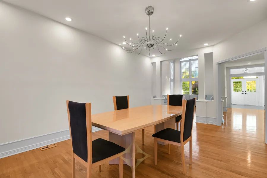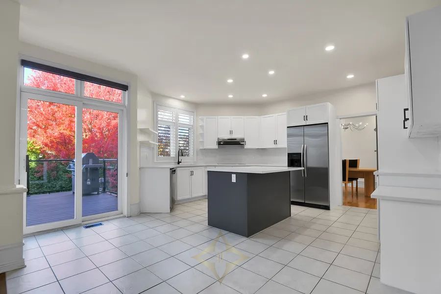 The main floor impresses with 18-foot ceilings in both the living and family rooms, complemented by nine-foot ceilings in the other main floor spaces. Elegant trim work, tall doorways, and large windows create a bright, architectural atmosphere. The spacious dining room overlooks the landscaped backyard, while the renovated kitchen (2025) features a center island with counter seating, stainless-steel appliances and a sunny breakfast room that walks out to the deck with barbecue hookup. There is also a private main floor study, powder room and a mudroom / laundry room that accesses the double attached garage.