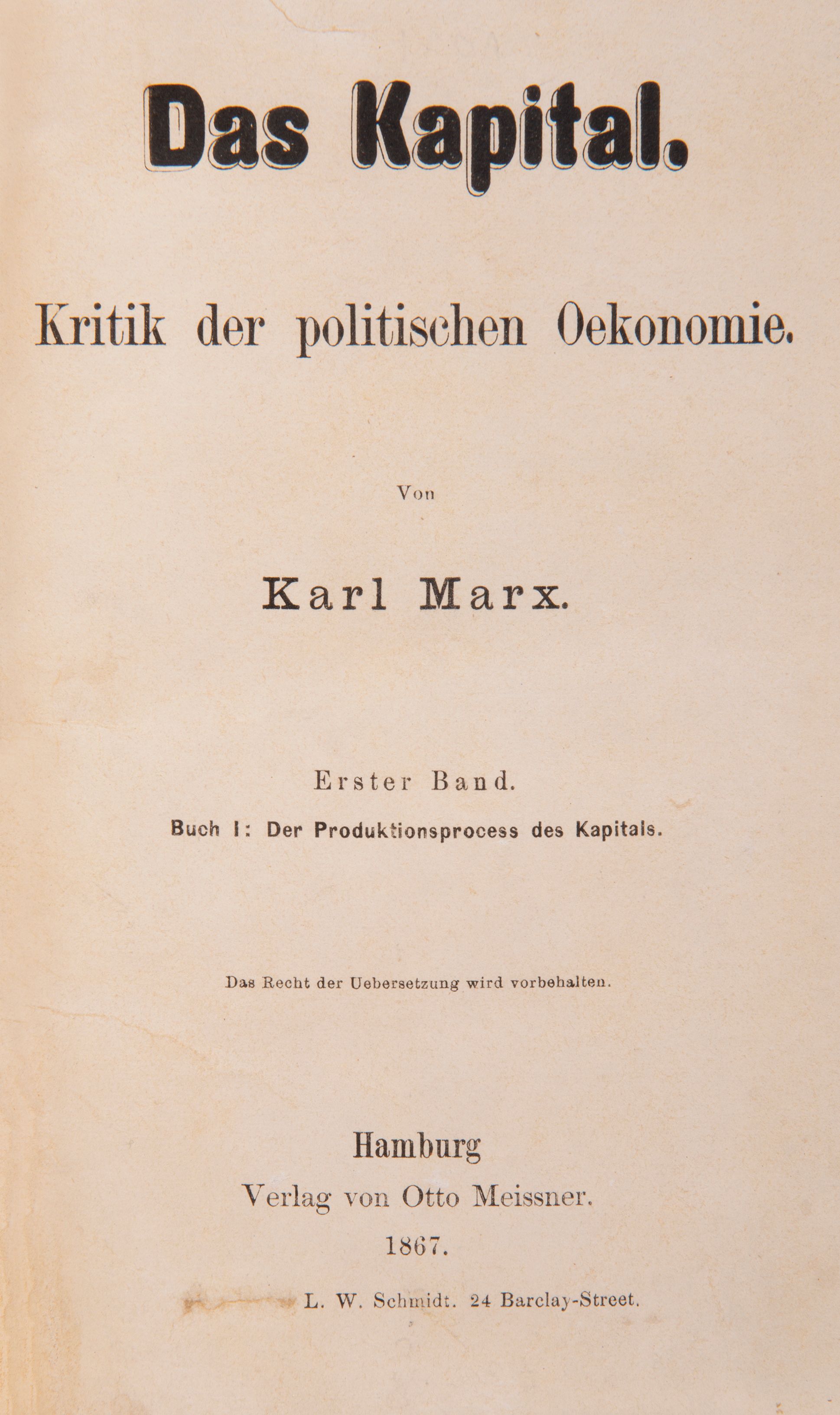 Marx’s masterpiece was the summation of over twenty years research in the reading rooms of the British Museum, and followed on from his earlier work Zur Kritik der Politisches Oekonomie, printed in 1859. It is rarely found complete, as here, since the last part was published more than 25 years after the first volume - and 11 years after his death; only the first volume appeared in Marx’s lifetime. The first part was edited by Marx himself, while Friedrich Engels (1820-95) edited all others, until one year before his death. Interestingly the publisher Otto Meissner remained responsible for the entire publication.