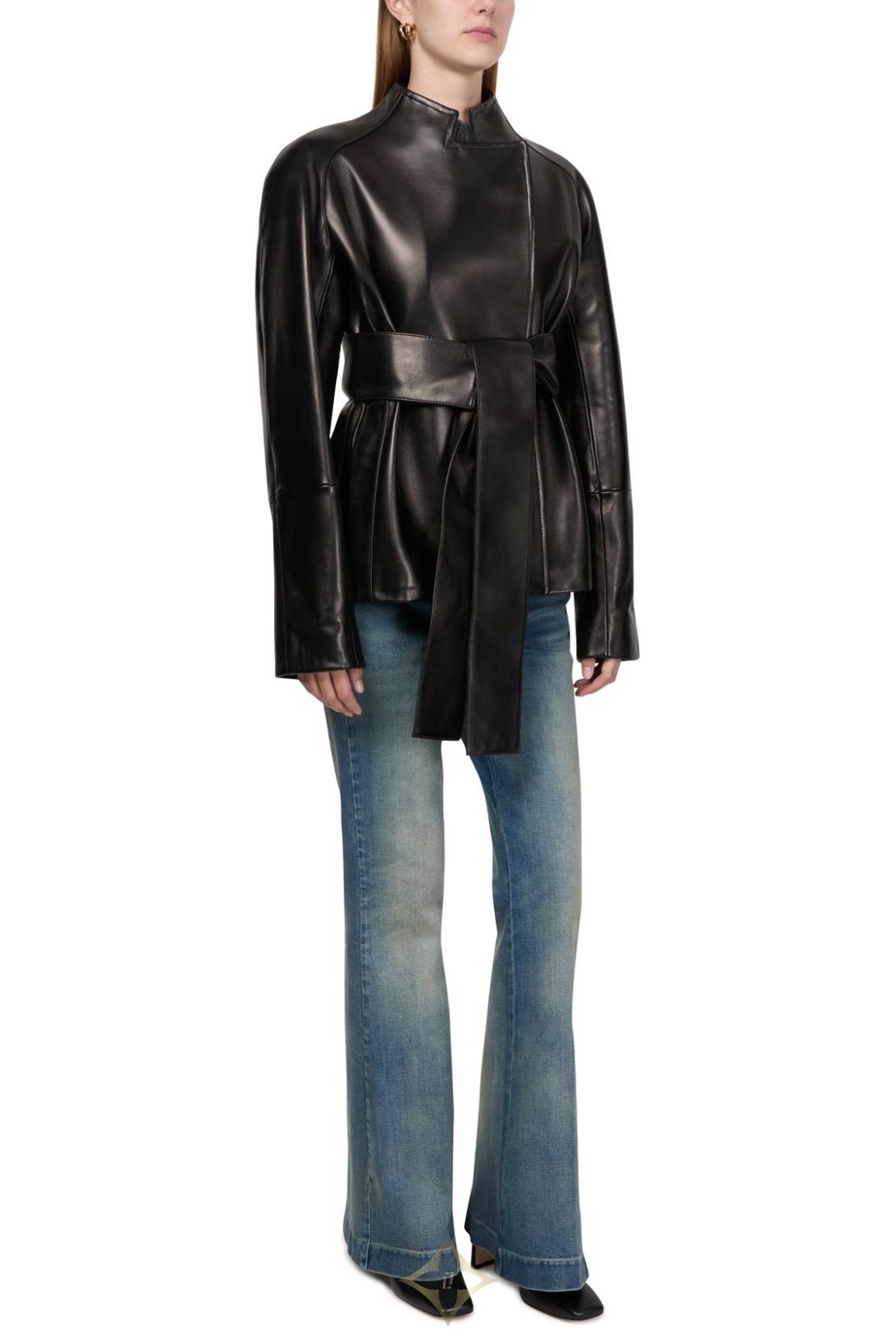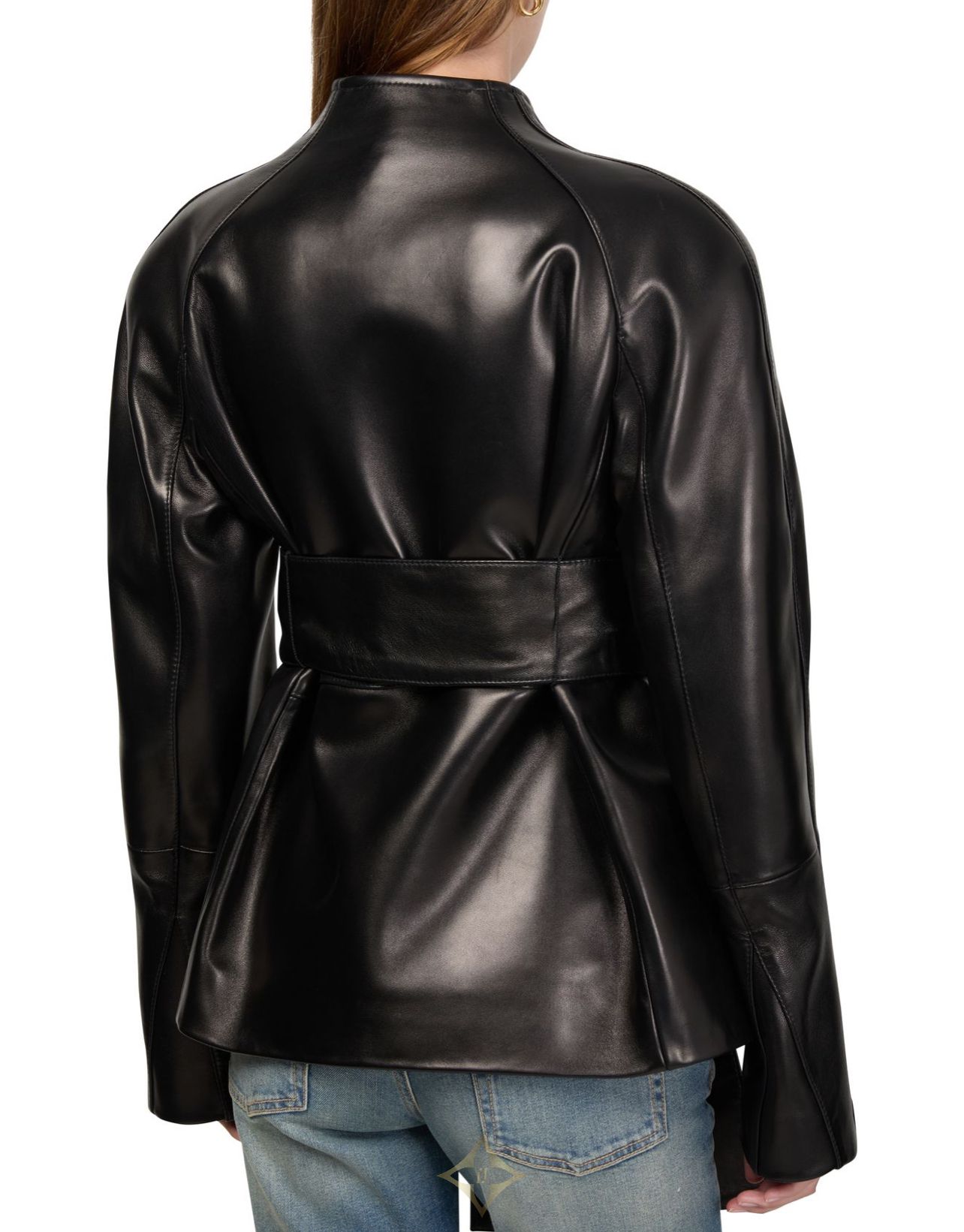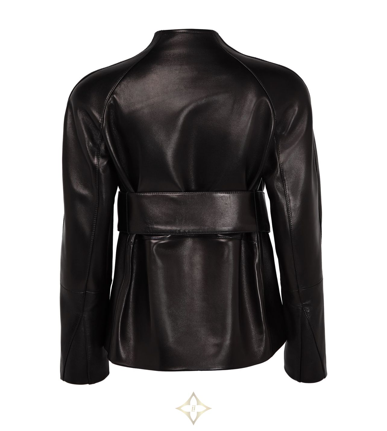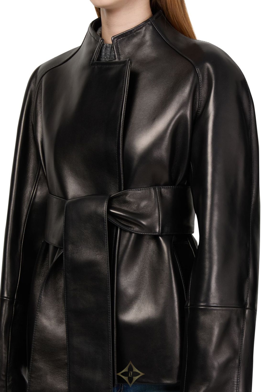 DESCRIPTION : Glossed leather, smooth leather, regular fit, bow fastening, long-sleeved, high neck, wraparound.