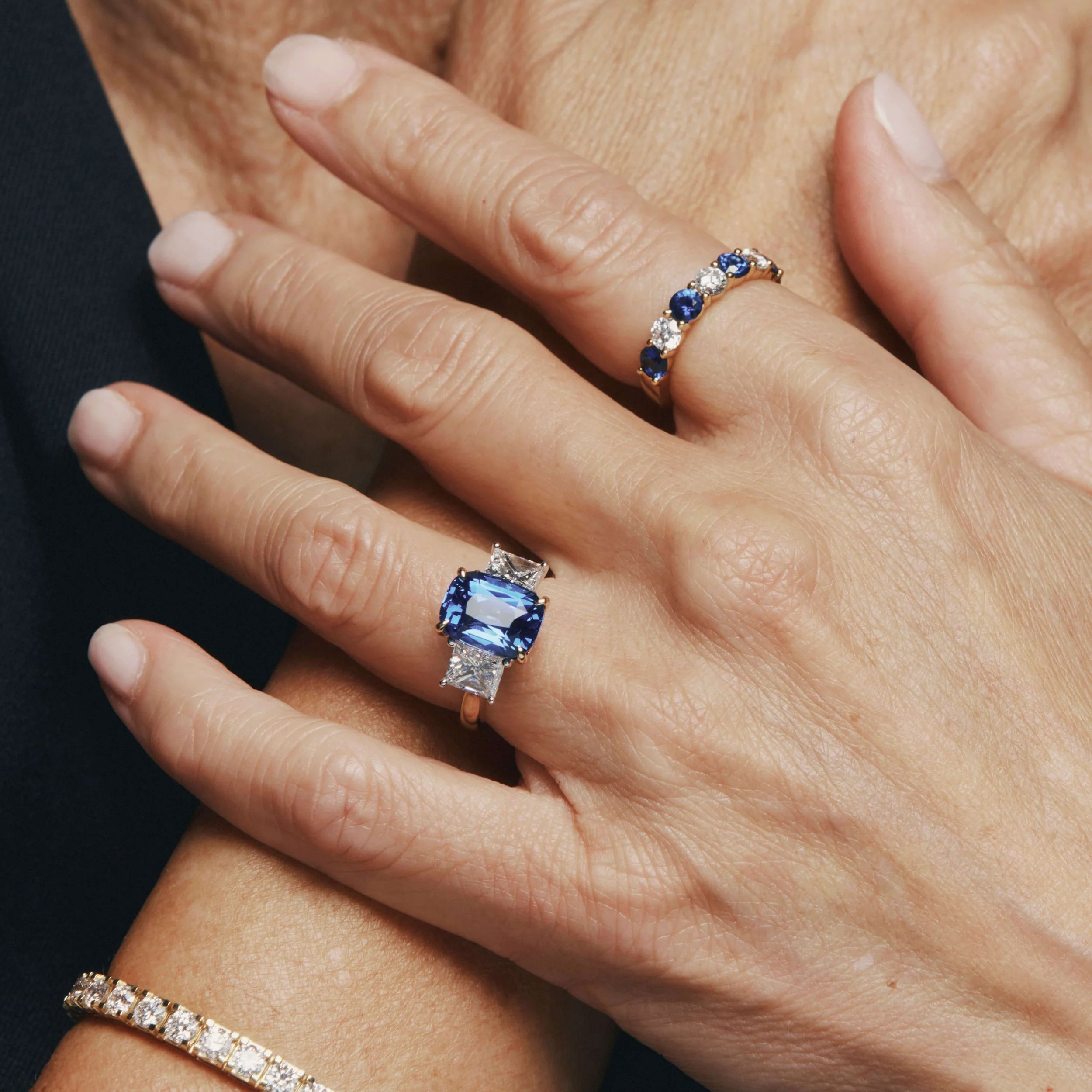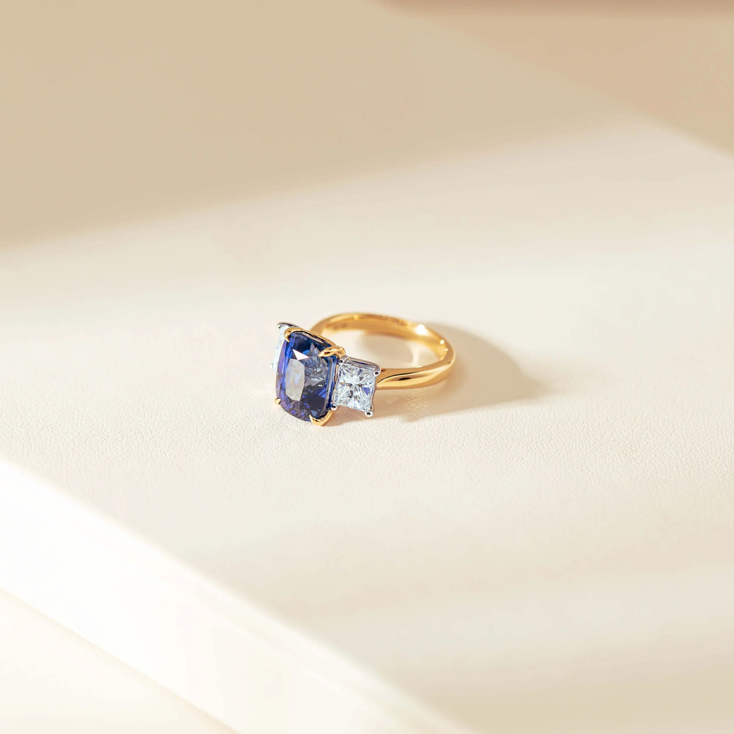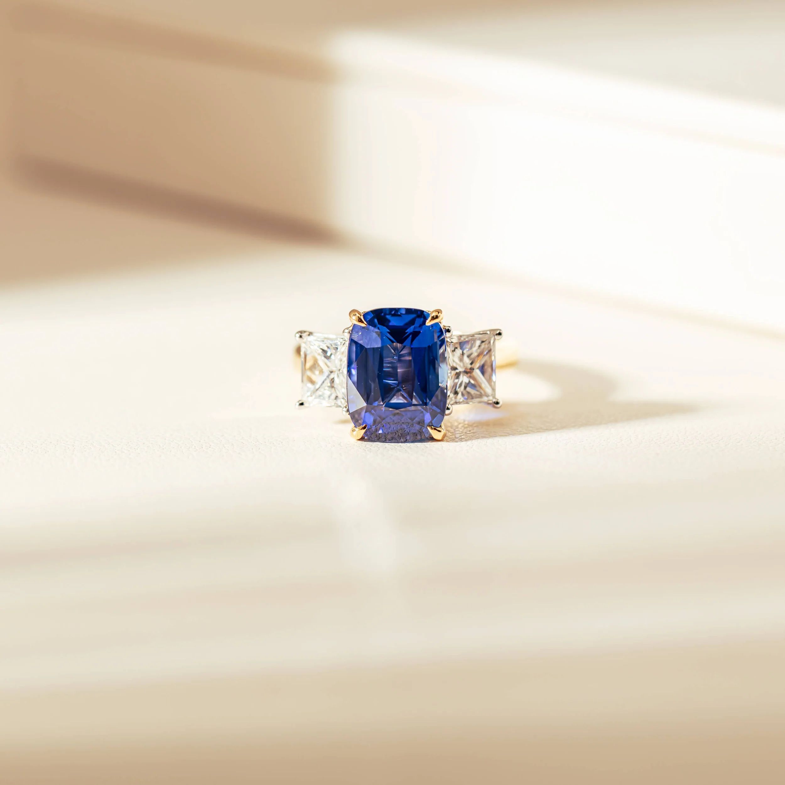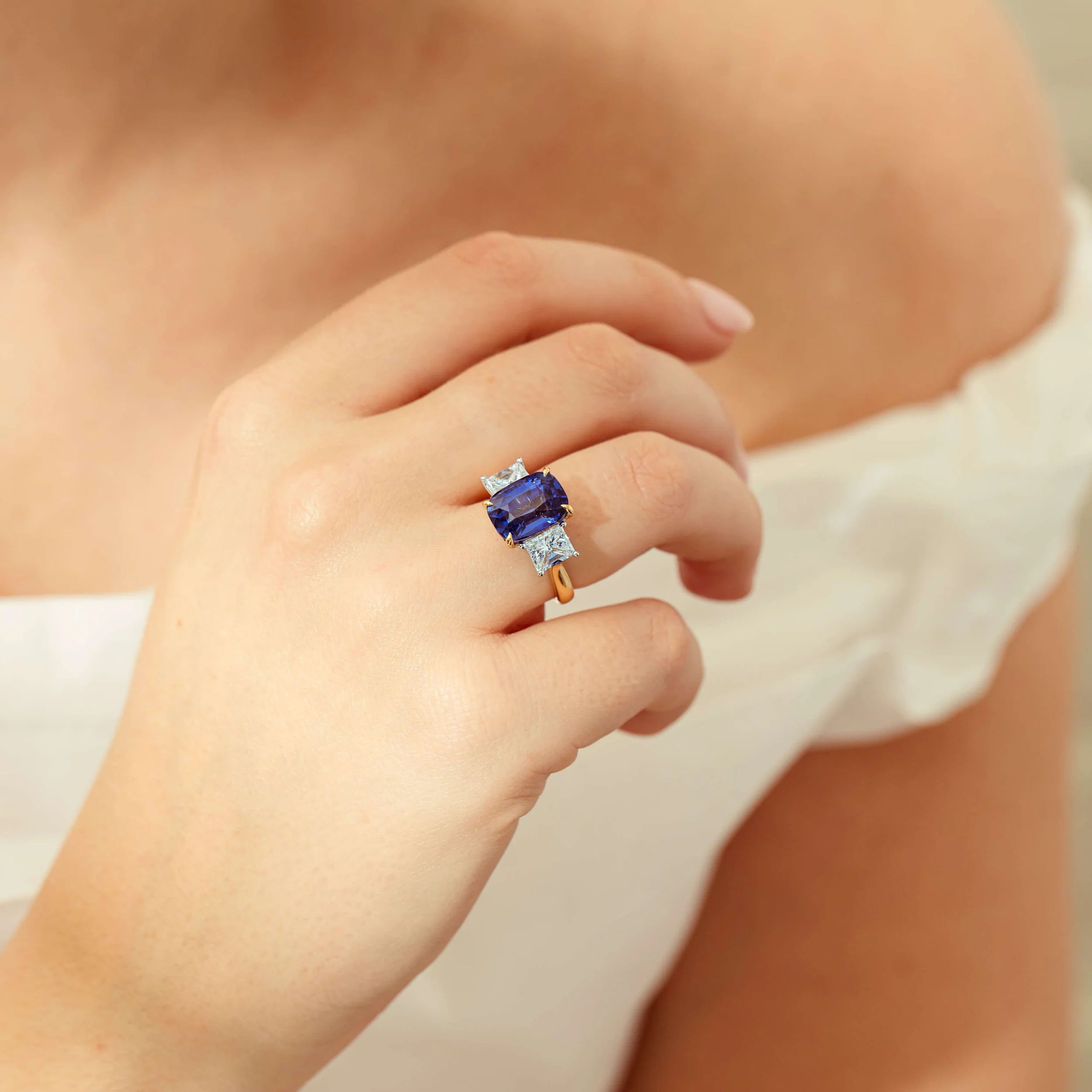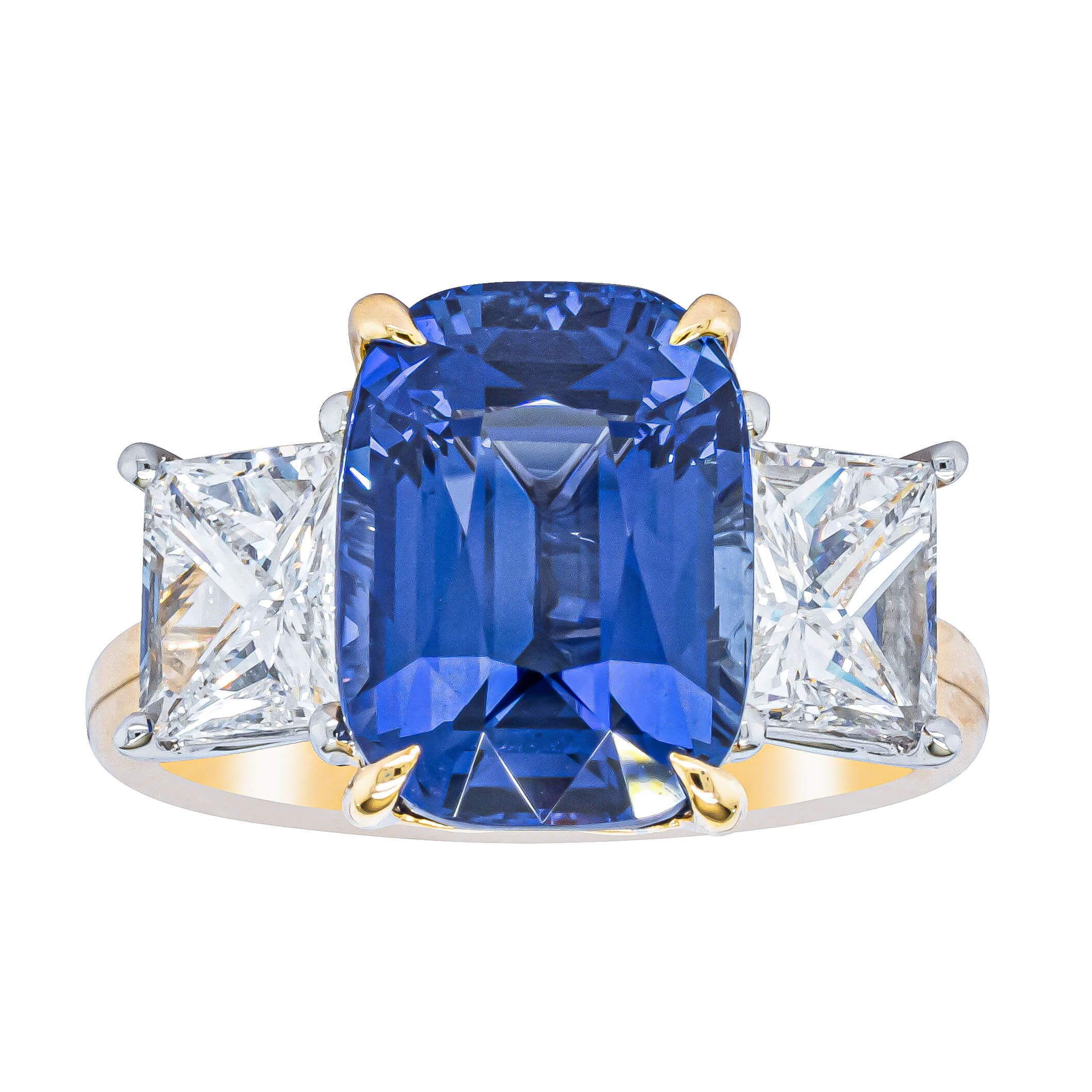 "An exceptionally rare 8.03ct natural blue sapphire, captivates with its vivid, highly desirable hue. Sourced from the famed gem-rich rivers of Ratnapura, Sri Lanka, the sapphire’s elongated cushion shape and brilliance is a testament to the natural beauty of the material and expertise of the cutting. Flanked by two fine quality radiant cut natural diamonds totalling over 2.00ct, the gemstones are arranged in a slightly graduating open four claw design allowing light to enhance their natural splendour. Refined design letting the gemstones sing, this ring epitomises elegance and rarity." - Joseph Tattersfield