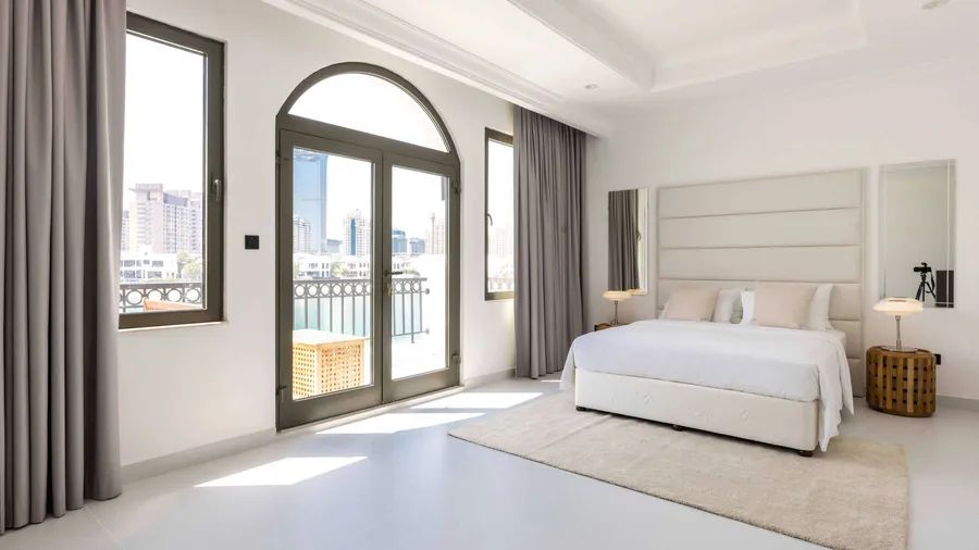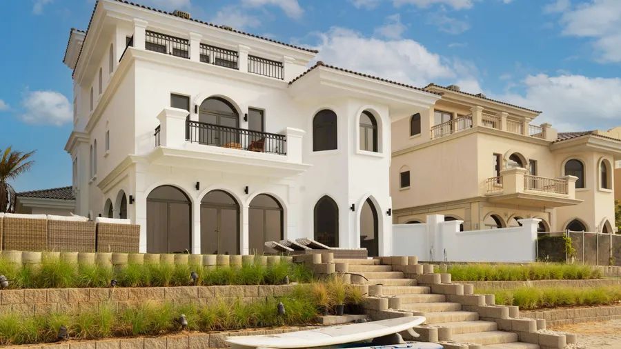The villa uniquely features an additional storey to total G+2 floors. It boasts a pristine white exterior that blends into the neighbouring sea, with multiple balconies providing bespoke private spaces for relaxation in the outdoors.