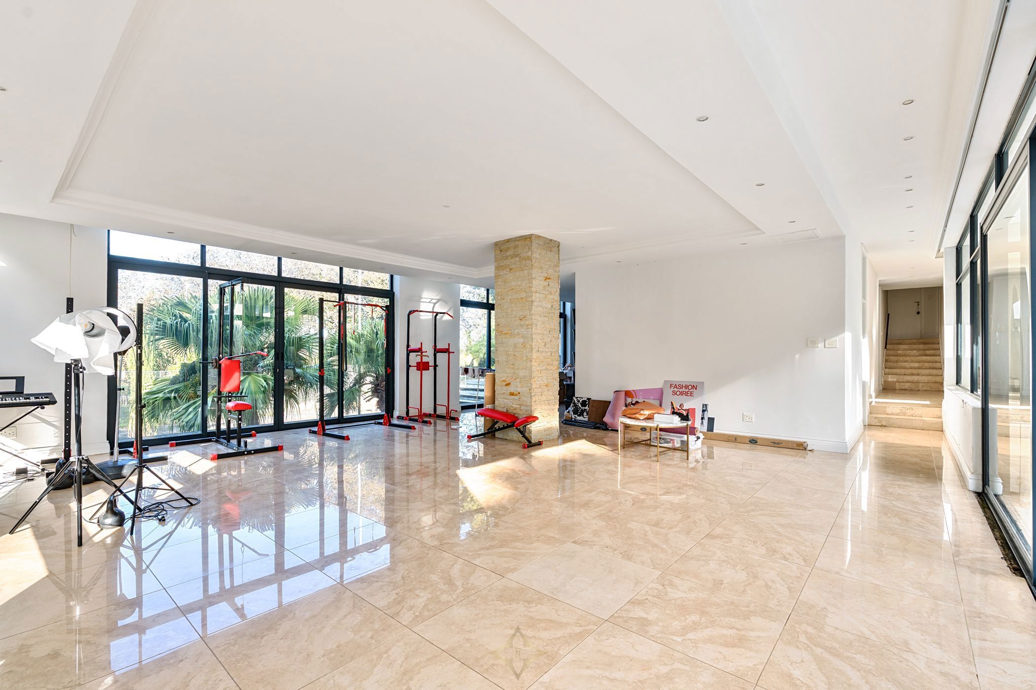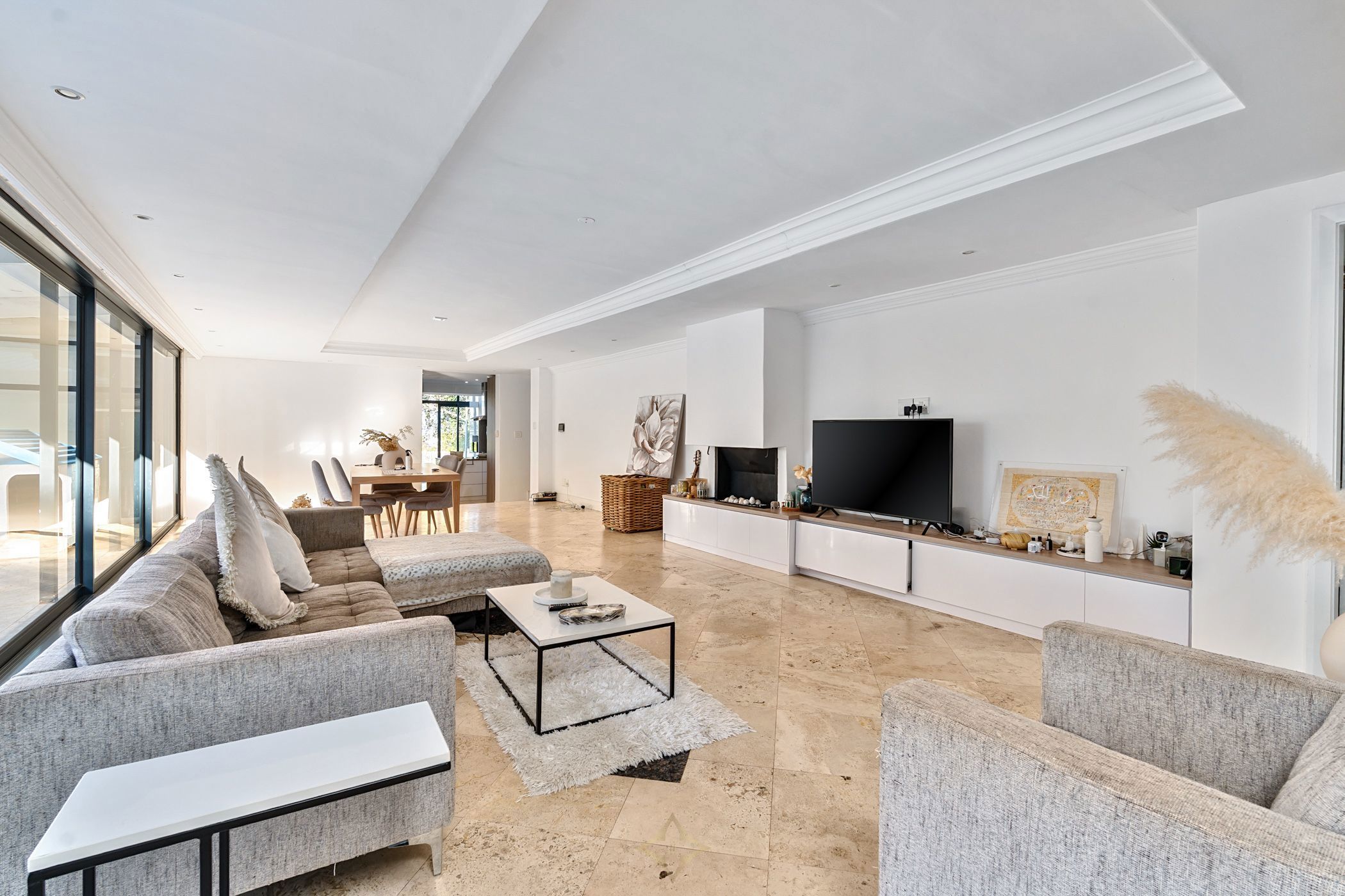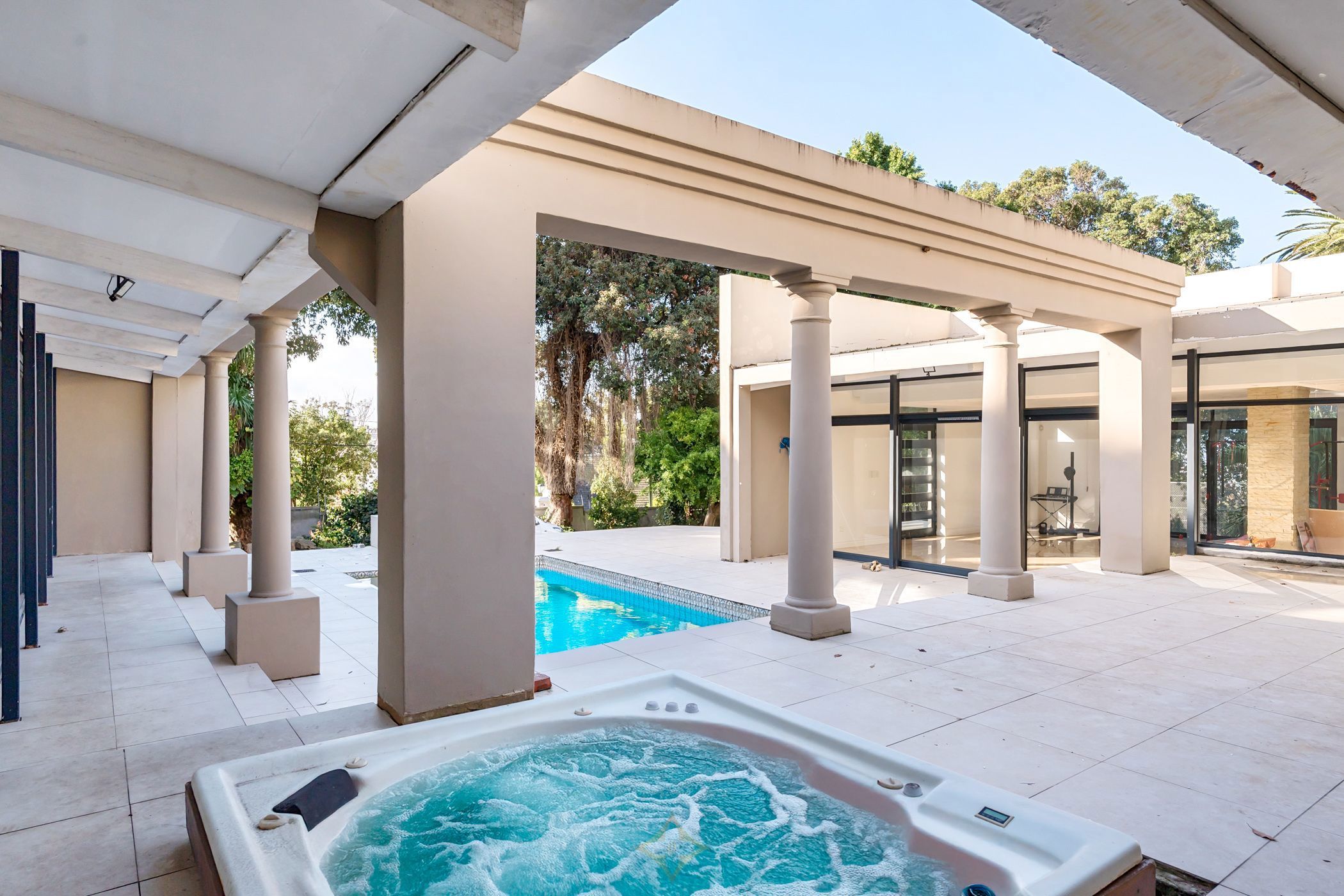 Designed around a north-facing central courtyard with a swimming pool, the house was originally planned with entertainment in mind. Its elevated aspect allows for partial views of the city skyline, and the layout offers good indoor-outdoor flow from the central living areas.