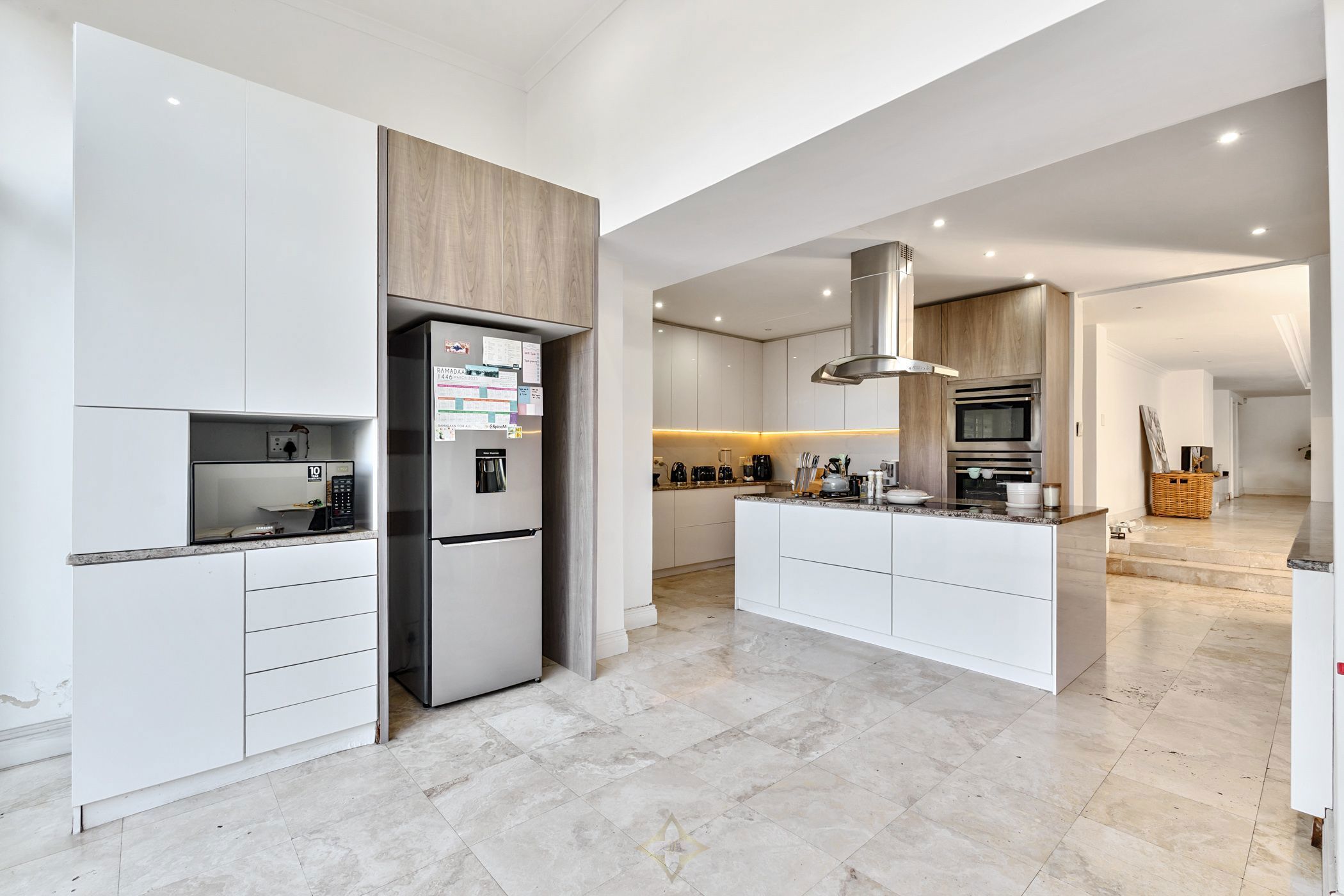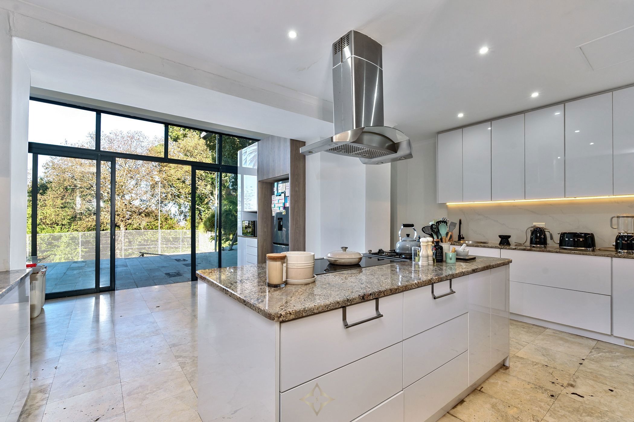 The entrance hall leads into a spacious open-plan lounge with travertine flooring and a library corner. The kitchen features a central granite island, two eye-level ovens, a gas and glass hob, and an adjoining scullery. It opens onto a back terrace that overlooks the tennis court and garden.