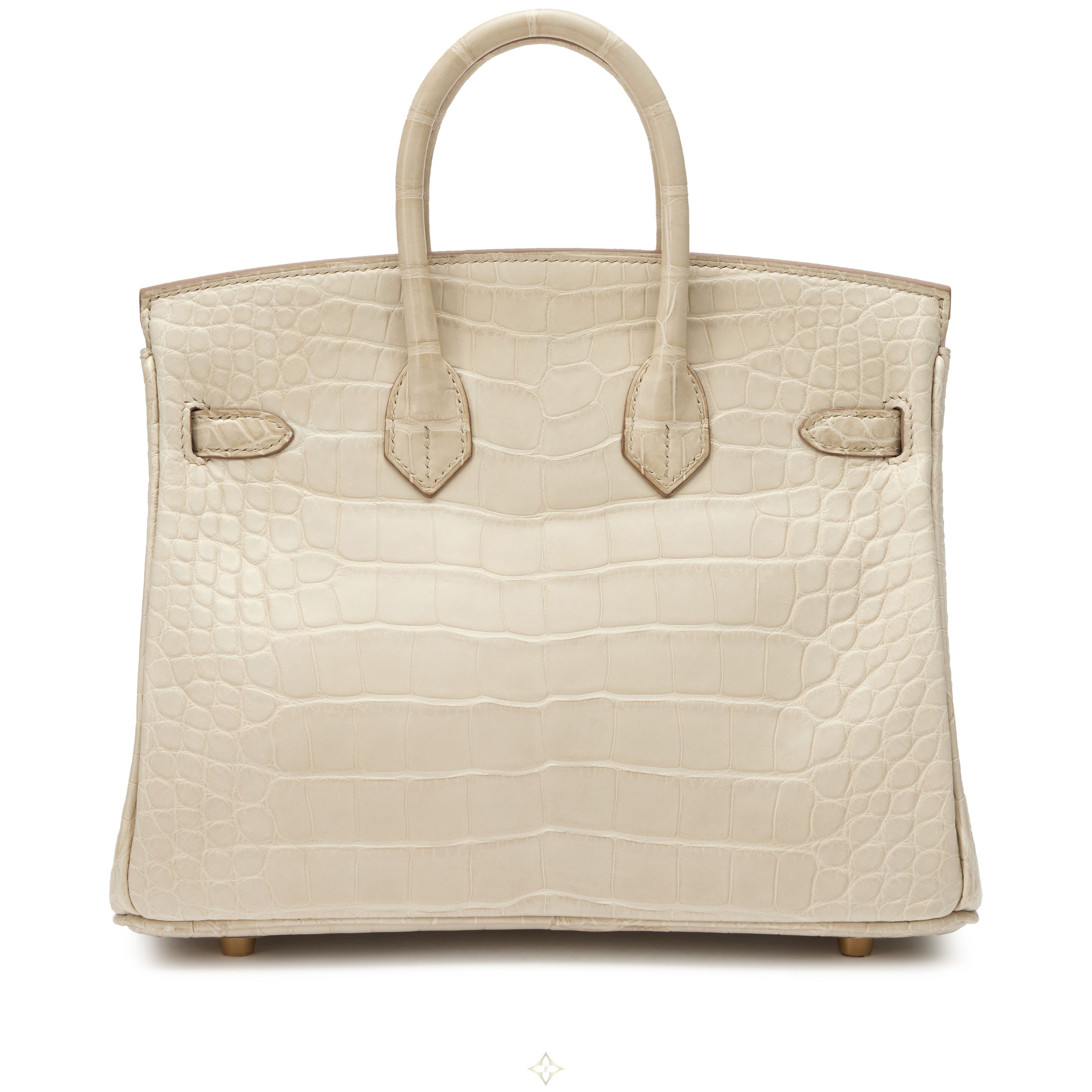 Hermès Beton Matte Mississippiensis Alligator Birkin 25 Gold Hardware, 2023 Price: 98,000 USD • Taxes not included VAT and other taxes are not reflected in the listed pricing. • Ships from: New York, United States This item ships within United States only • Authenticity guaranteed We guarantee the authenticity of this item. Description Hermès Beton Matte Mississippiensis Alligator Birkin 25 Gold Hardware, 2023 The interior is lined in a tonal chèvre leather Includes lock, two keys, clochette, clochette dust bag, ribbon, care booklet, felt protector, dust bag, and box This item is final sale and not eligible for return Condition Report: Like New No visible signs of wear. Plastic intact. Year: 2023 Dimensions: Height: 7.87 inches / 20 cm Width: 9.84 inches / 25 cm Depth: 5.12 inches / 13 cm Handle Drop: 2.5 inches / 6.35 cm SKU: D8G9G ——— Sotheby’s Bangkok 155 Anantara Siam Bangkok Hotel (unit B6) Rajadamri Road, Lumpini Pathumwan, Bangkok 10330, Pathum Wan, Bangkok Apple Charnsethikul Country Head, Thailand - Bangkok Email: Apple.Charnsethikul@sothebys.com Phone: +662 2533107 Wannida Saetieo Consultant - Bangkok Email: wannida.saetieo@sothebys.com Phone: +66 2 2533108