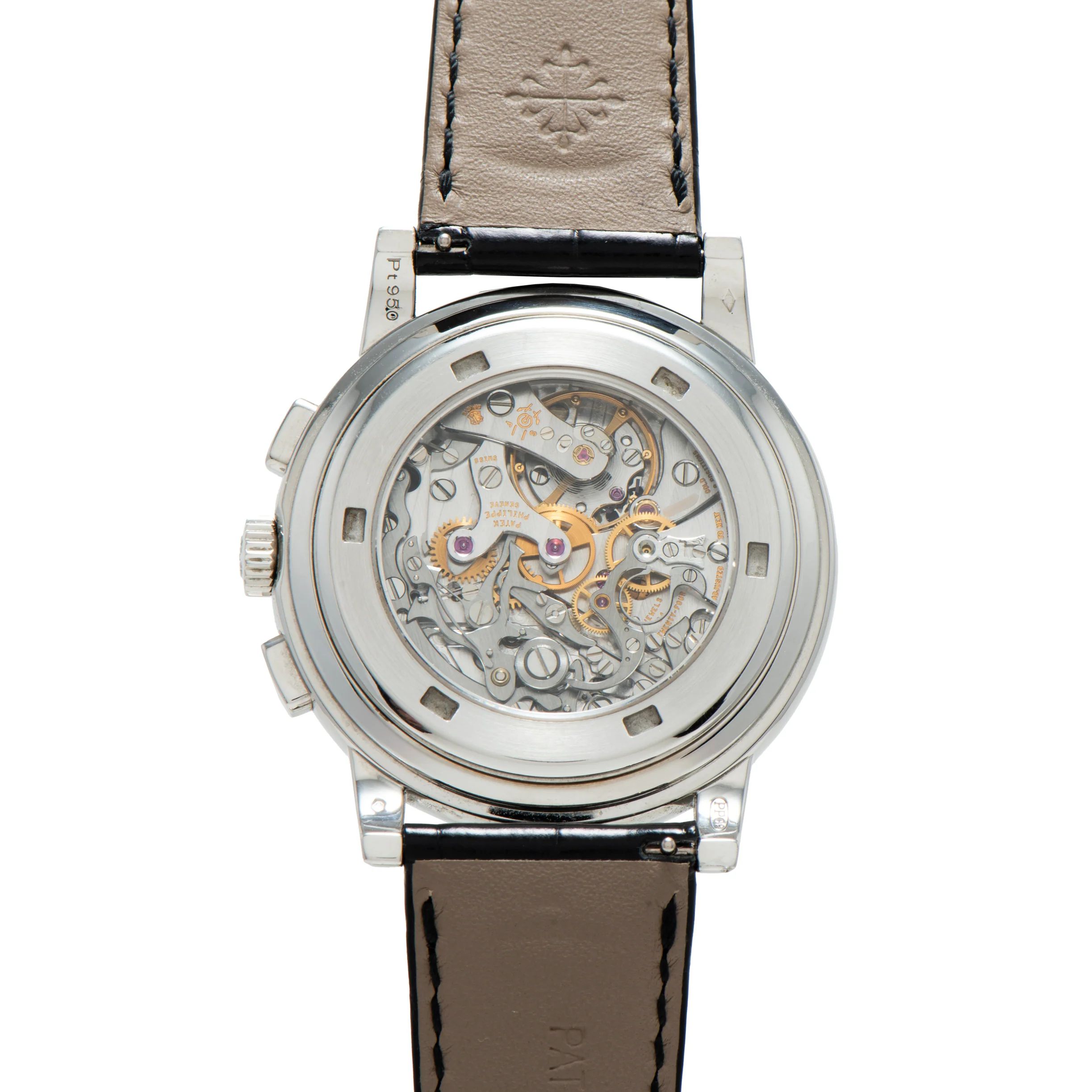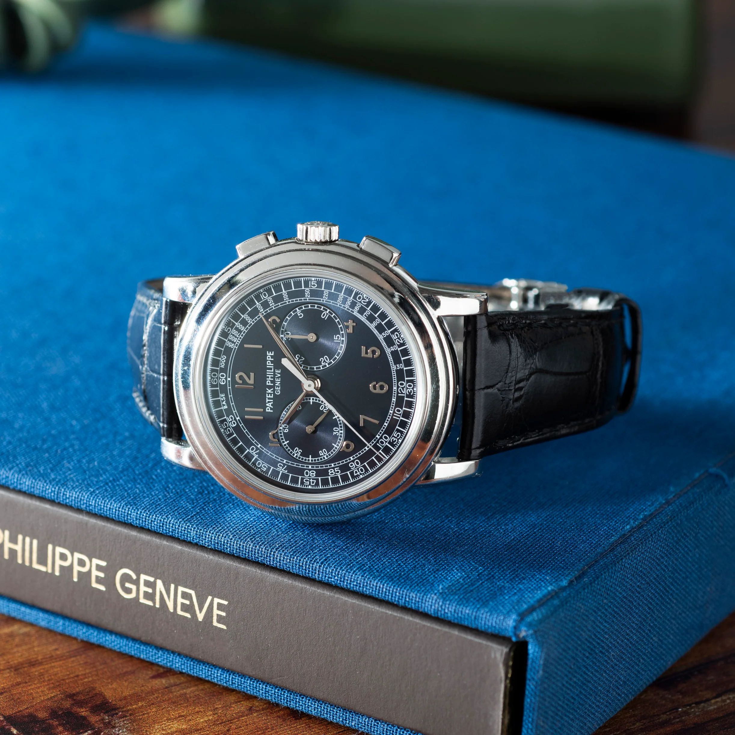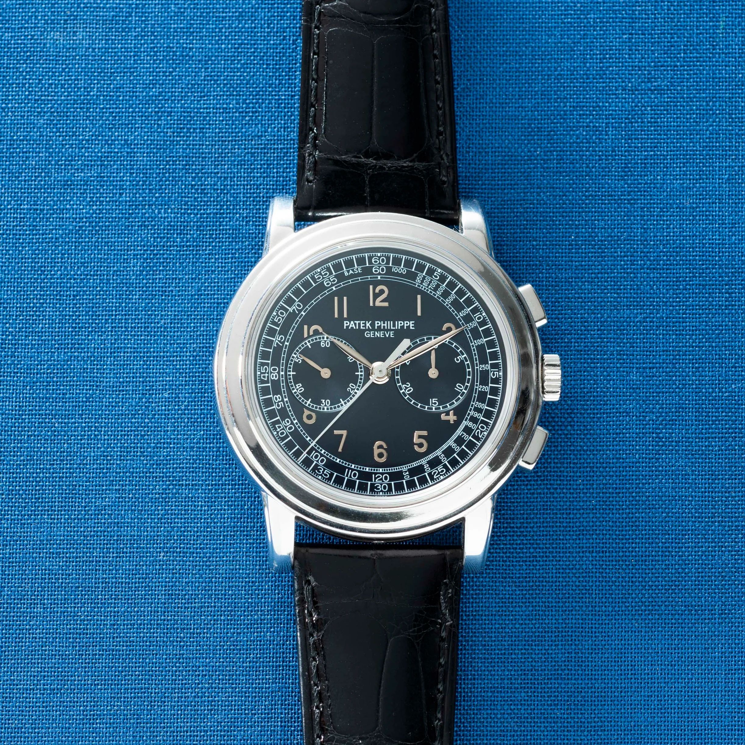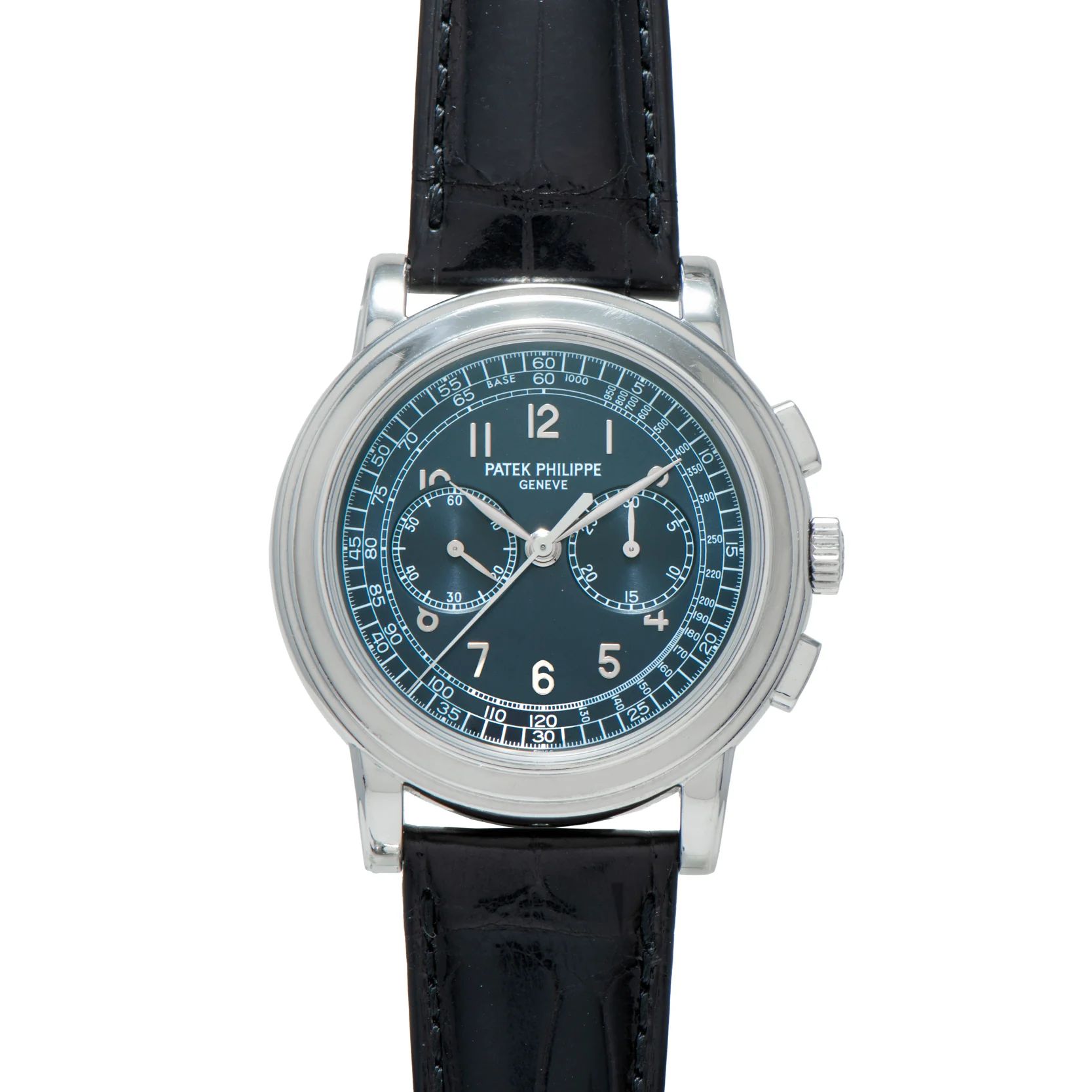 This particular 5070 from circa 2008 is emblematic of all that makes the Ref. 5070 such a highly desired piece: Housed in a 42mm platinum case with 'paddle' pushers, a signed crown, an elegant stepped bezel, and a sapphire crystal, it features a sunray blue dial with a white-printed 1/5th-seconds track, tachymeter scale, and 'railroad' minute track; applied white gold 'Arabic' indices; a dual-register chronograph with 30-minute counter; and an elegant 'feuille' handset.