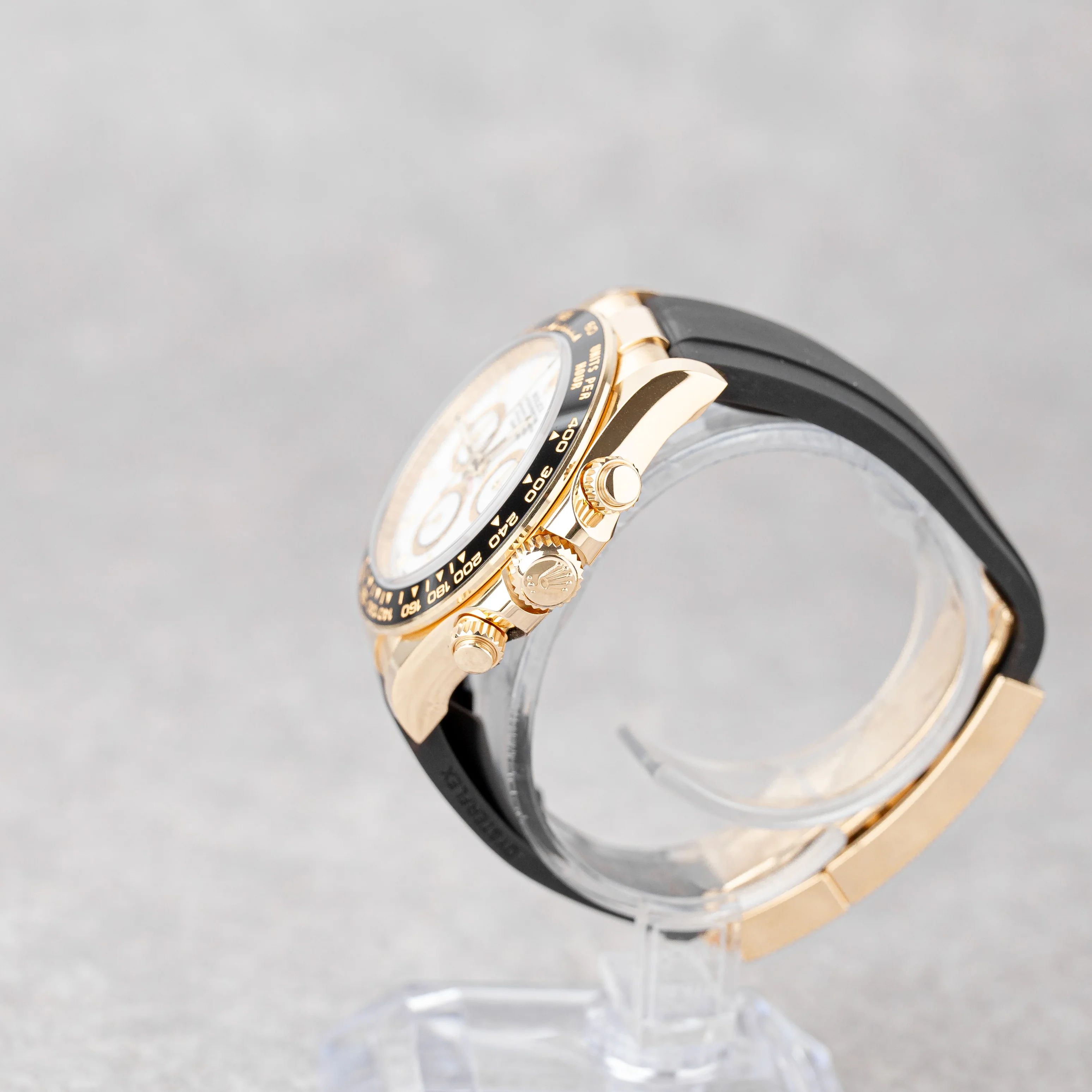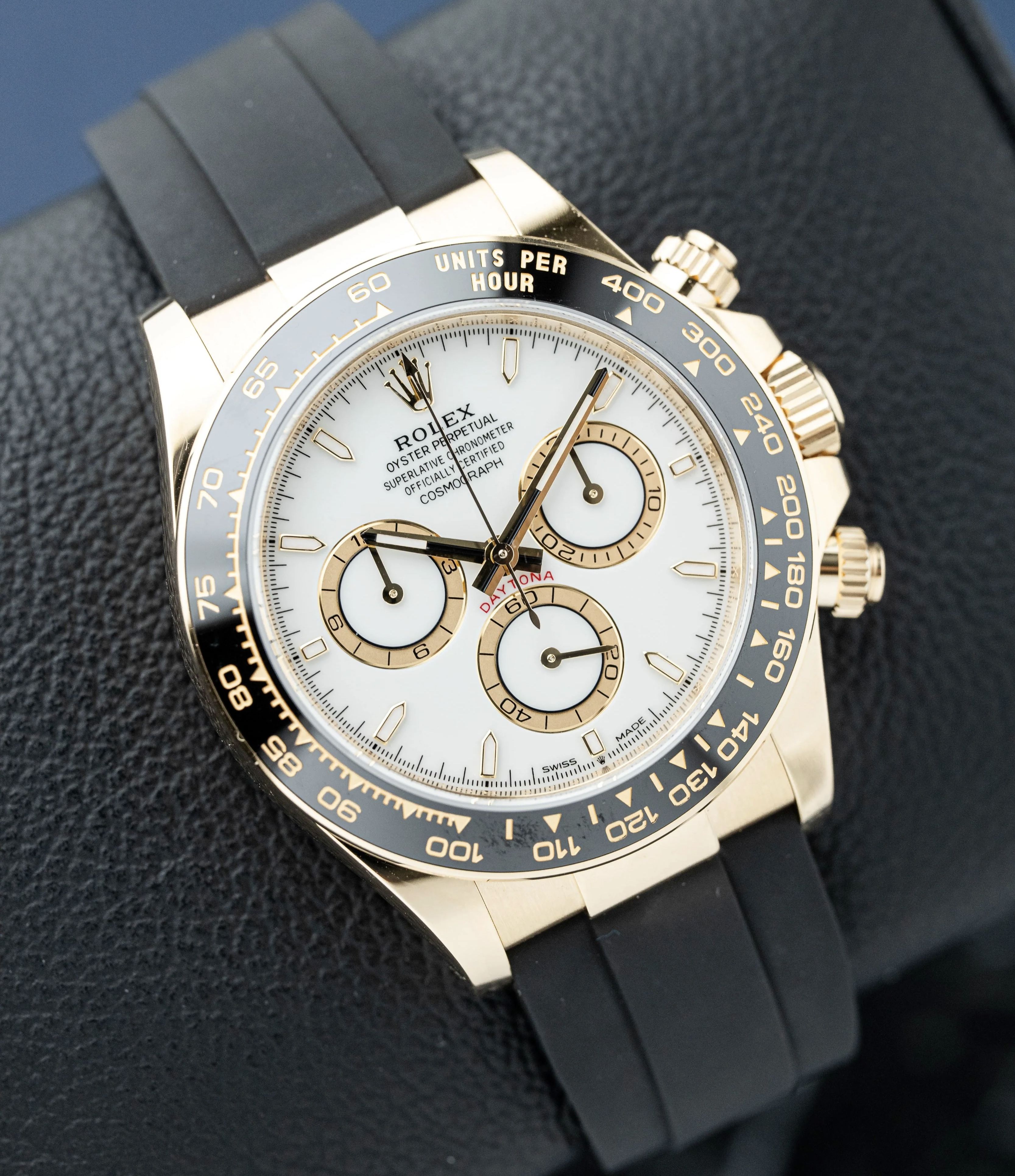 This elegant Rolex Daytona Ref: 126518LN features a clean white dial set in 18k yellow gold with a black Cerachrom bezel and Oysterflex bracelet. Sold as a Full Set from 11/2023, it remains in like new condition, almost unworn, and is covered by the Rolex international warranty until 11/2028.