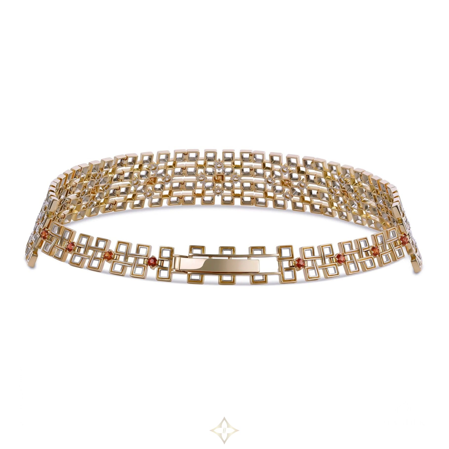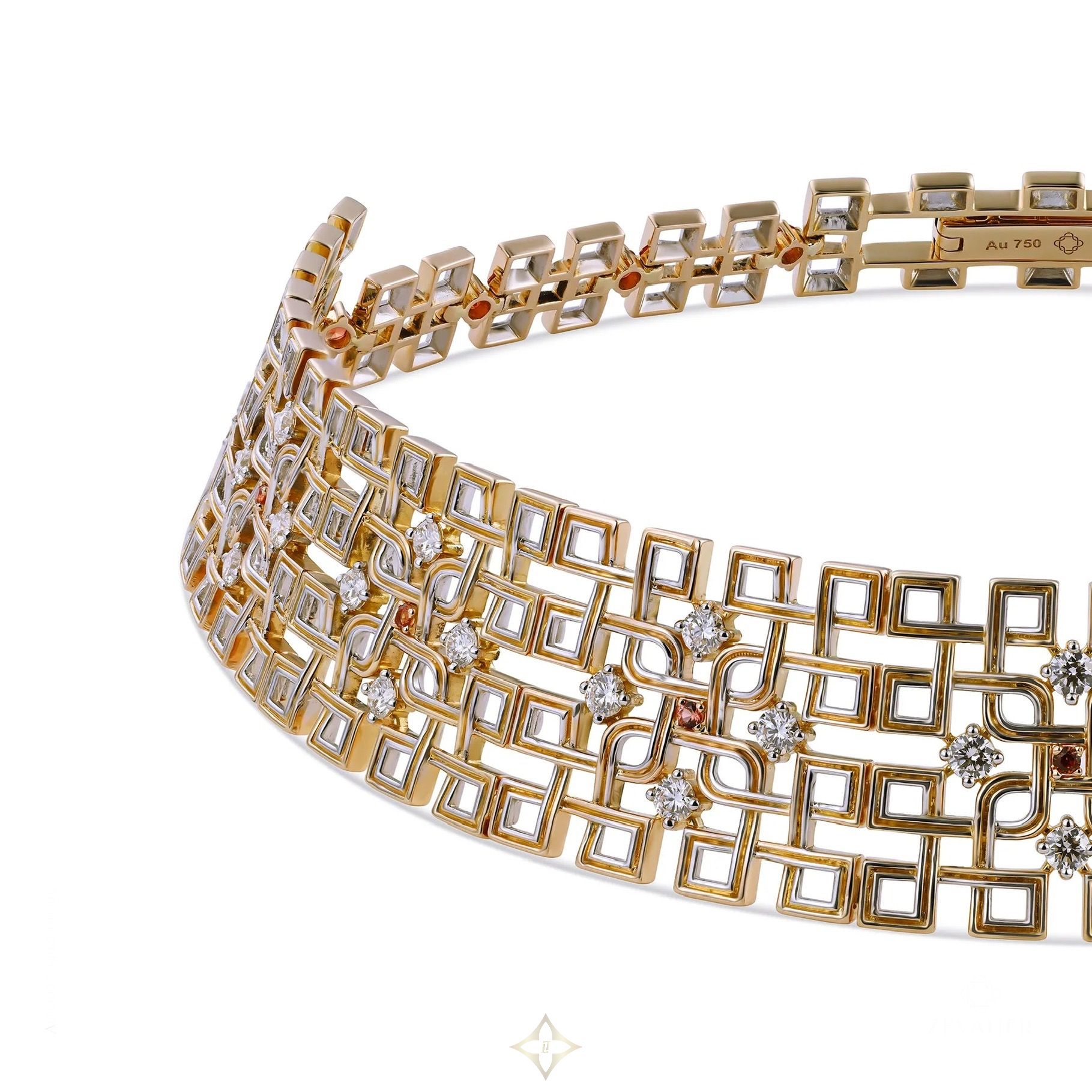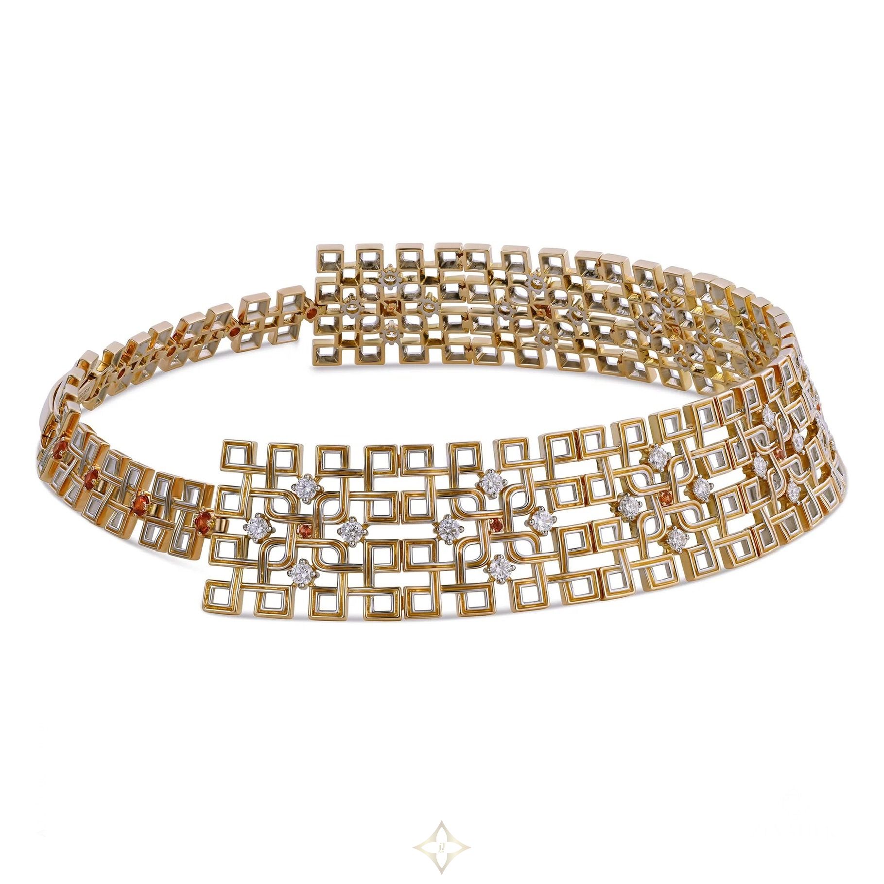 Born from flame, framed in brilliance, Safira embodies a woman who is many things at once — the alchemy of duality. White gold for intellect. Yellow gold for intuition. Diamonds—rarest of their kind—for resilience. Madagascar sapphire for the fire that fuels it all. An ode to form and finish, the Safira Signature Choker houses 17 fiery orange sapphires and 36 D-color diamonds in an intricate 18K gold lattice—where timeless design curves into modern poetry.