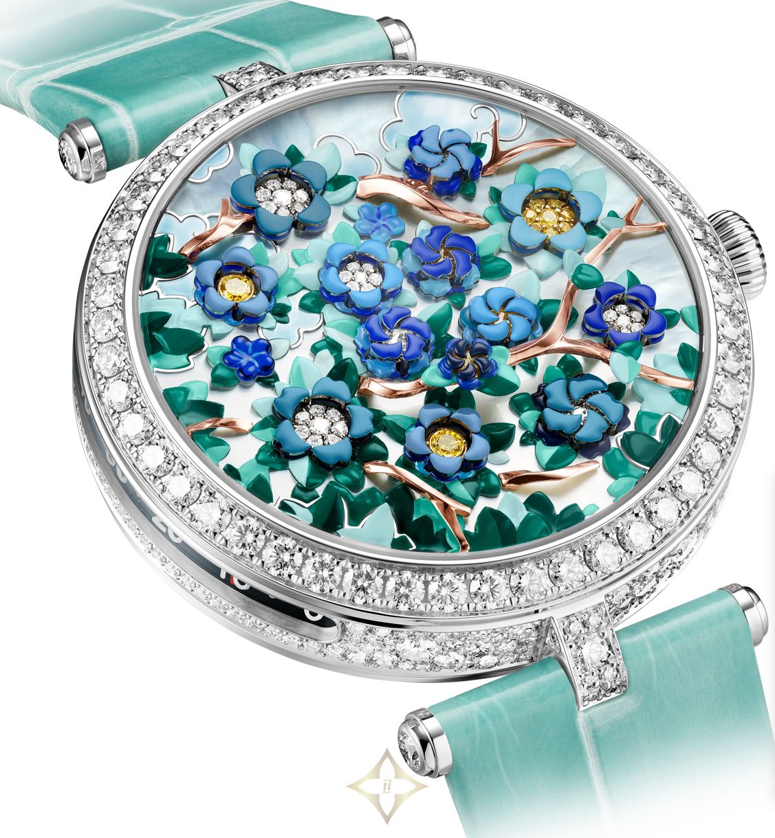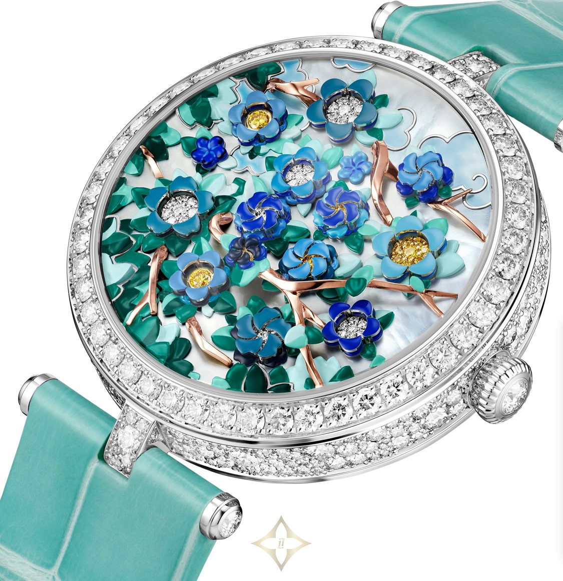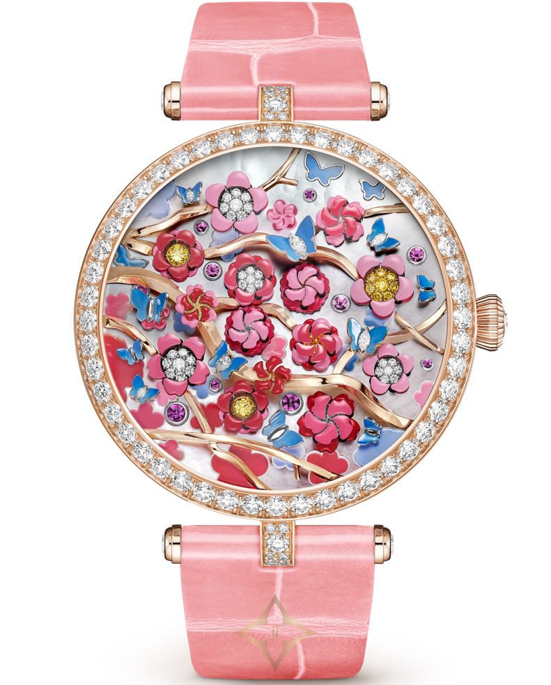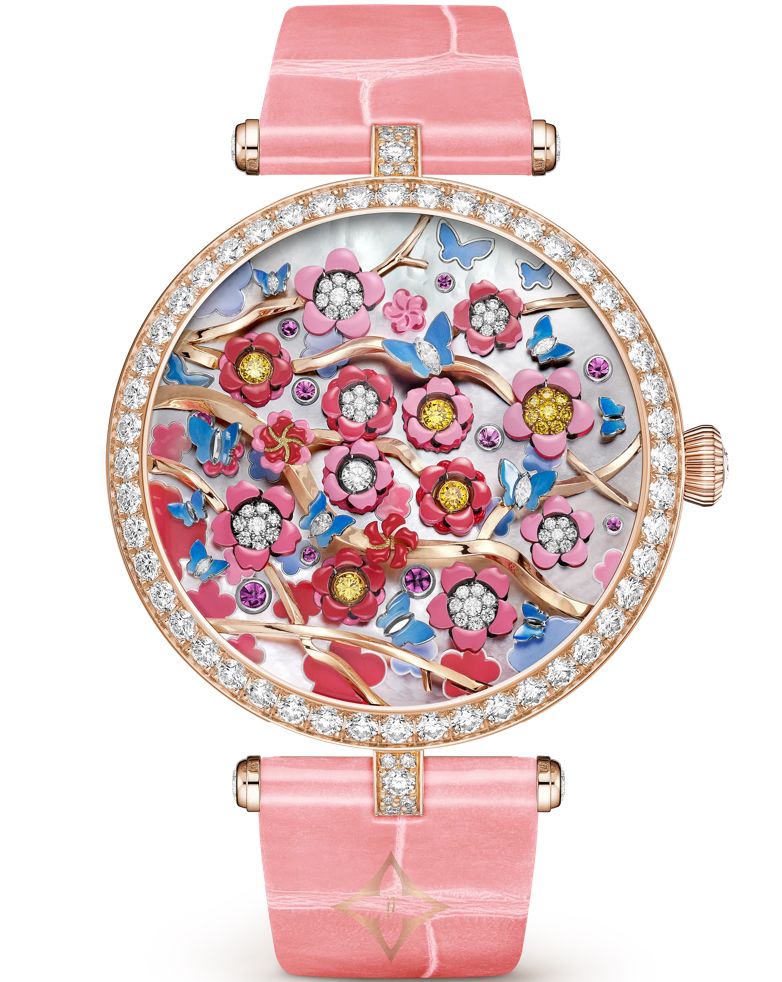 Lady Arpels Heures Florales Cerisier Watch Van Cleef & Arpels PRICE: $304,110 Poetic Complications Collection, Lady Arpels Heures Florales Cerisier watch. 38mm 18K rose gold case, round diamonds; 18K rose gold bezel, round diamonds; white mother-of-pearl dial, rhodium plated 18K white gold, round buff-toped pink sapphires, mother-of-pearl marquetry, miniature painting; flowers in rhodium plated 18K white gold, 18K yellow gold, round yellow diamonds, round diamonds, miniature painting; sculpted 18K rose gold branches; butterflies in rhodium plated 18K white gold, navette and pear-shaped diamonds, miniature painting; 18K rose gold crown, round diamond; shiny pink interchangeable alligator bracelet; interchangeable 18K rose gold pin buckle, round diamonds; DEF, IF to VVS diamonds; self-winding mechanical movement (Valfeurier) equipped with a flower-opening module for the hours and lateral minutes display, 36-hour power reserve; numbered edition. Watch sold with two interchangeable straps and one interchangeable pin buckle set with diamonds. SKU: VCARPBJL00 ——— Lux Afrique Boutique (LAB) 8 Duncan Street, London, N1 8BW, United Kingdom Phone: UK : +44 28 7114 2951 US : +1 332-216-0247 WhatsApp: +15557163886 Email: customerservice@luxafrique.boutique