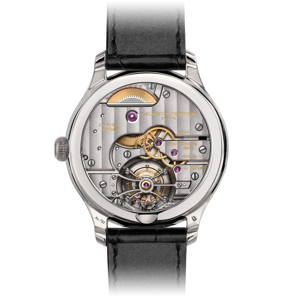 Laurent Ferrier Classic Tourbillon Black Onyx LCF001.02.AC.NO1.1 41MM, BLACK ONYX DIAL, ROMAN NUMERALS PRICE: £191,830 Description This Classic Tourbillon double balance spring with its onyx dial, is lit up by 11 white painted Roman numerals, while the "assegai-shaped" hour and minute hands and baton-type seconds hands are also coated in white. A hollowed seconds counter appears at 6 o'clock, and the matching dial creates an aesthetically harmonious overall effect. The manual finishing of this calibre is truly exceptional, as confirmed by the many interior angles and the various smooth round-polished operations. The bridge of the tourbillon carriage is decorated in the finest watchmaking traditions, and the exquisite finesse of this craftsmanship is revealed only through the sapphire case back, thereby confirming Laurent Ferrier's preference for subtlety and discretion. Specifications BRAND Laurent Ferrier COLLECTION/FAMILY Classic Tourbillon MODEL NUMBER LCF001.02.AC.NO1.1 CONDITION New MOVEMENT Manual CASE DIAMETER 41mm NUMERAL STYLE Roman DIAL COLOUR Black STRAP COLOUR Black STRAP MATERIAL Leather WATER RESISTANCE 30m PRAGNELL REFERENCE LCF00102ACNO11 ITEM NUMBER 2310328 ——— Pragnell Registered office: 5-7 Wood Street, Stratford-upon-Avon CV37 6JA, Warwickshire UK
