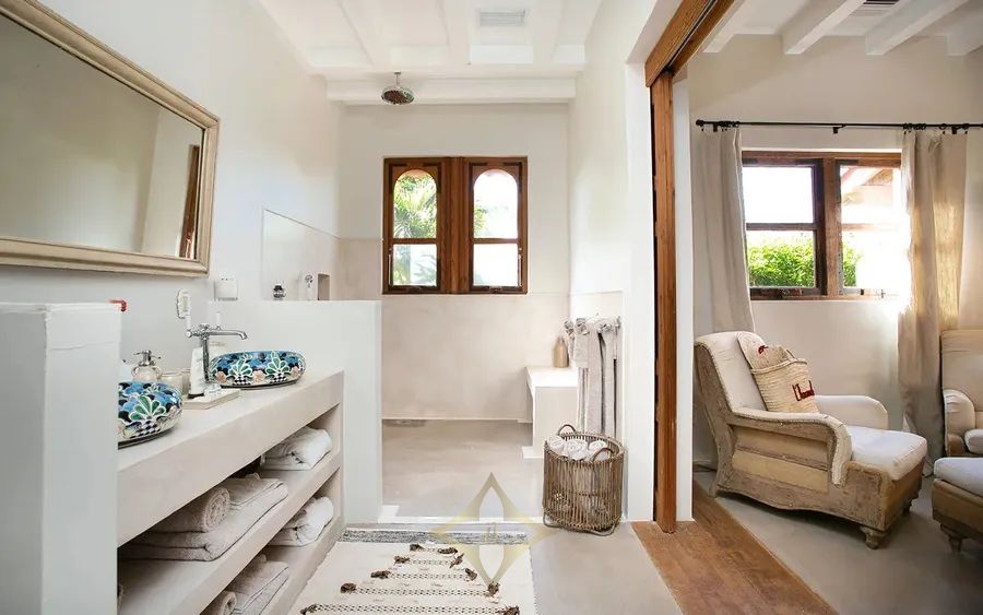 Lower level: En-suite bathroom with walk-in rain shower, double vanity, air conditioning, seating area, opens onto private terrace and garden.