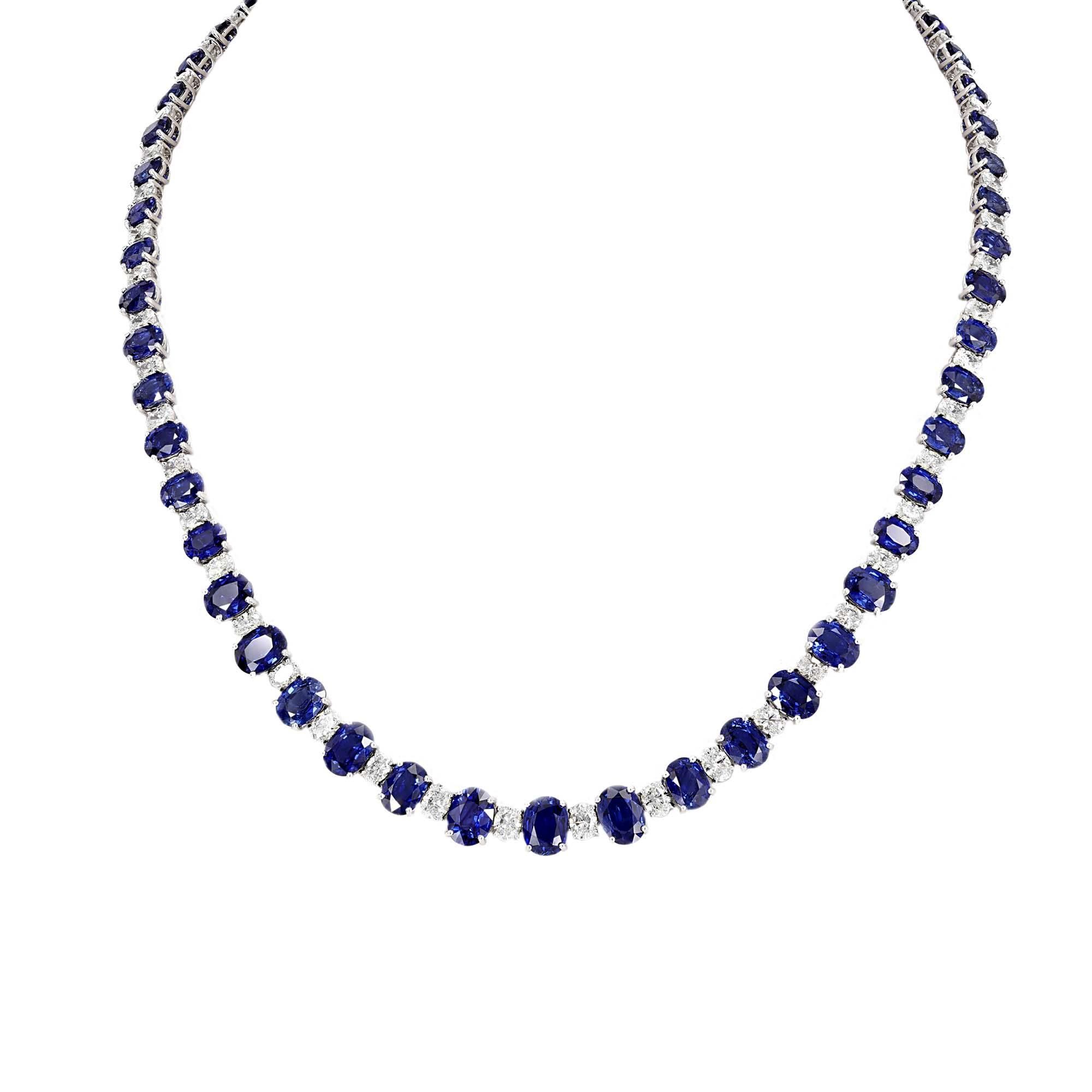 London Collection white gold alternating oval diamond and blue sapphire necklace. 18k white gold necklace features alternating blue sapphires and diamonds. Total diamond weight 8.90cts, total blue sapphire weight 48.54cts.