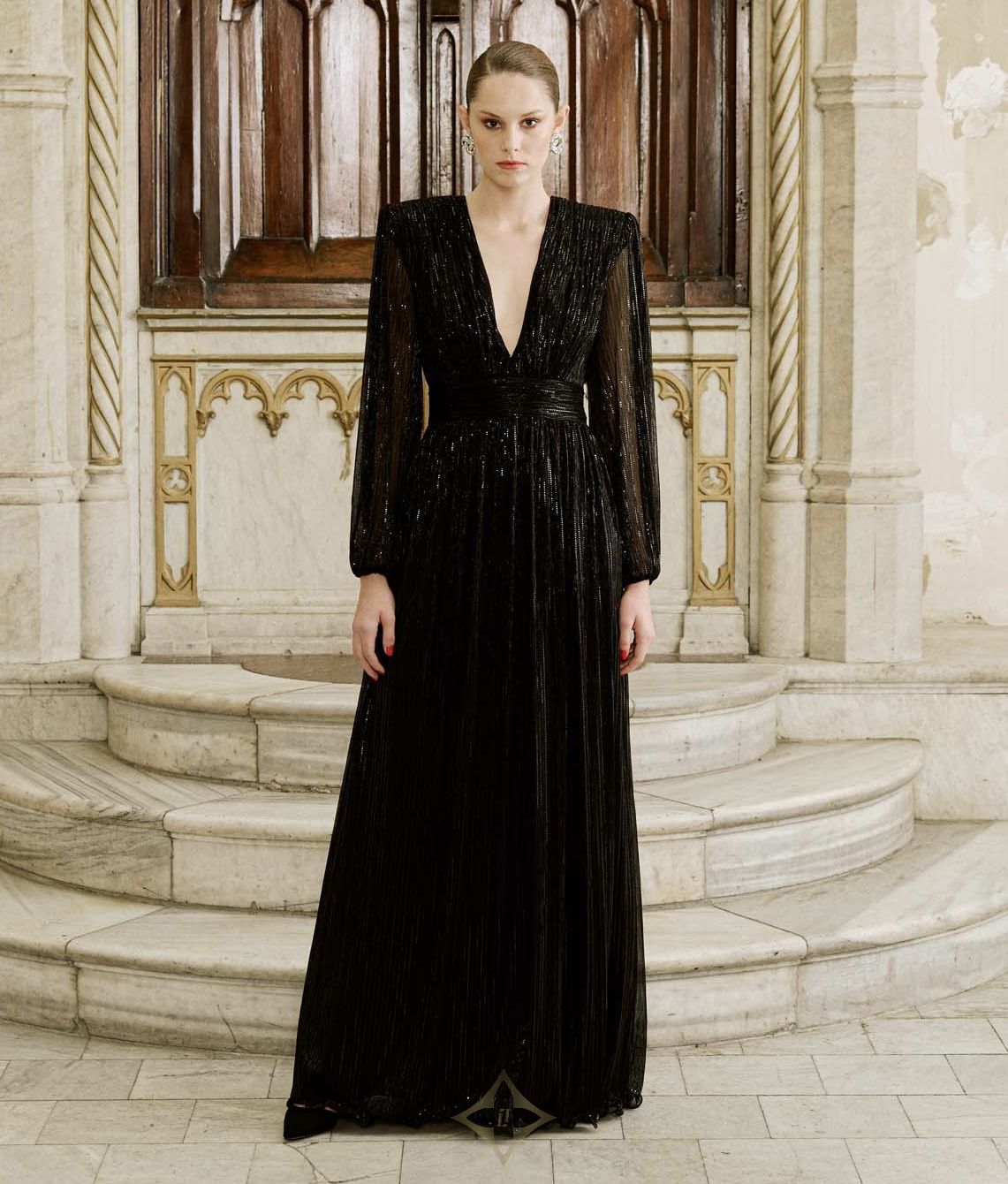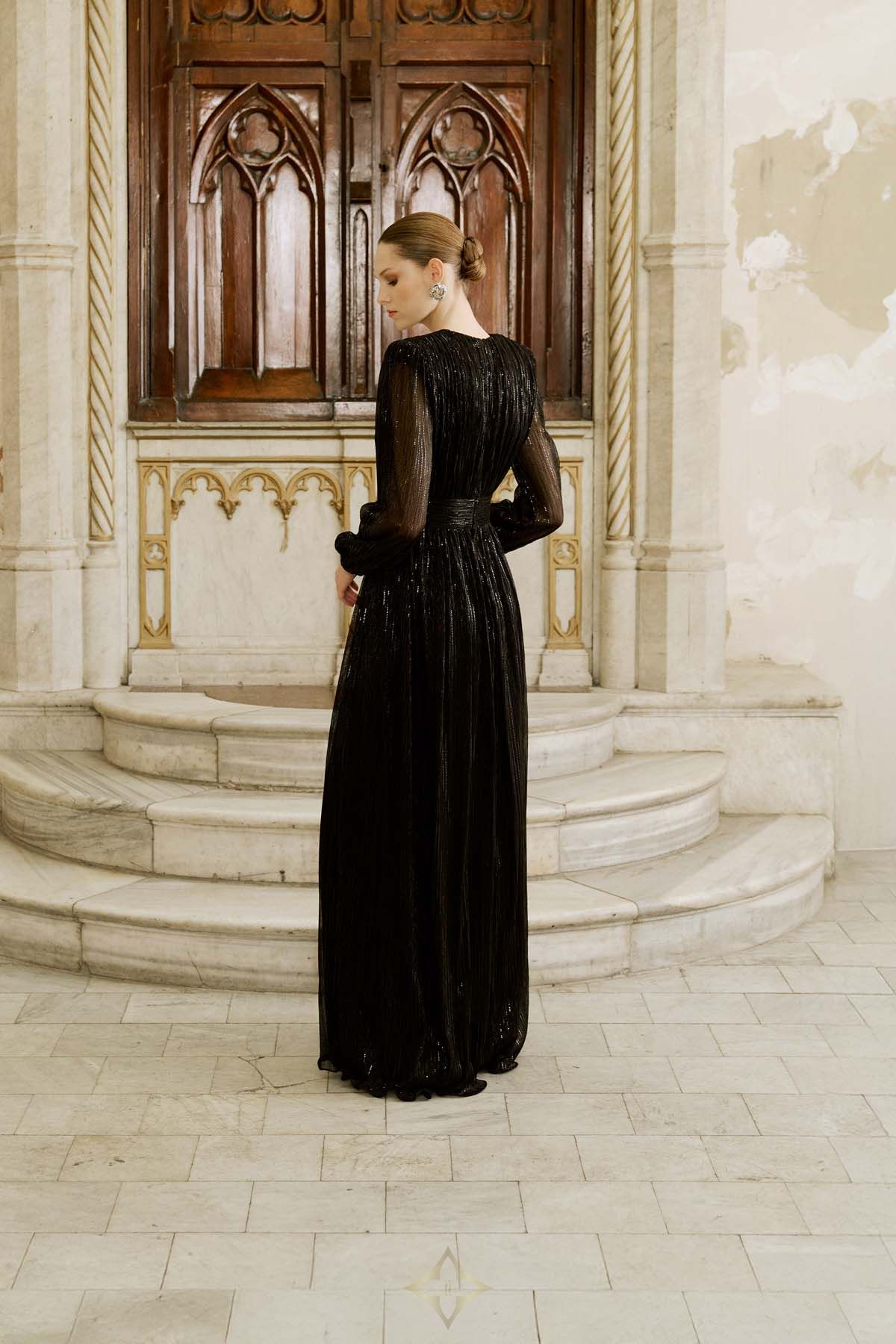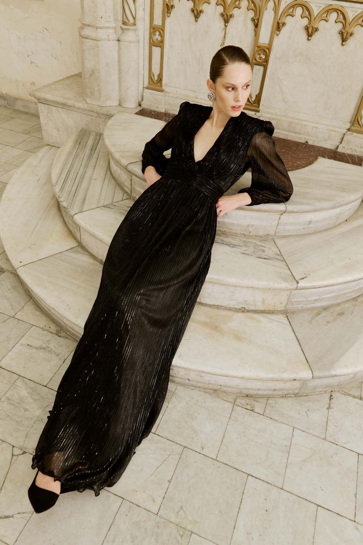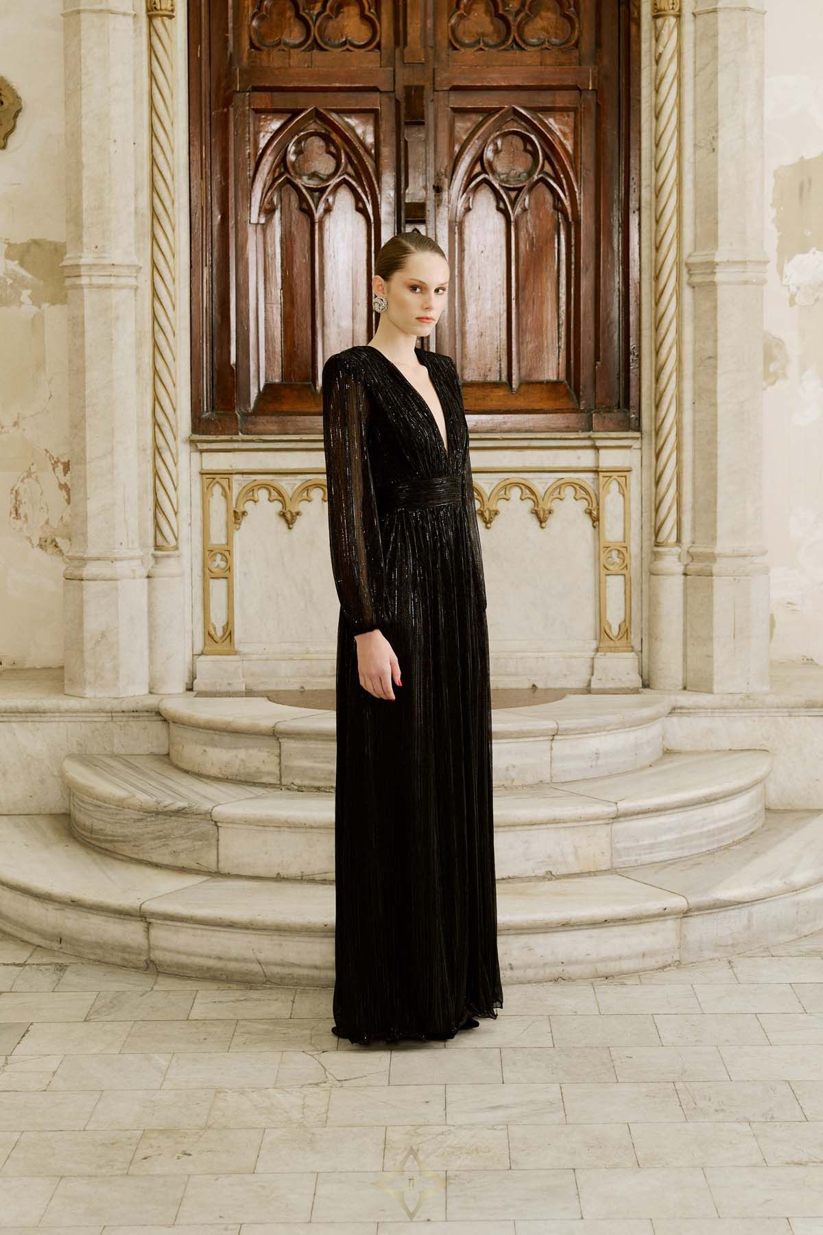Designed with shimmering thread details, this floor-length gown features a plunging V-neckline and a ruched waistband for a flattering silhouette. The long sheer sleeves add elegance, while the flowing skirt enhances the sophisticated look. An ideal choice for evening events and special occasions.The model is 177 cm tall and wears a size 36 (EU).