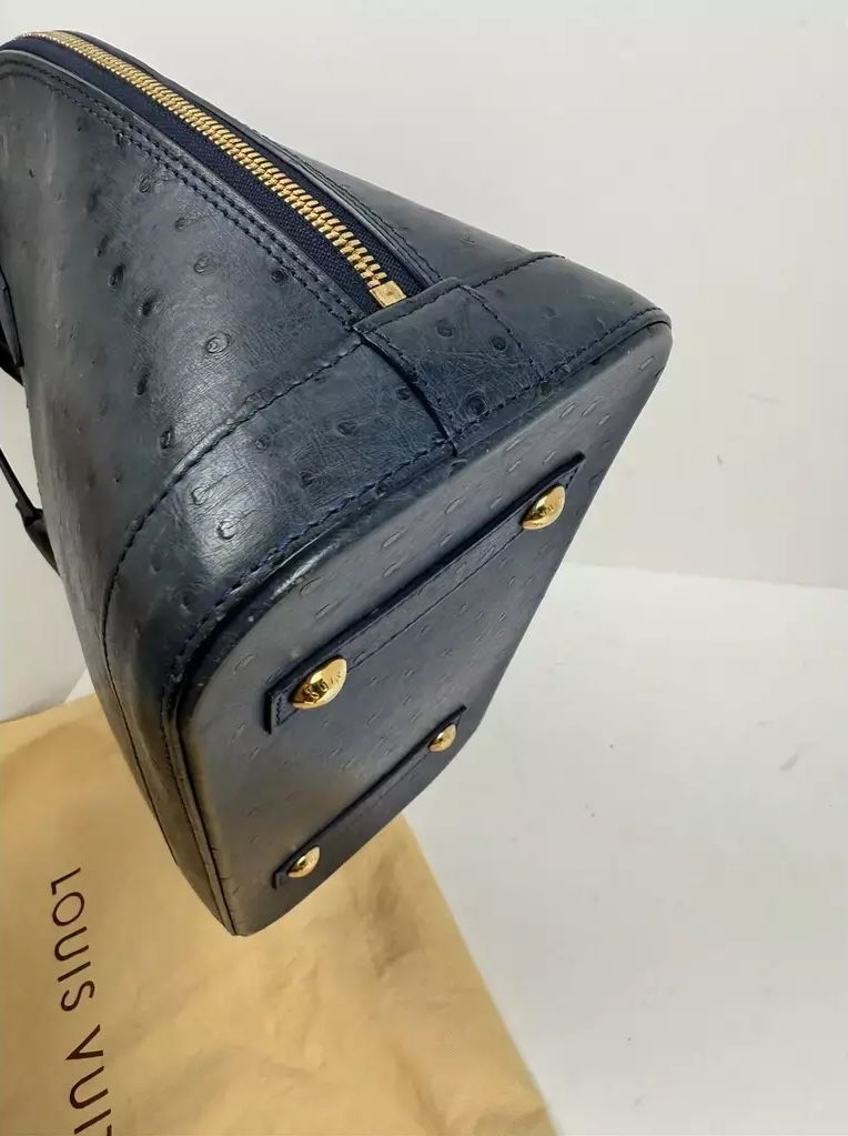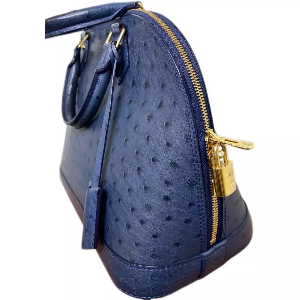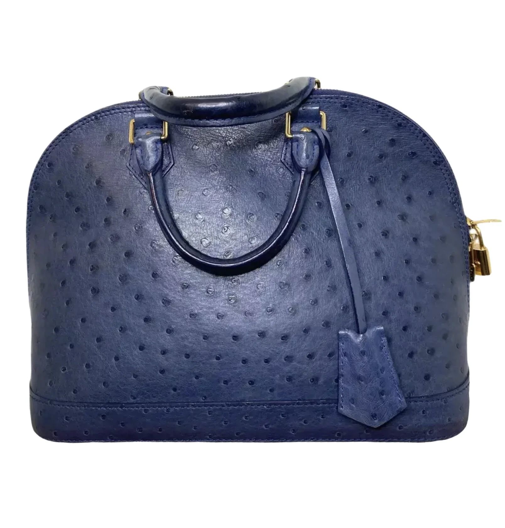 Exceptionally rare and undeniably luxurious, this Louis Vuitton Alma PM is crafted from genuine exotic ostrich leather, showcasing the distinctive quill texture that defines one of the most prestigious leathers in luxury craftsmanship. The rich blue tone enhances the natural pattern of the ostrich skin, creating depth, elegance, and a striking visual presence.