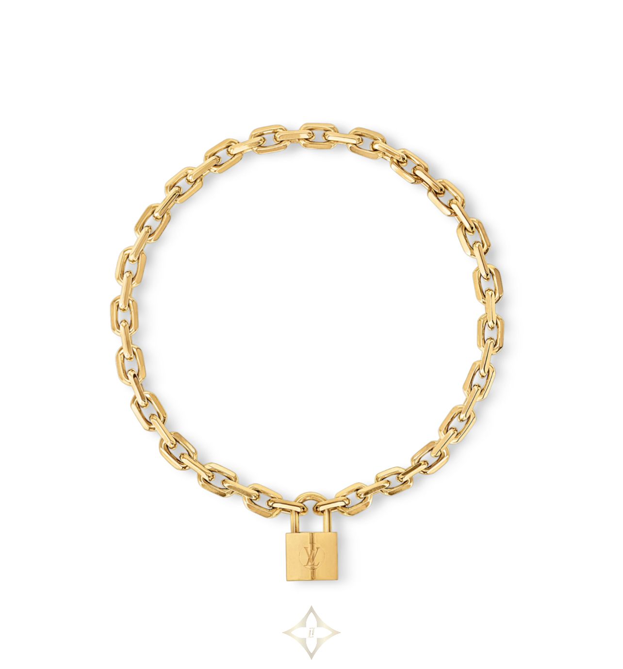 This piece features a large padlock pendant meticulously engraved with the LV Initials, suspended from a thick link chain. The pendant is opened and closed by pushing the lock.
