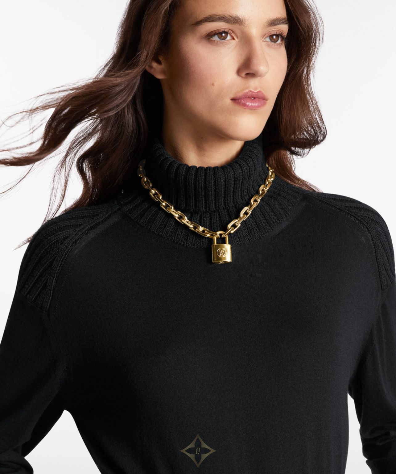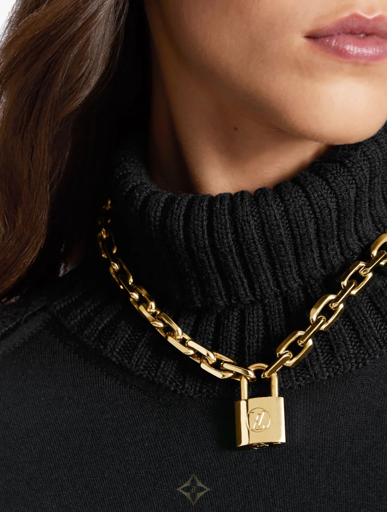 Thick gold chain design, LV lock, can embellish the style.