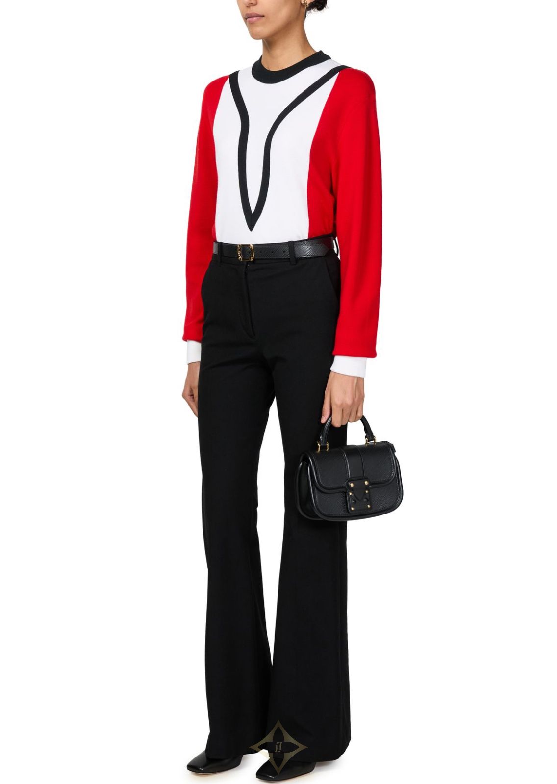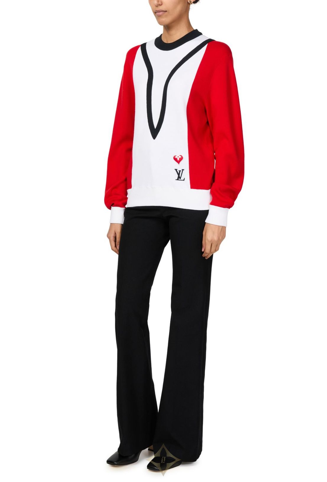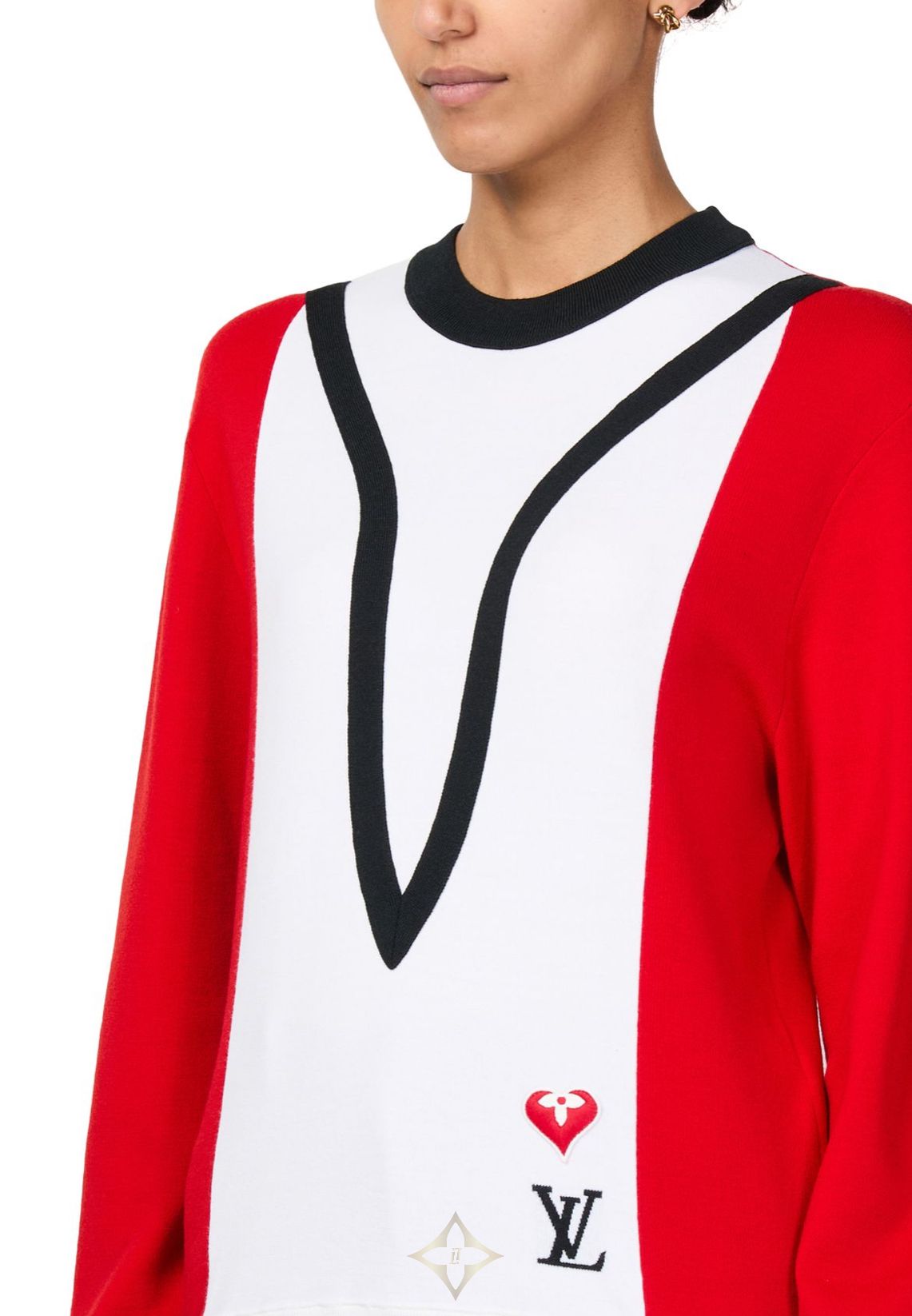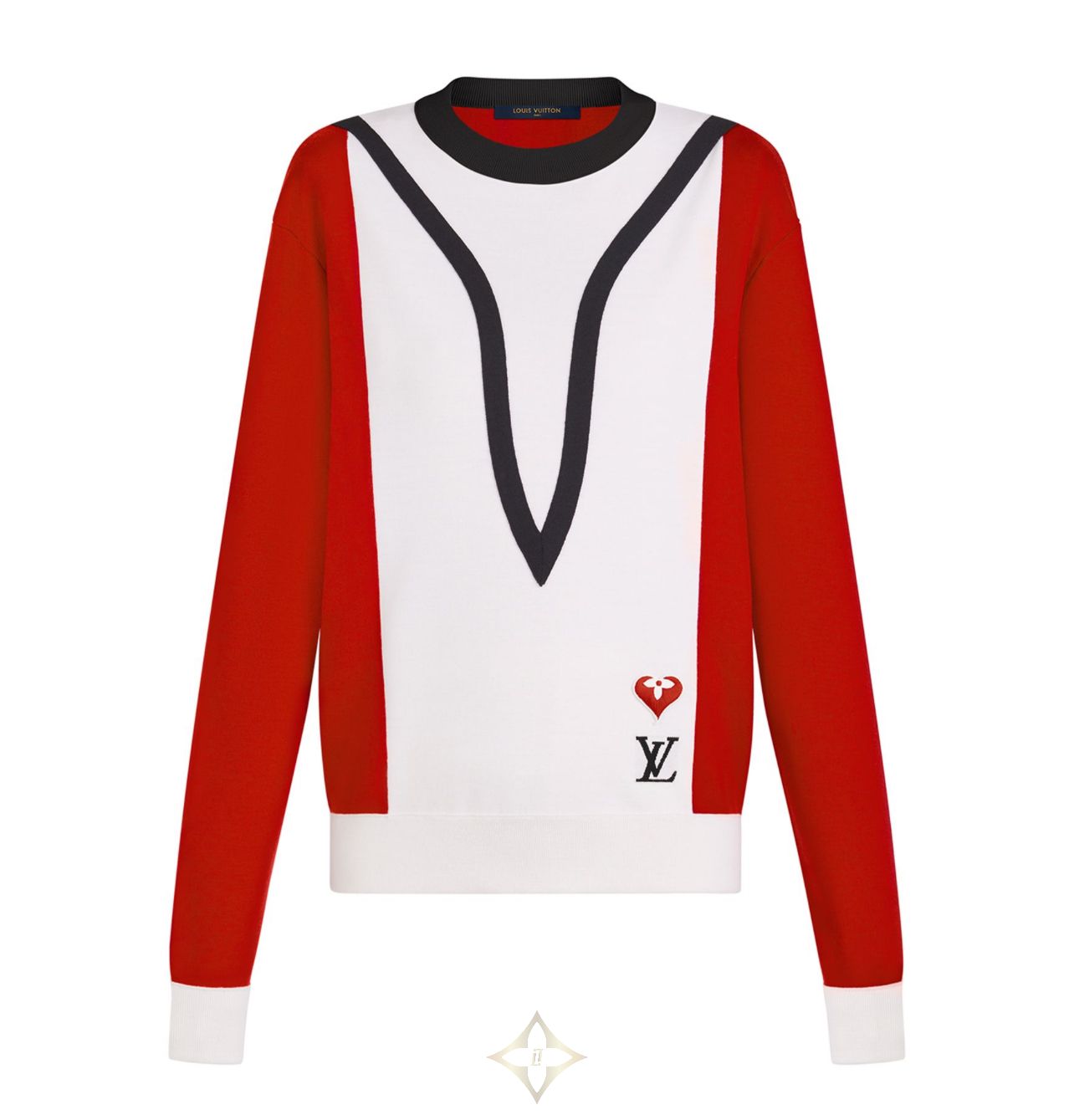 Vibrant color blocking and graphic details give this long-sleeved sweater a cozy, old school feel. Crafted from a soft wool-blend knit with ribbed trimming for easy, comfortable wear. The front is signed with LV Initials and a Monogram Flower heart patch, a subtle reference to the whimsical Game On capsule inspired by playing cards.