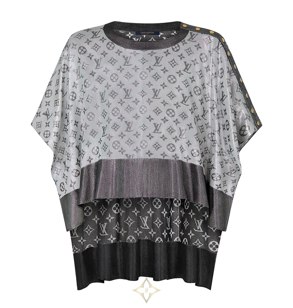 This asymmetrical cape stands out as one of the new silhouettes in the collection’s spirited silver offering. A fluid, shiny Monogram jacquard silk-blend knit drapes gracefully over the frame, with a cropped front and exposed sides. Louis Vuitton-engraved snap buttons strike a contrast down one shoulder. A versatile summer style.