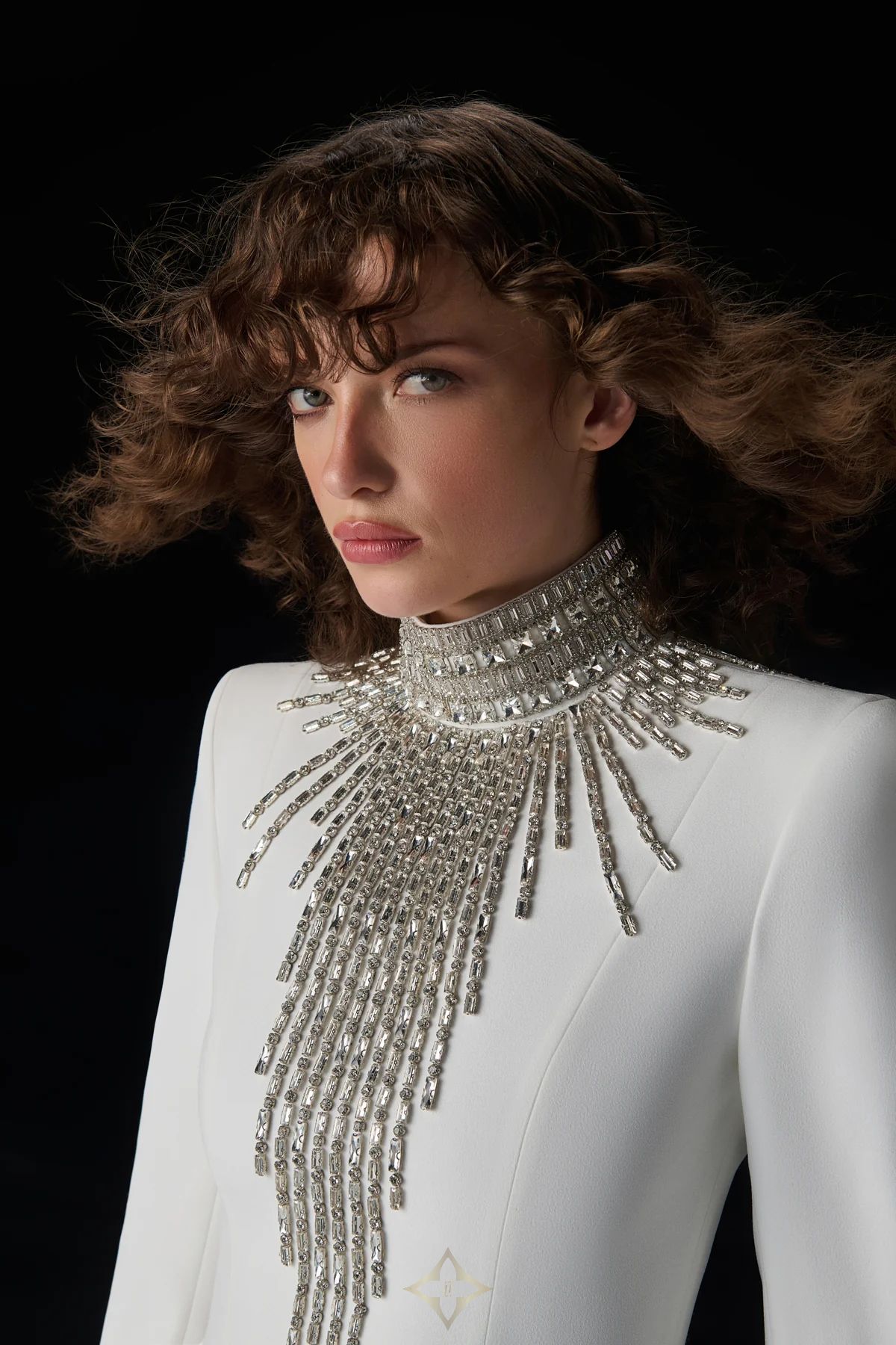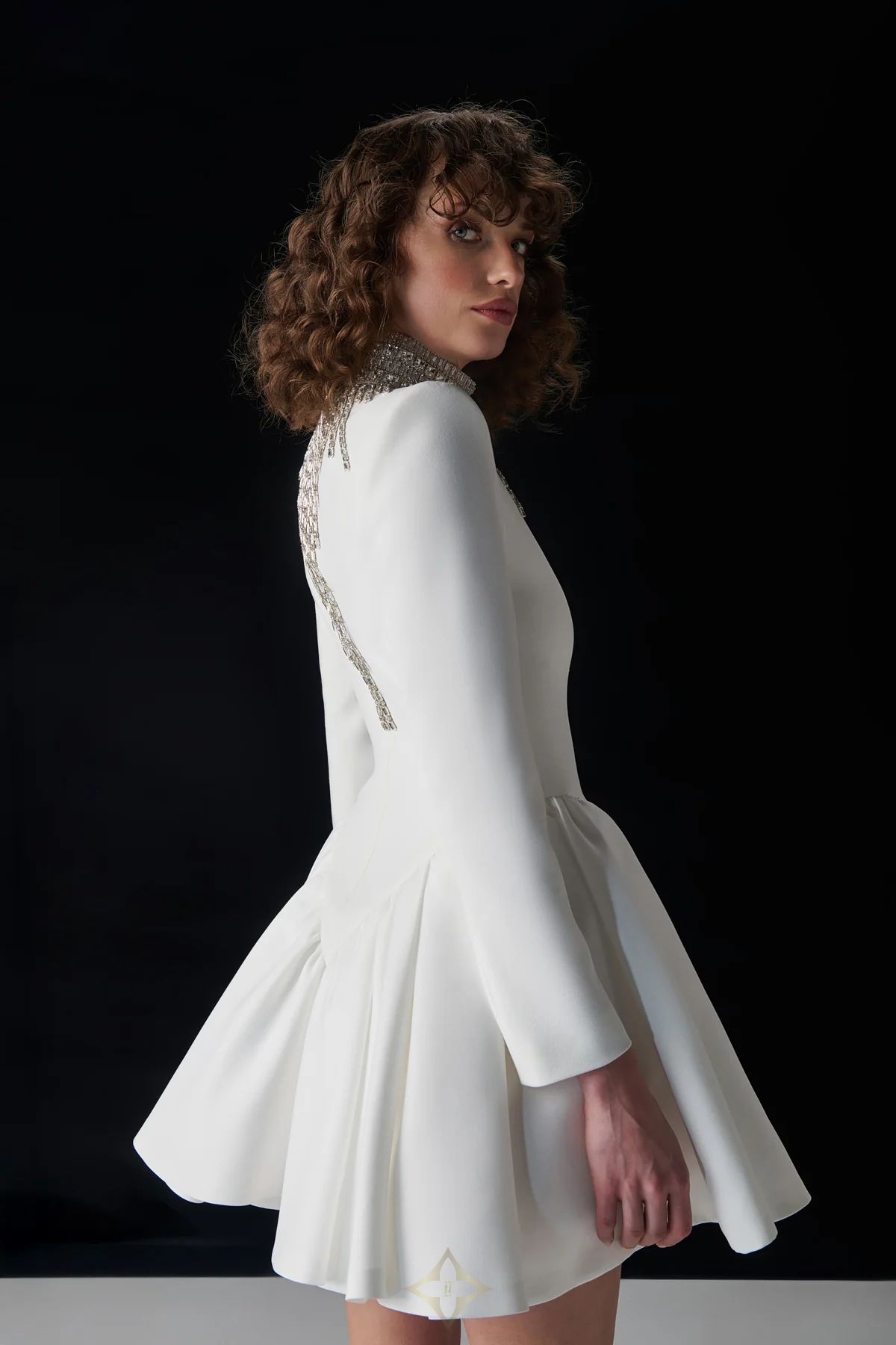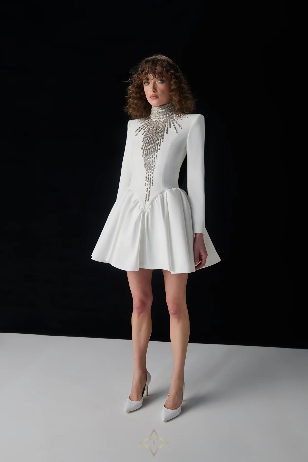 This long-sleeved gown is crafted with a crepe bodice and satin skirt, featuring an embellished high neckline with cascading crystal details for a luxurious touch. Structured padded shoulders add a powerful silhouette, while the fitted bodice transitions elegantly into a voluminous satin skirt from the waist. A concealed zipper at the back ensures a seamless finish. Perfect for galas, receptions, and special evening events. The model is 177 cm tall and is wearing a size 36 (EU).