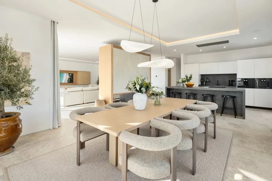 Inside, the villa showcases open-plan living with a soothing neutral palette, natural textures, and expansive glass doors that flood the interiors with light. The designer kitchen features top-of-the-line appliances, while the five luxurious bedrooms include a breathtaking master suite with private terrace, walk-in wardrobe, and spa-like bathroom.
