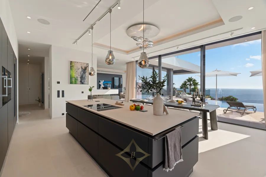 Dream frontline villa with stunning sea views for sale in Cala Llamp, exclusive area of Port Andratx on the southwest coast of Mallorca. Perched high above Cala Llamp, this property is a newly built luxury villa offering breathtaking panoramic views over the bay, La Mola, and the open sea beyond. With 691 m² of living space on a 1,038 m² plot, this architectural masterpiece features 6 bedrooms, 6 underground parking spaces, and stunning design that blends modern lines with natural Mallorcan stone. The villa’s elevated, southwest-facing position ensures sunshine all day and unforgettable sunsets, with views stretching to Ibiza. Inside, premium finishes include a Leicht kitchen with Gaggenau appliances, Dornbracht bathrooms, floor-to-ceiling wardrobes, and natural stone and parquet flooring.