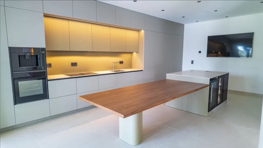 The ground floor is designed as a bright open-plan living space, seamlessly integrating the lounge, dining area and contemporary kitchen. Floor-to-ceiling Reynaers windows flood the interior with natural light while providing excellent thermal and acoustic insulation. A marble fireplace adds warmth and sophistication. The fully fitted kitchen is equipped with premium Neff appliances, a wine cooler and an integrated extractor hob, combining sleek design with high functionality.