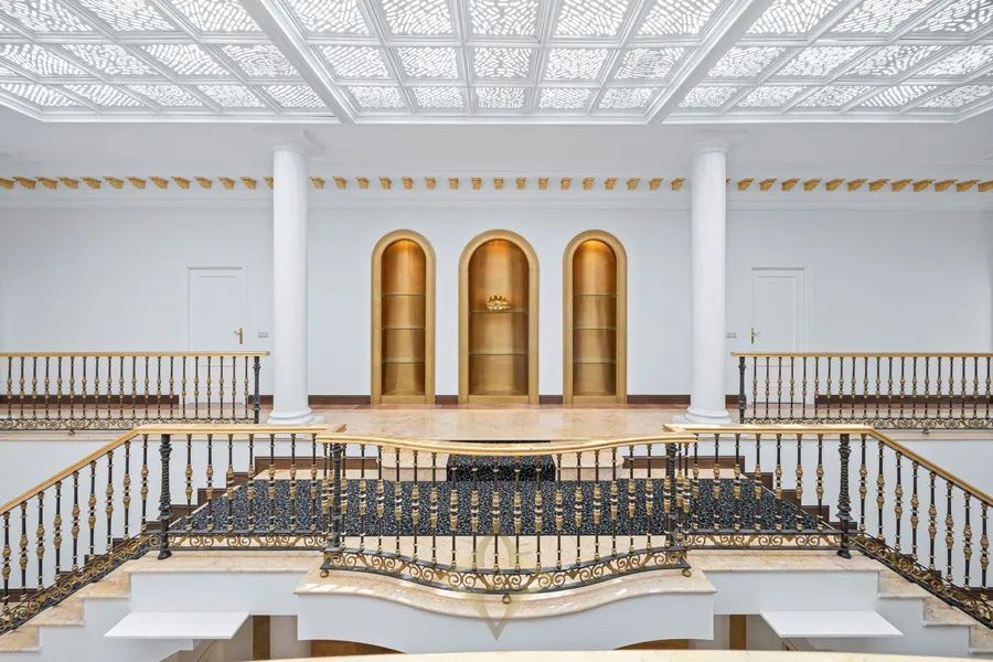 From the moment you arrive, the home makes a statement. Grand Doric columns frame the entrance, and ivy-covered walls soften the architecture, giving it a quiet, almost cinematic beauty. The double-height entryway, with its sweeping twin staircases and patterned marble floor, sets the tone: formal but warm, impressive yet inviting.